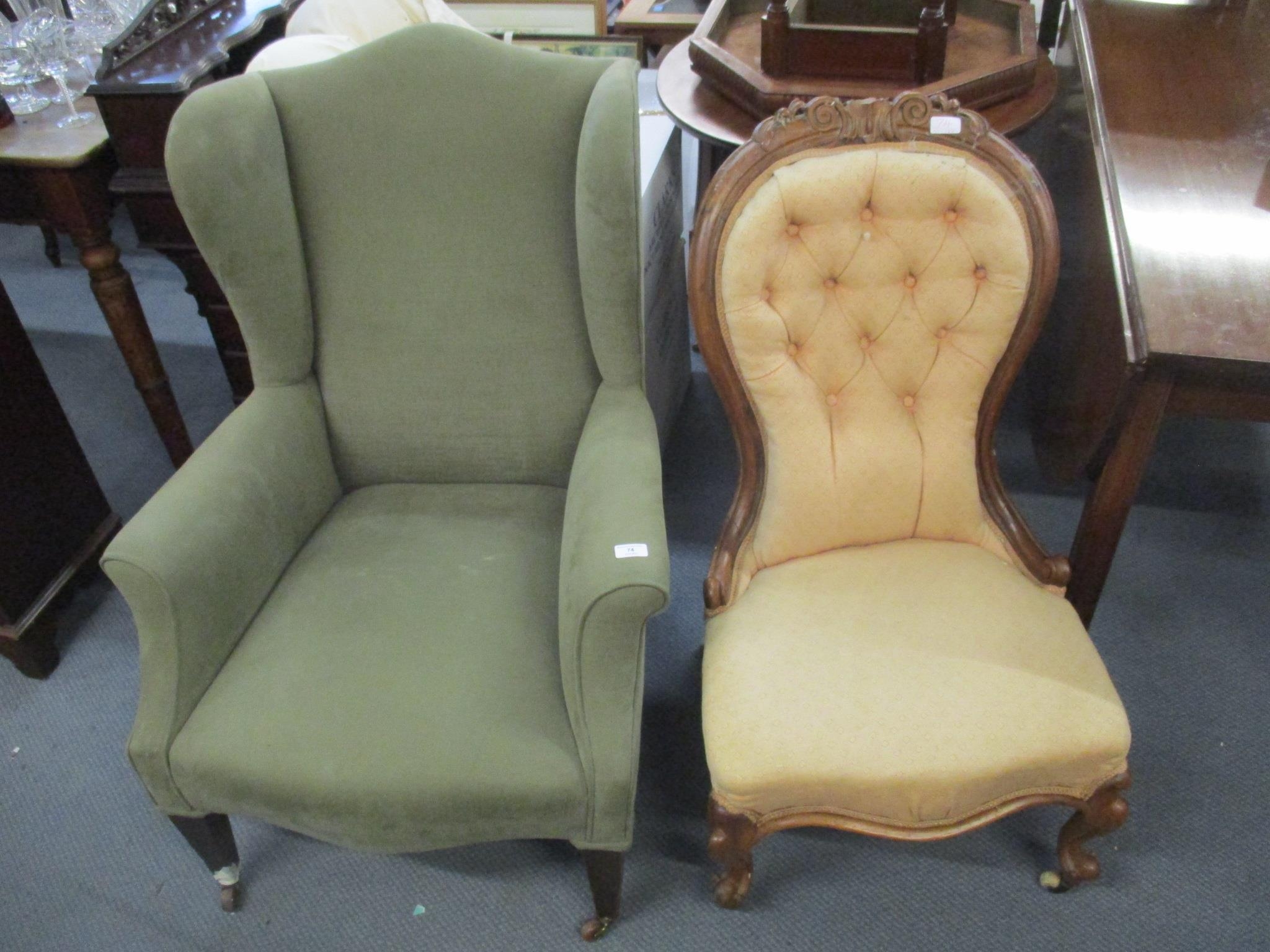 A late 19th/early 20th century wingback armchair together with a Victorian walnut spoon back salon chairLocation: A2M