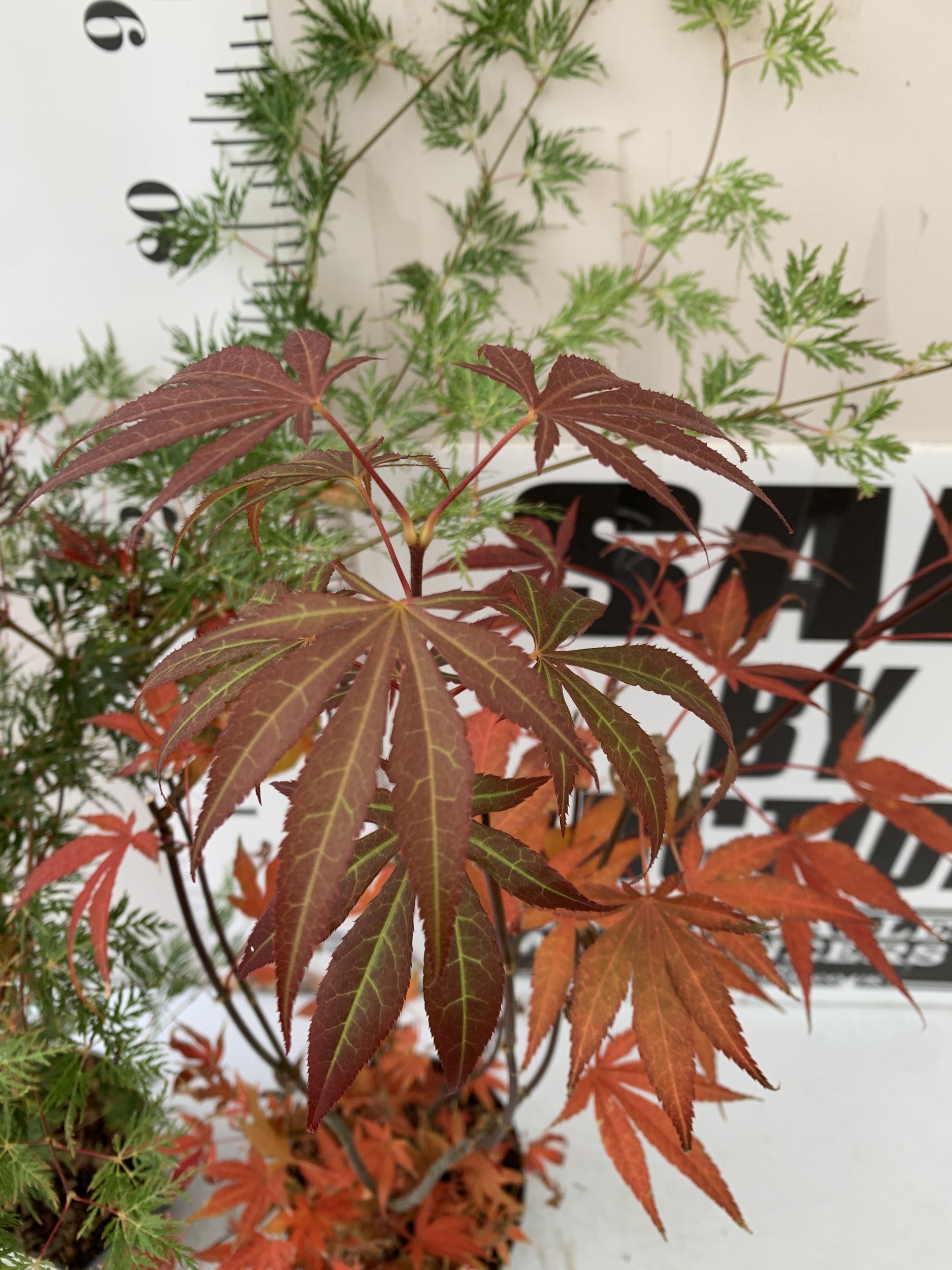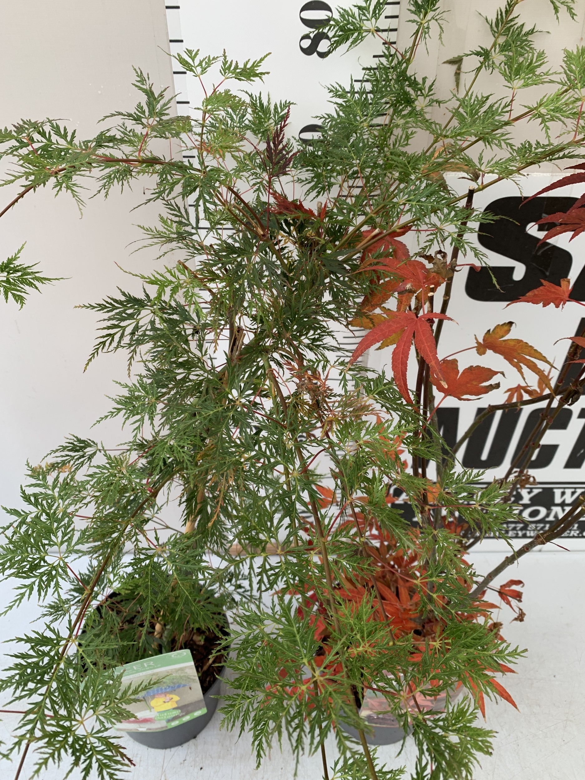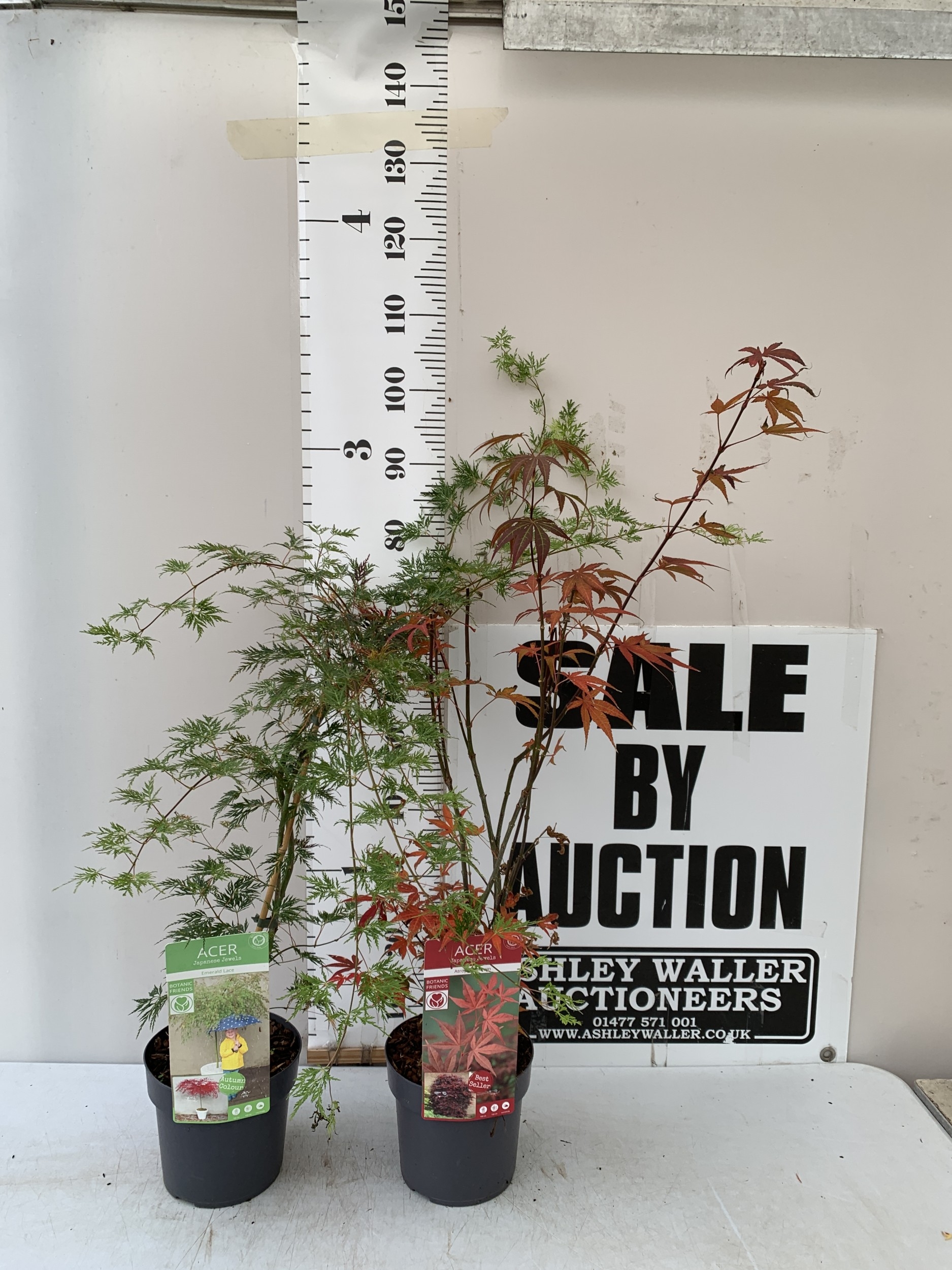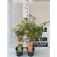 TWO ACER PALMATUMS - ONE 'EMERALD LACE' AND ONE 'ATROPURPUREUM' IN 3 LTR POTS. APPROX 110CM TALL, TO BE SOLD FOR THE TWO