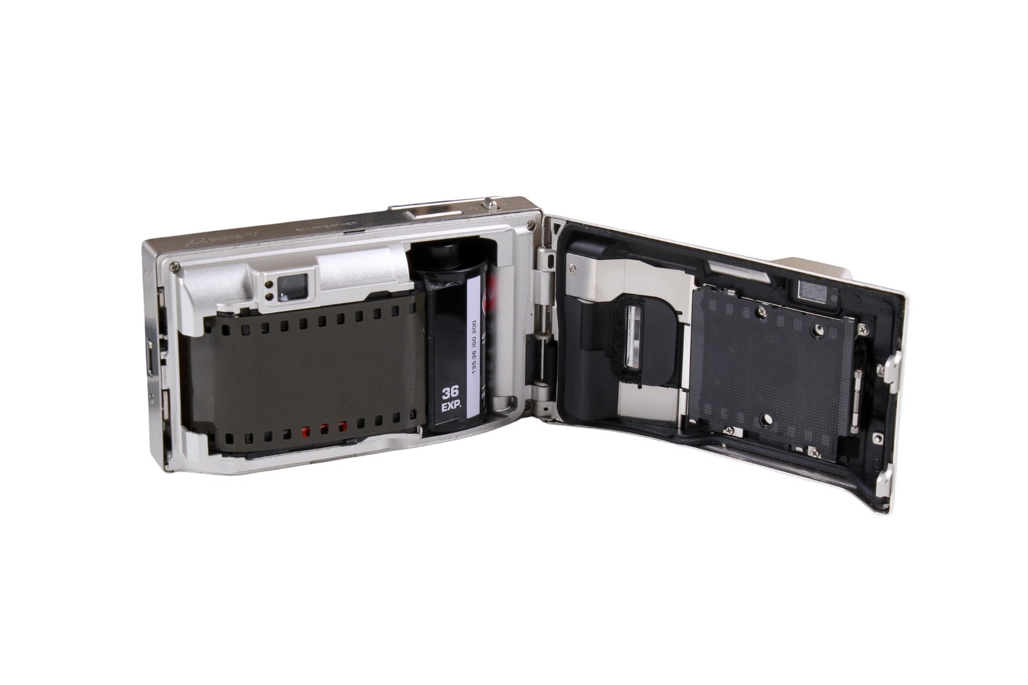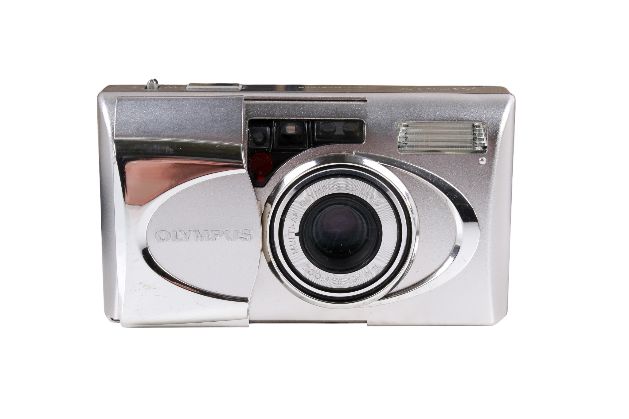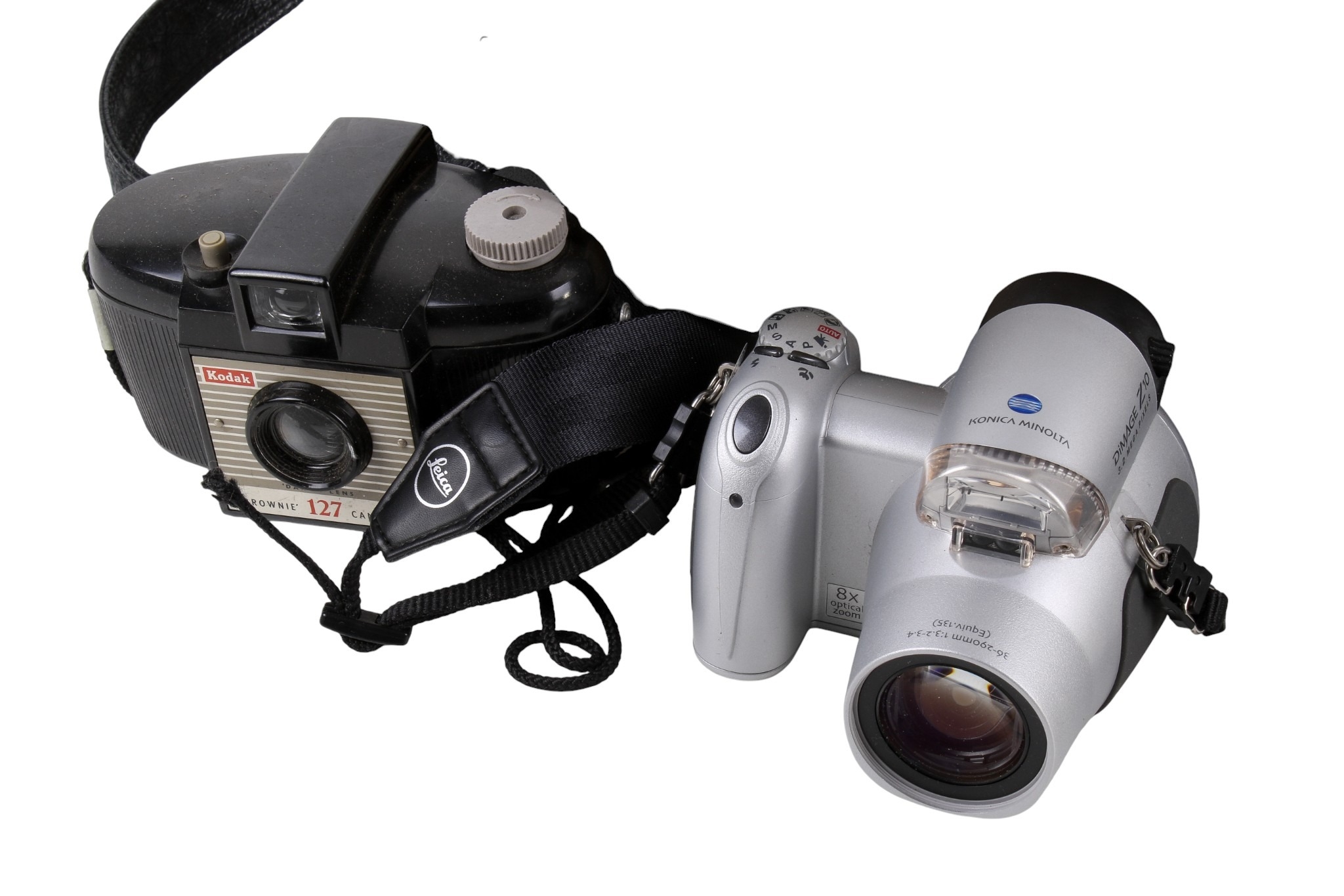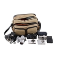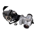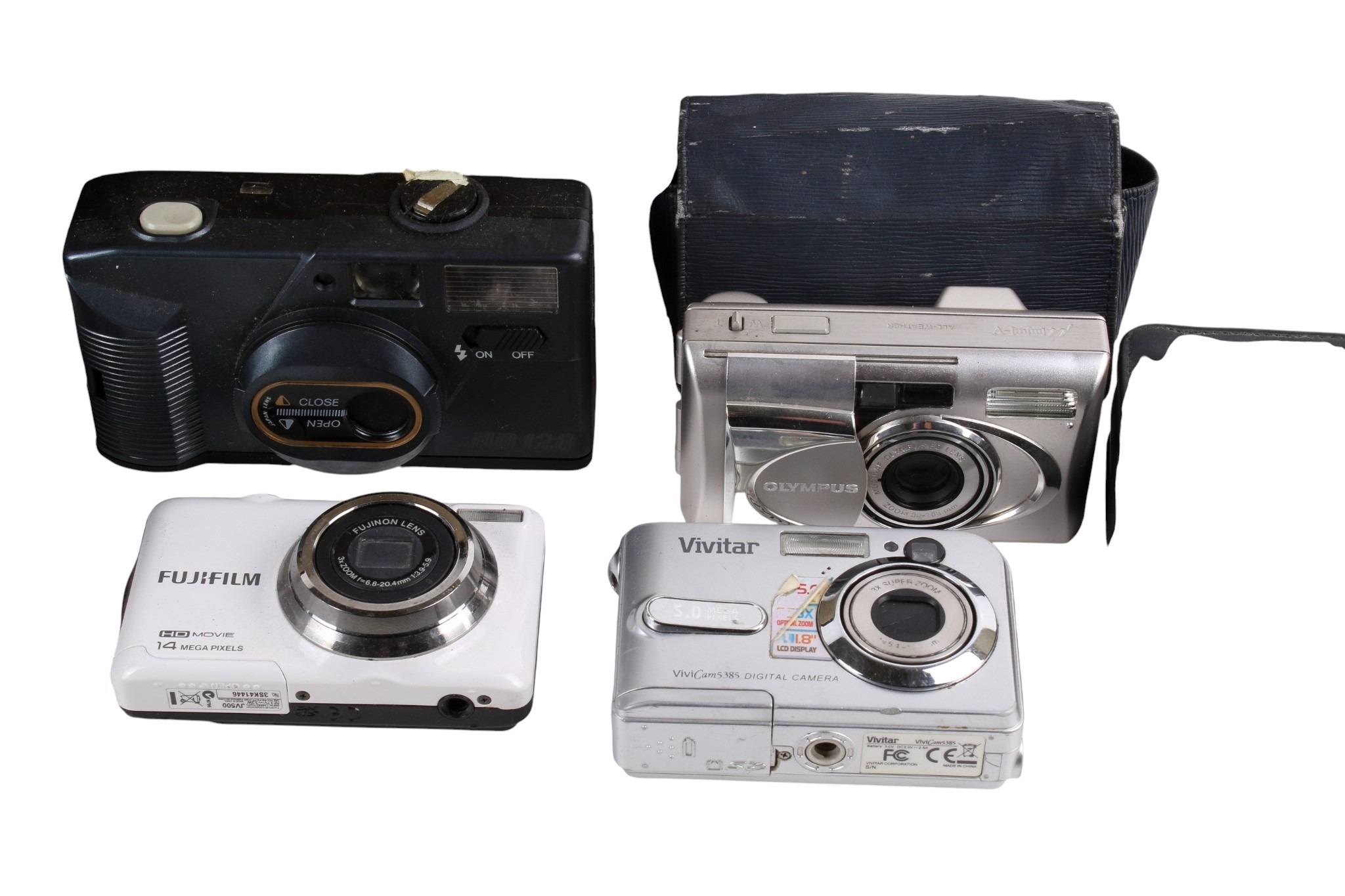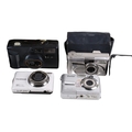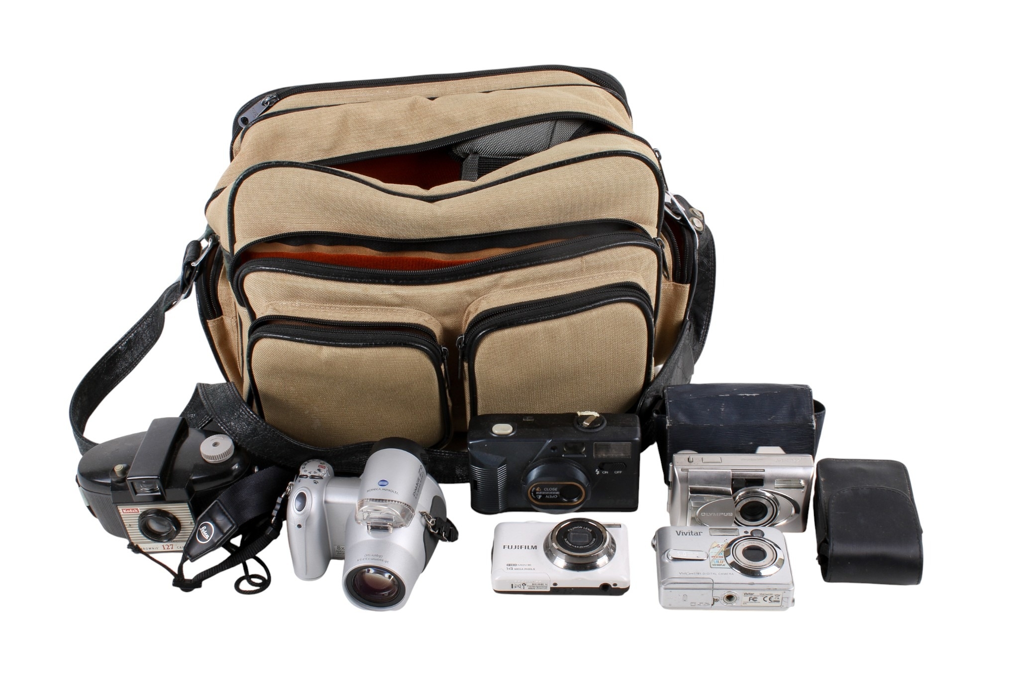 A group of assorted vintage cameras in a bag. Including an Olympus U(mju:)-V digital camera, etc.