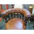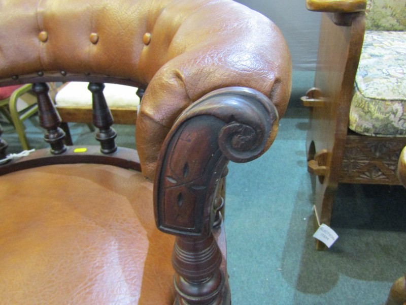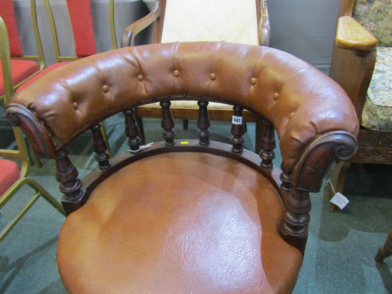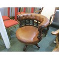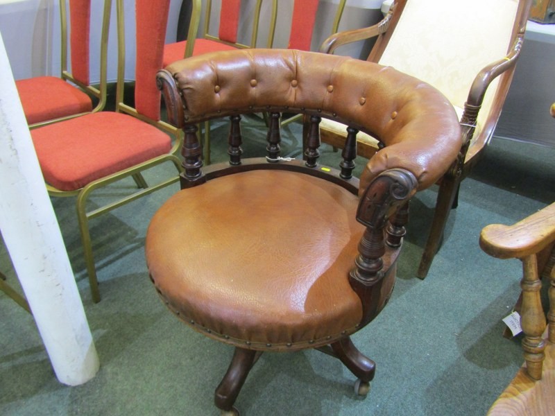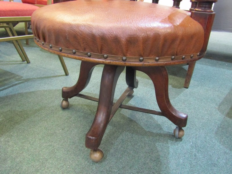 VICTORIAN OFFICE CHAIR, late 19th Century, circa 1885 revolving office chair of possibly red walnut frame on revolving base, brown leather upholstery, 77cm height