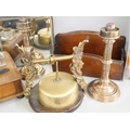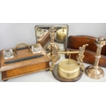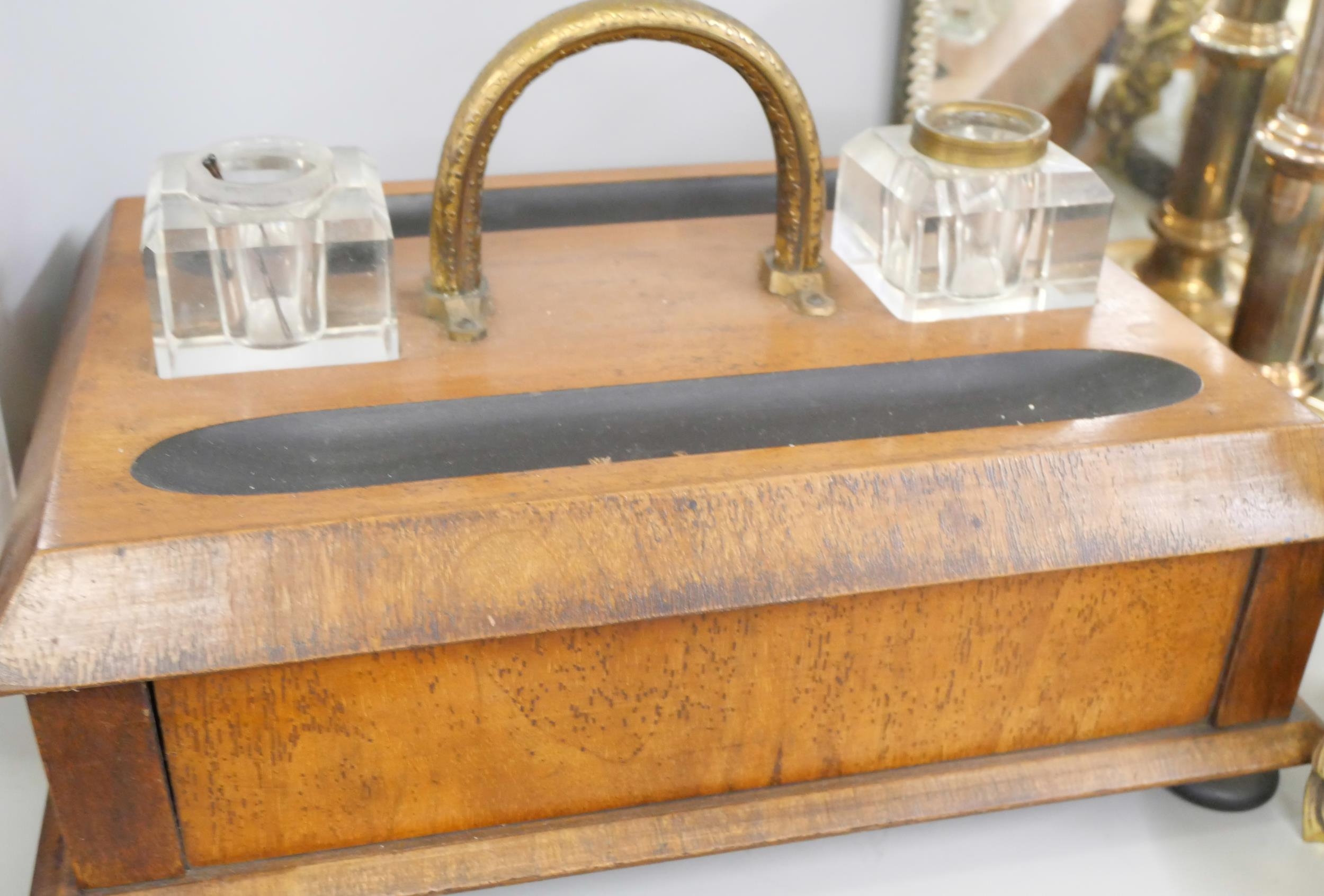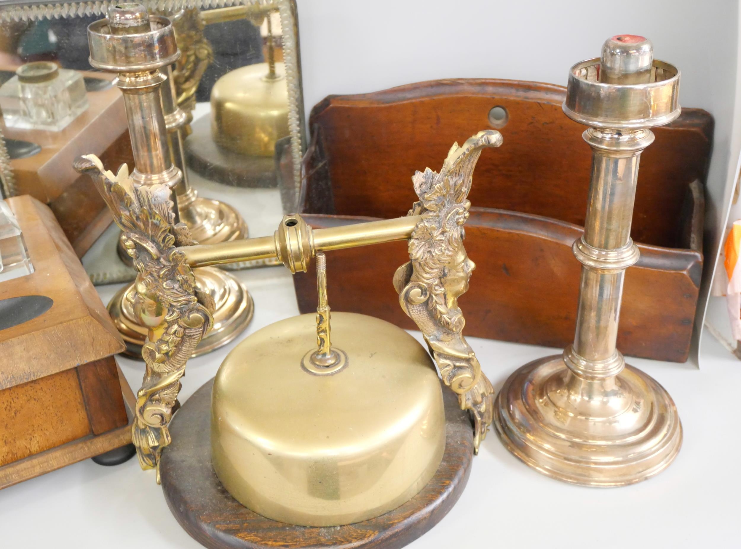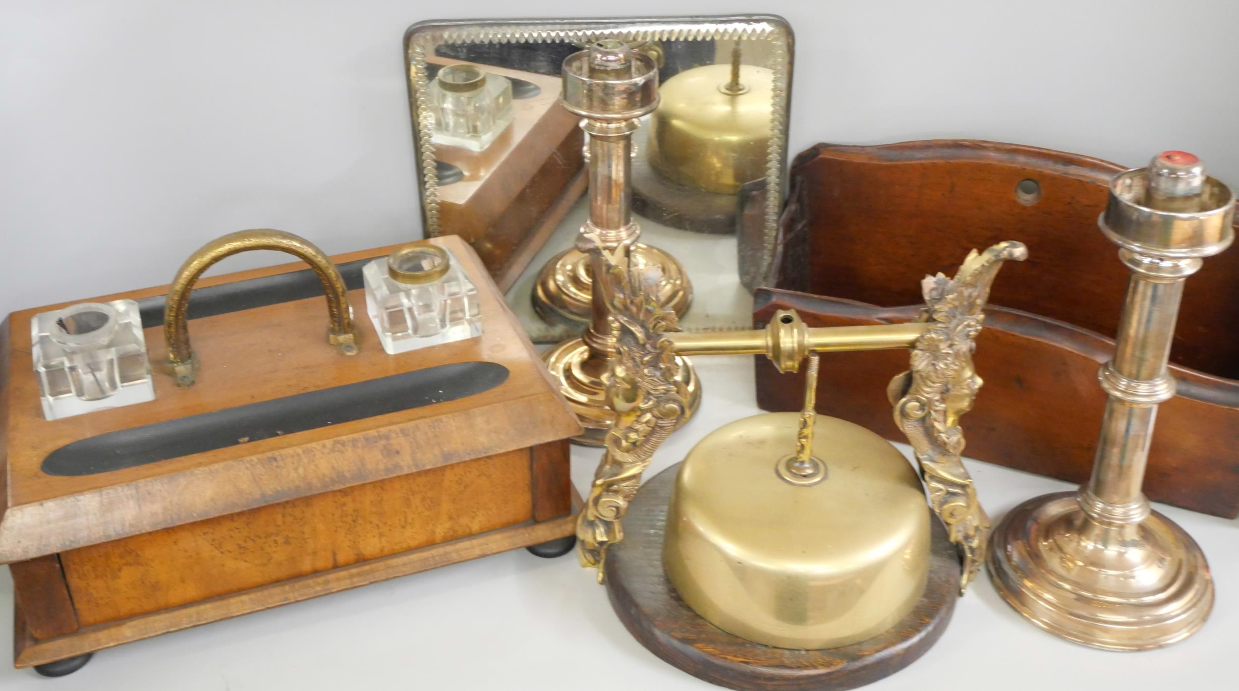An Edwardian mirrored tray, a mahogany letter rack, desk stand, pair of candlesticks and a table gong **PLEASE NOTE THIS LOT IS NOT ELIGIBLE FOR IN-HOUSE POSTING AND PACKING**