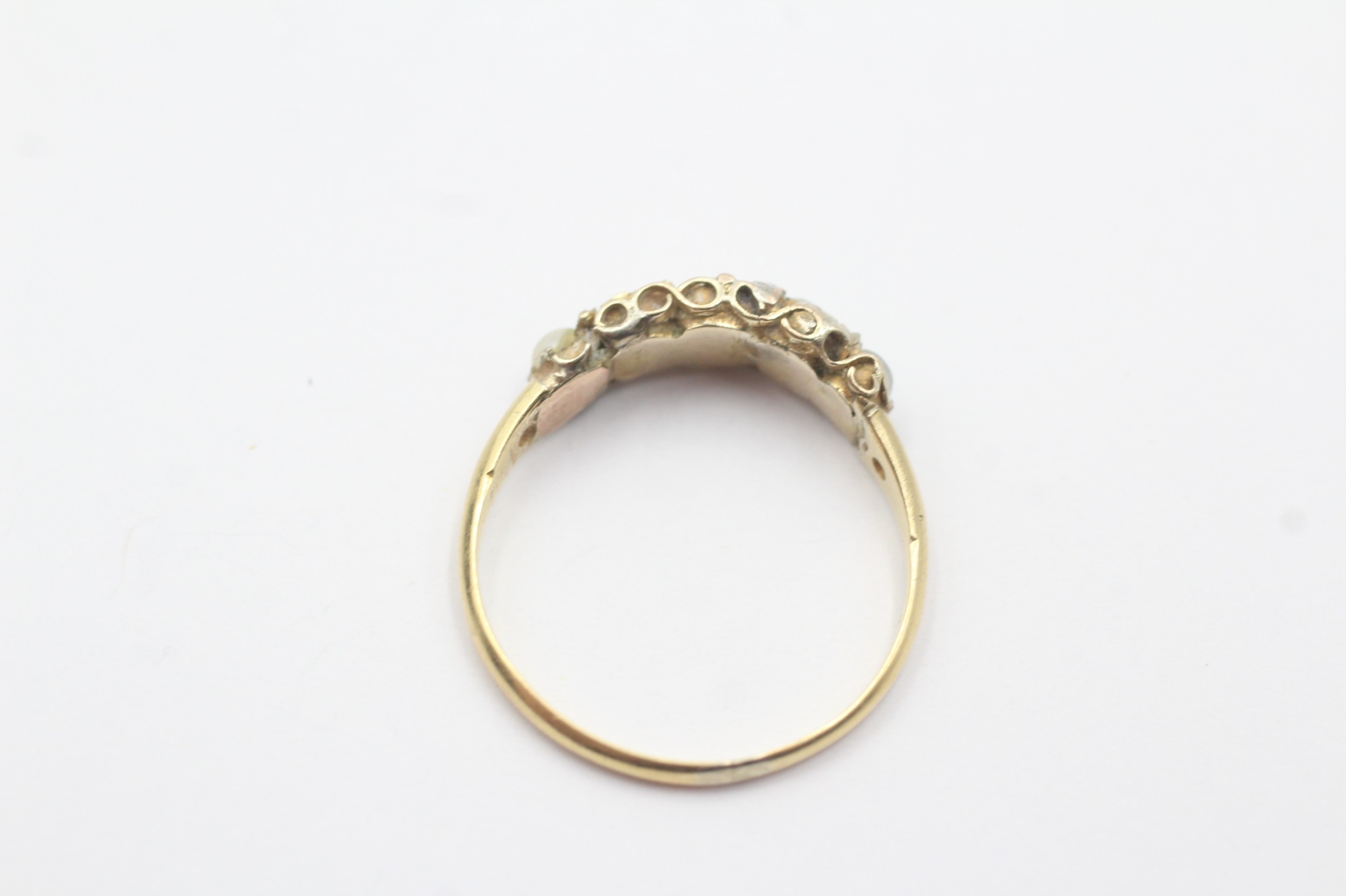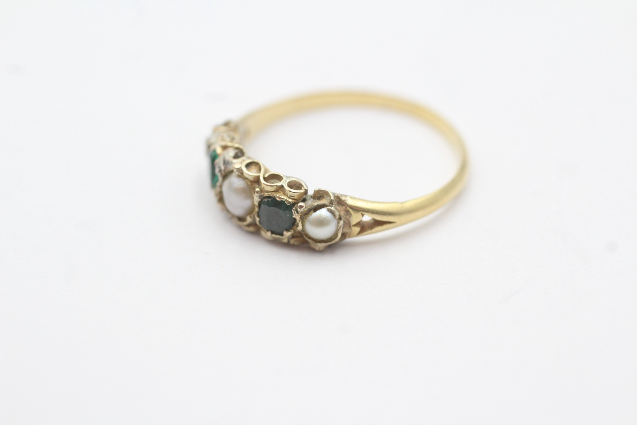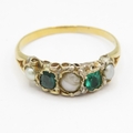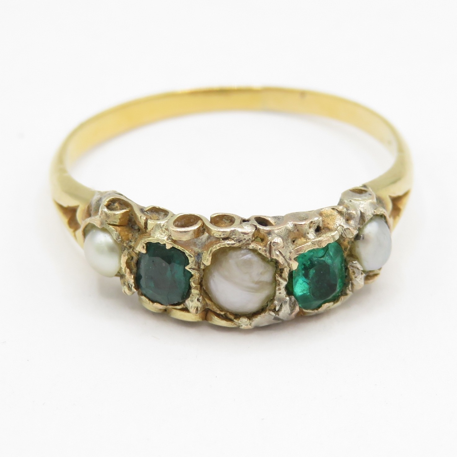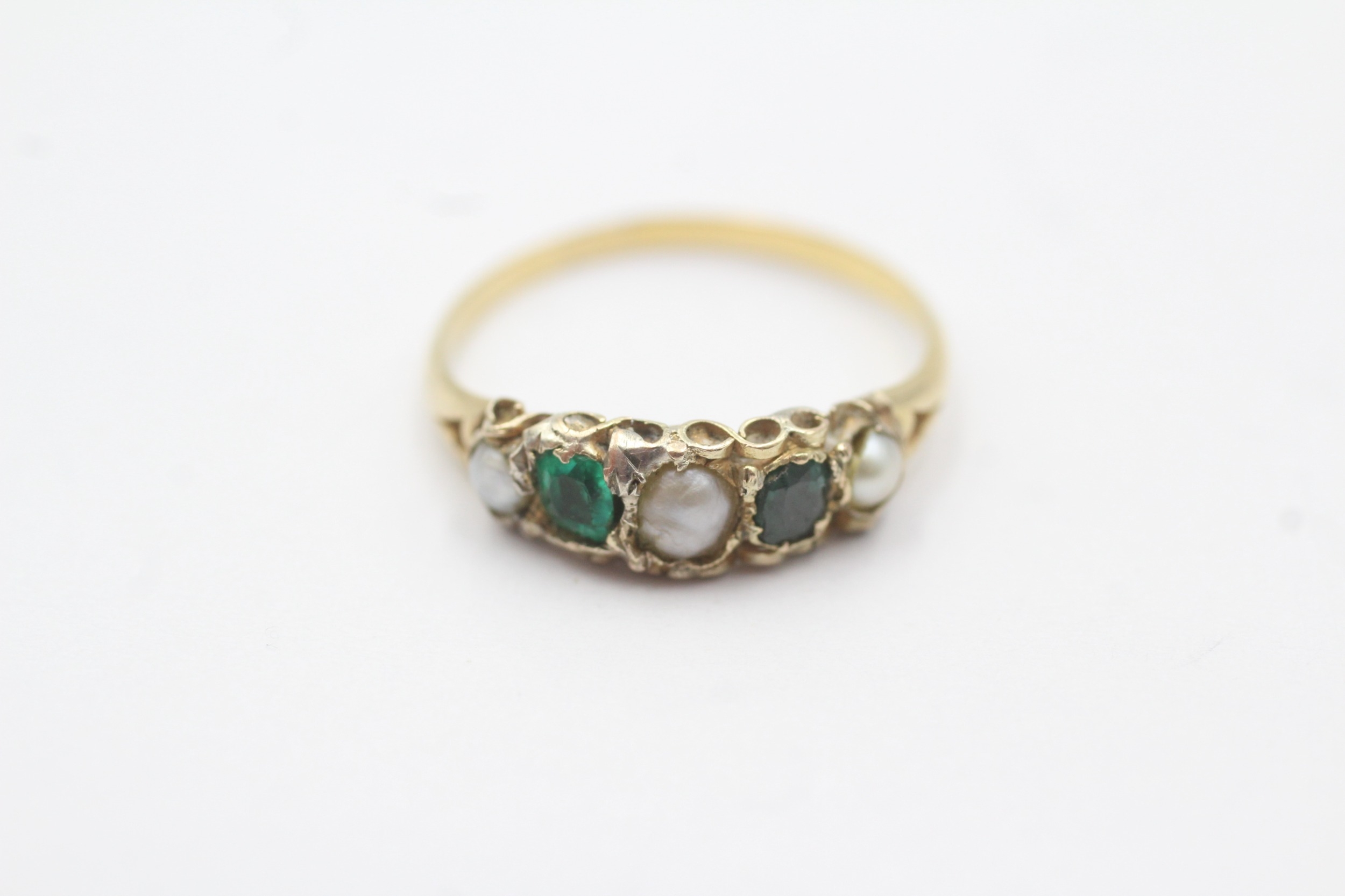 18ct band and low ct top ring with emeralds and cultured pearls (1.5g) Size M