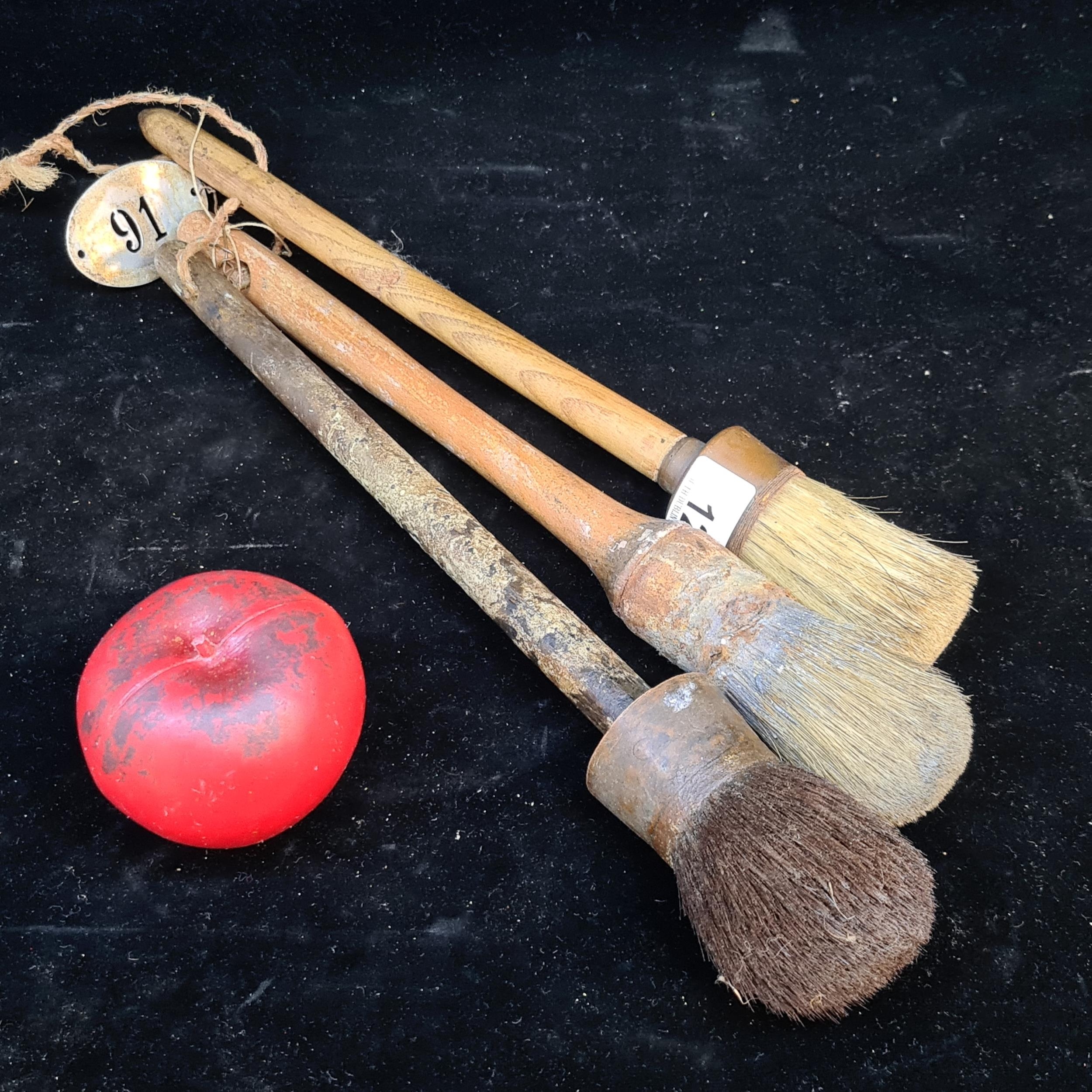 Three wonderful early 20th century large French paint brushes, made from natural materials; wooden handles, animals hairs retained with copper mounts. Also has a number tag of 91