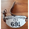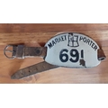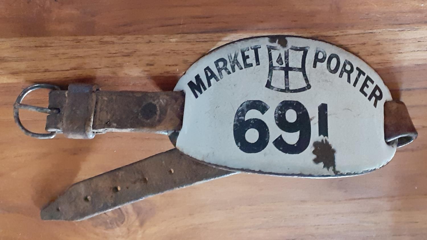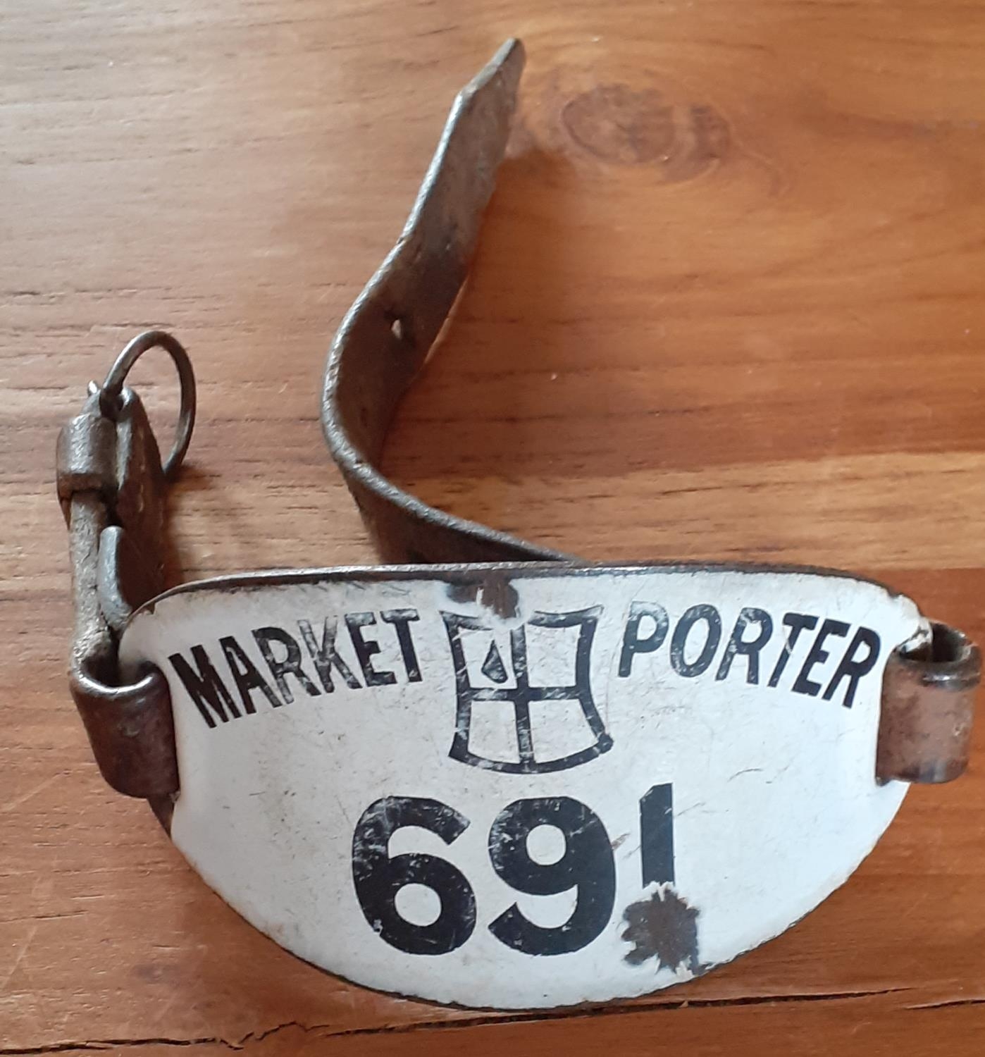 London Porter Fish Market Metal Enamelled Armband. Numbered 691. Original Leather Strap