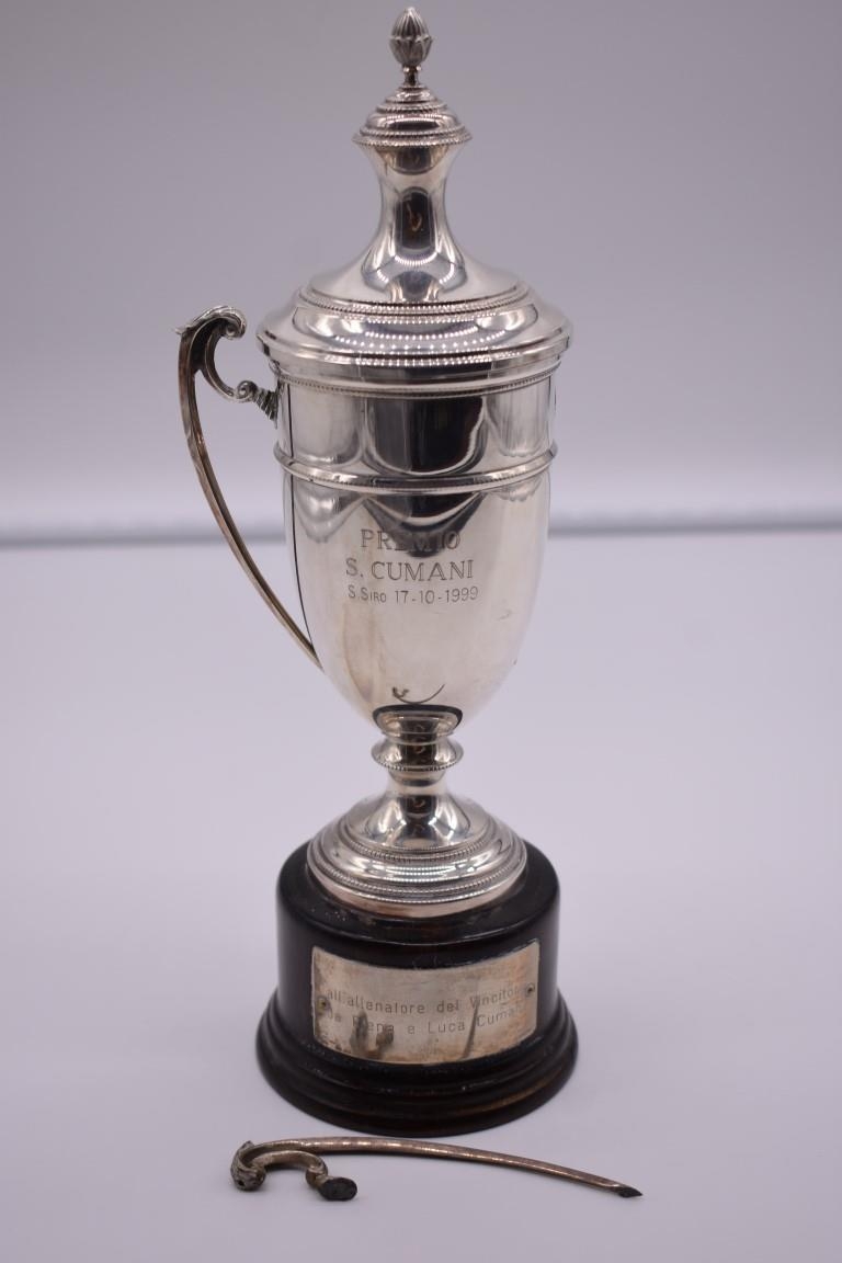 An Italian white metal twin handled trophy cup and cover, by R Miracoli, stamped 800, on wood socle, 17cm total height, (a/f).