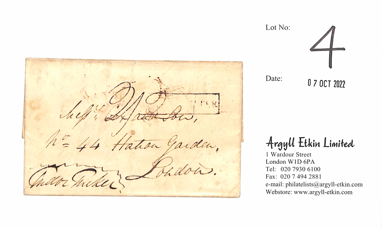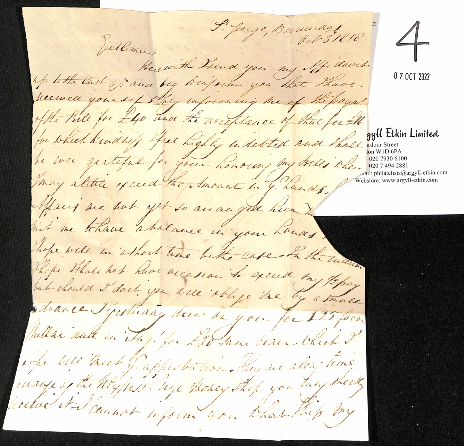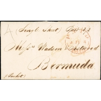 1818 (Oct 3) Entire letter written by Lieut Tudor Tucker from St. Georges to London, the address panel signed by Tucker, with partial boxed "PACKET LETTER" and a London backstamp, charged 2/2. Small tear at upper edge, otherwise fine, an early Bermuda letter.