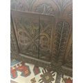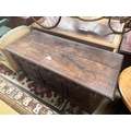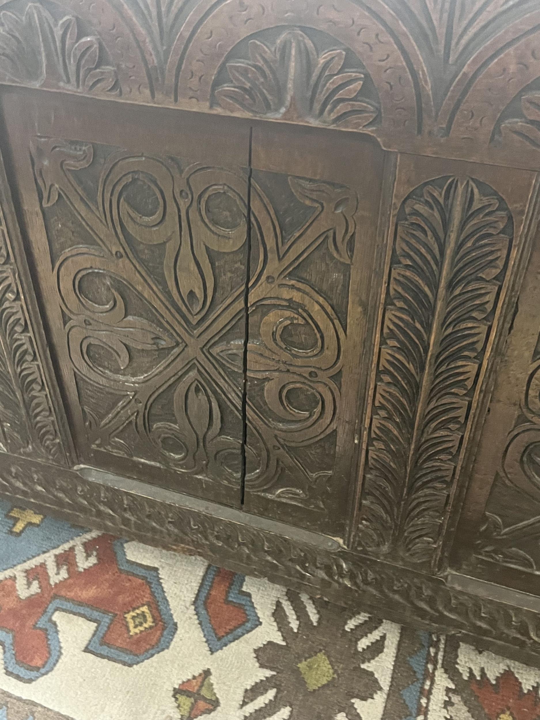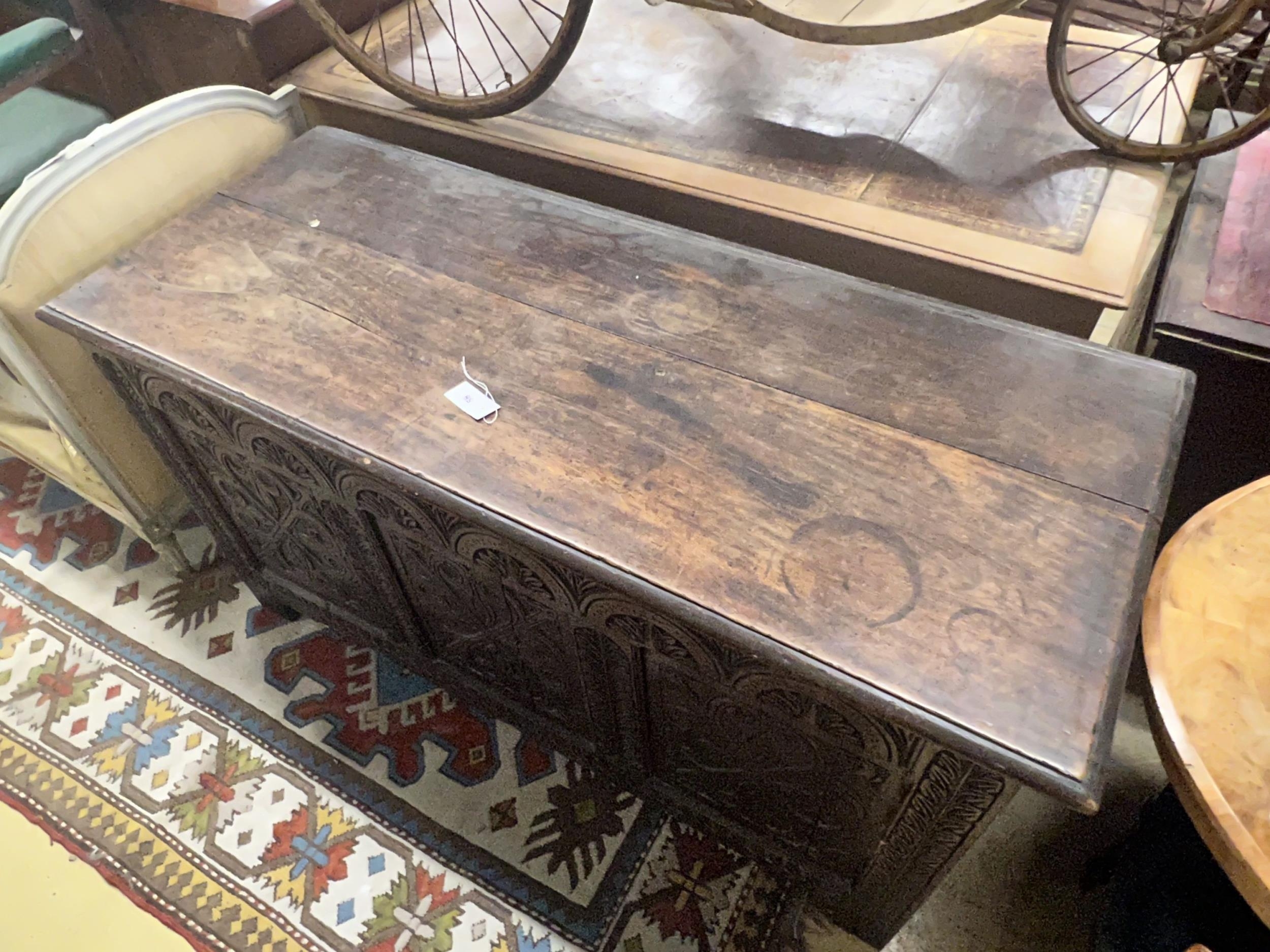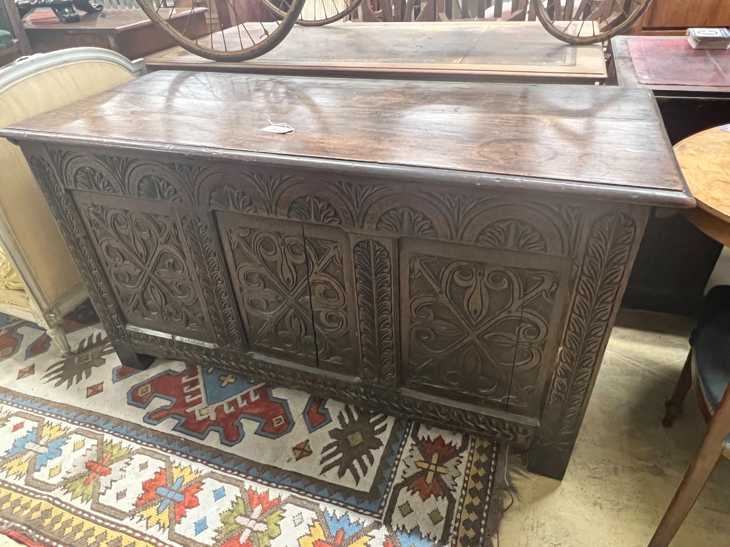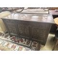 A large 18th century carved oak coffer, width 143cm depth 59cm height 77cm