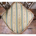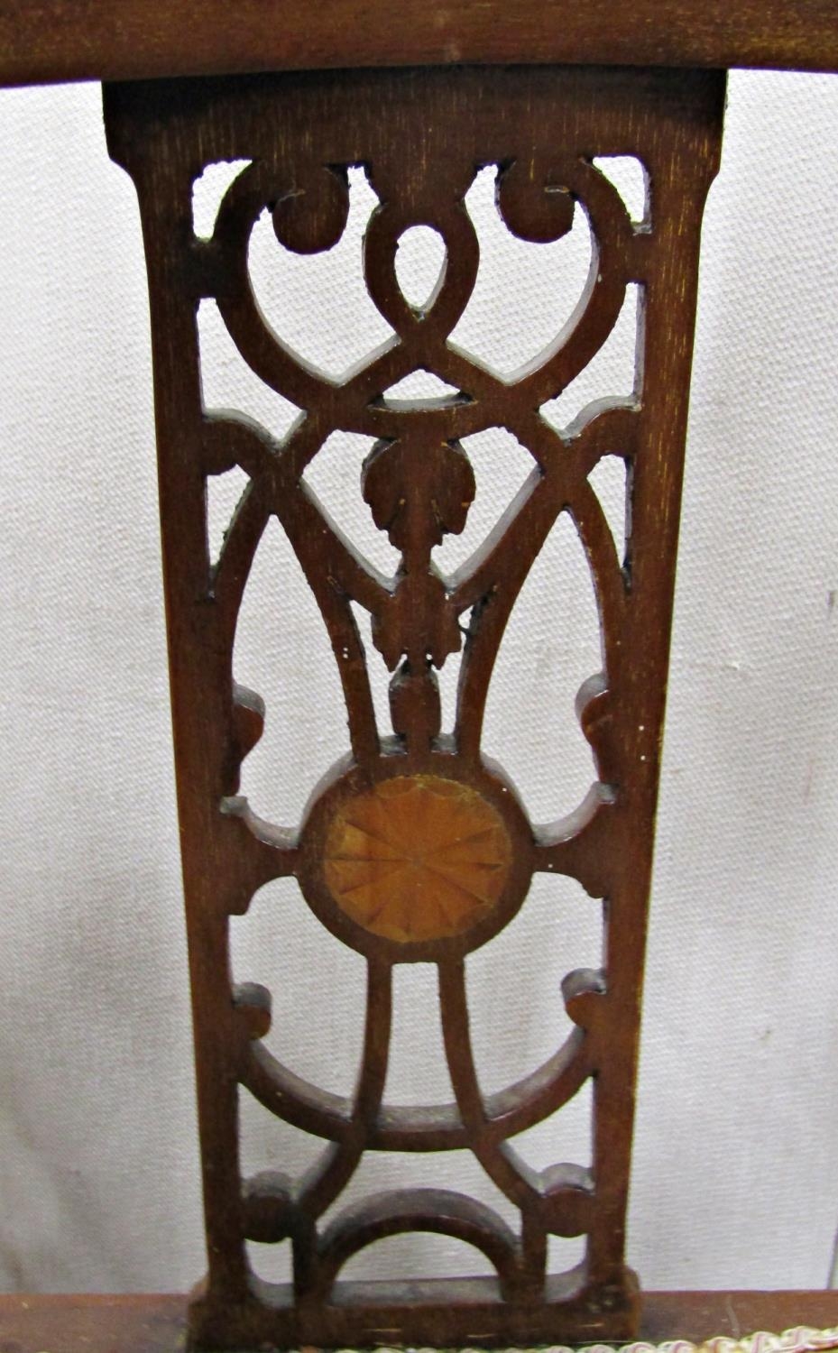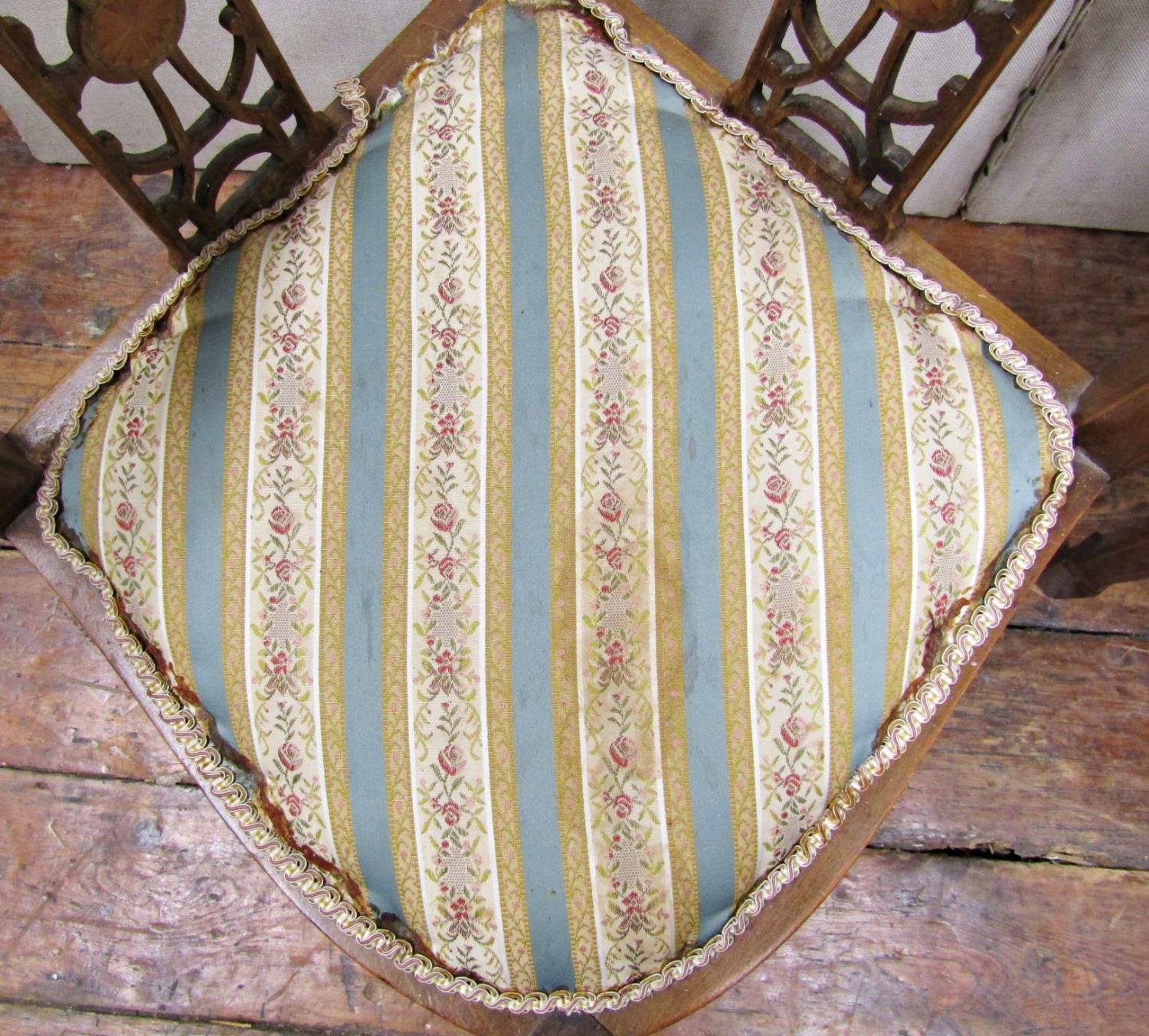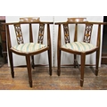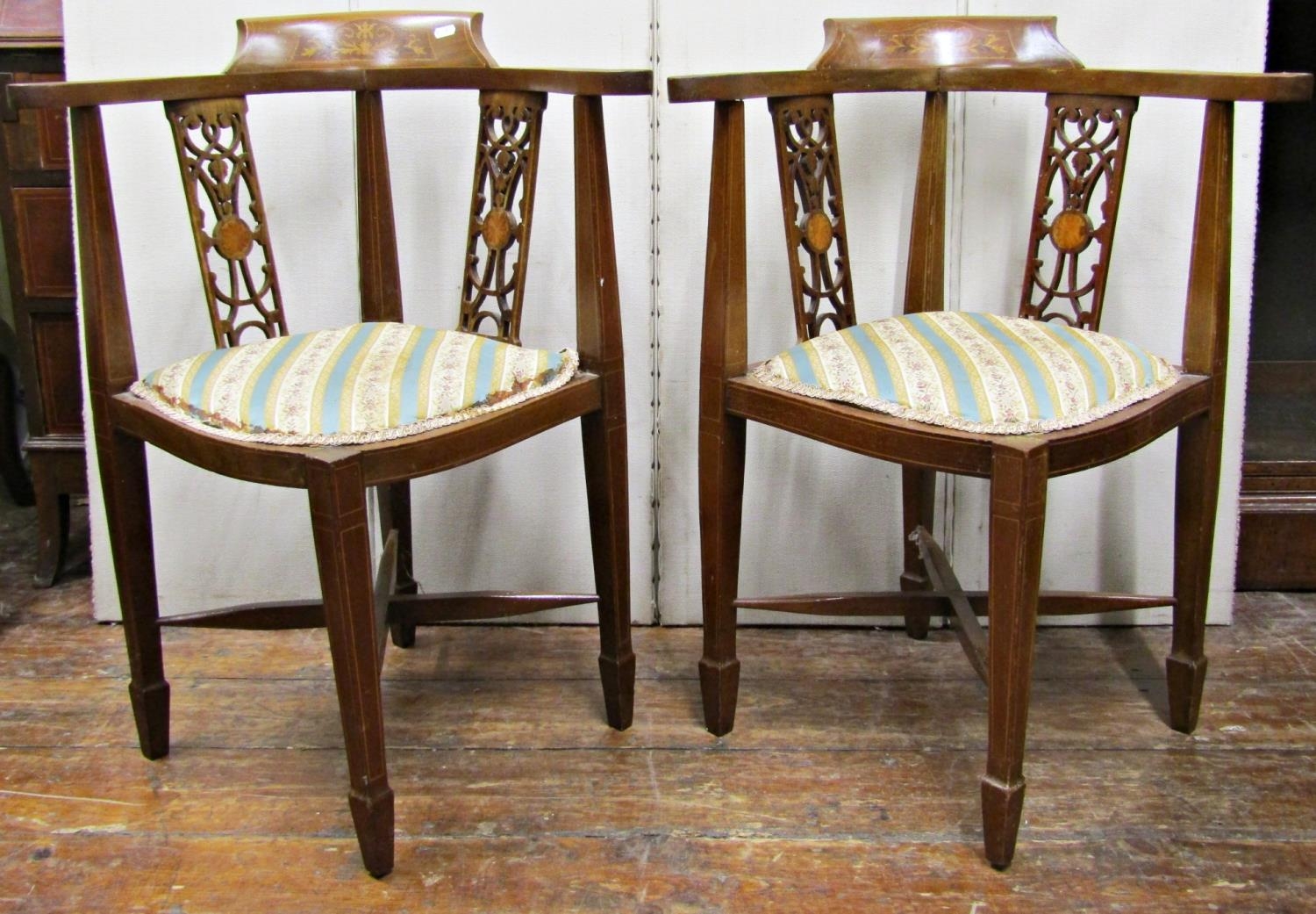 Pair of inlaid Edwardian mahogany corner chairs with carved and pierced splats, upholstered seat and raised on square tapered legs with spade feet