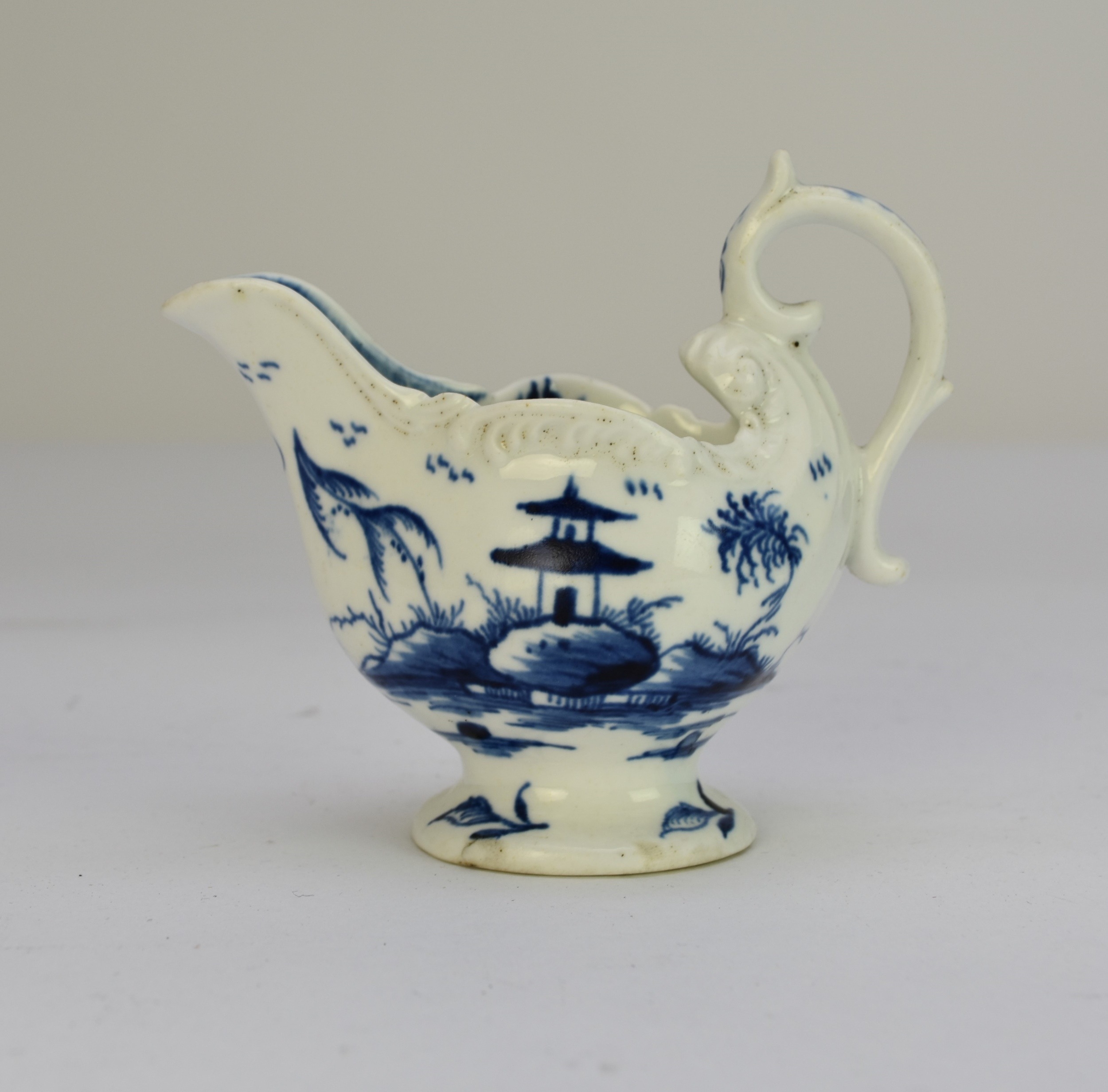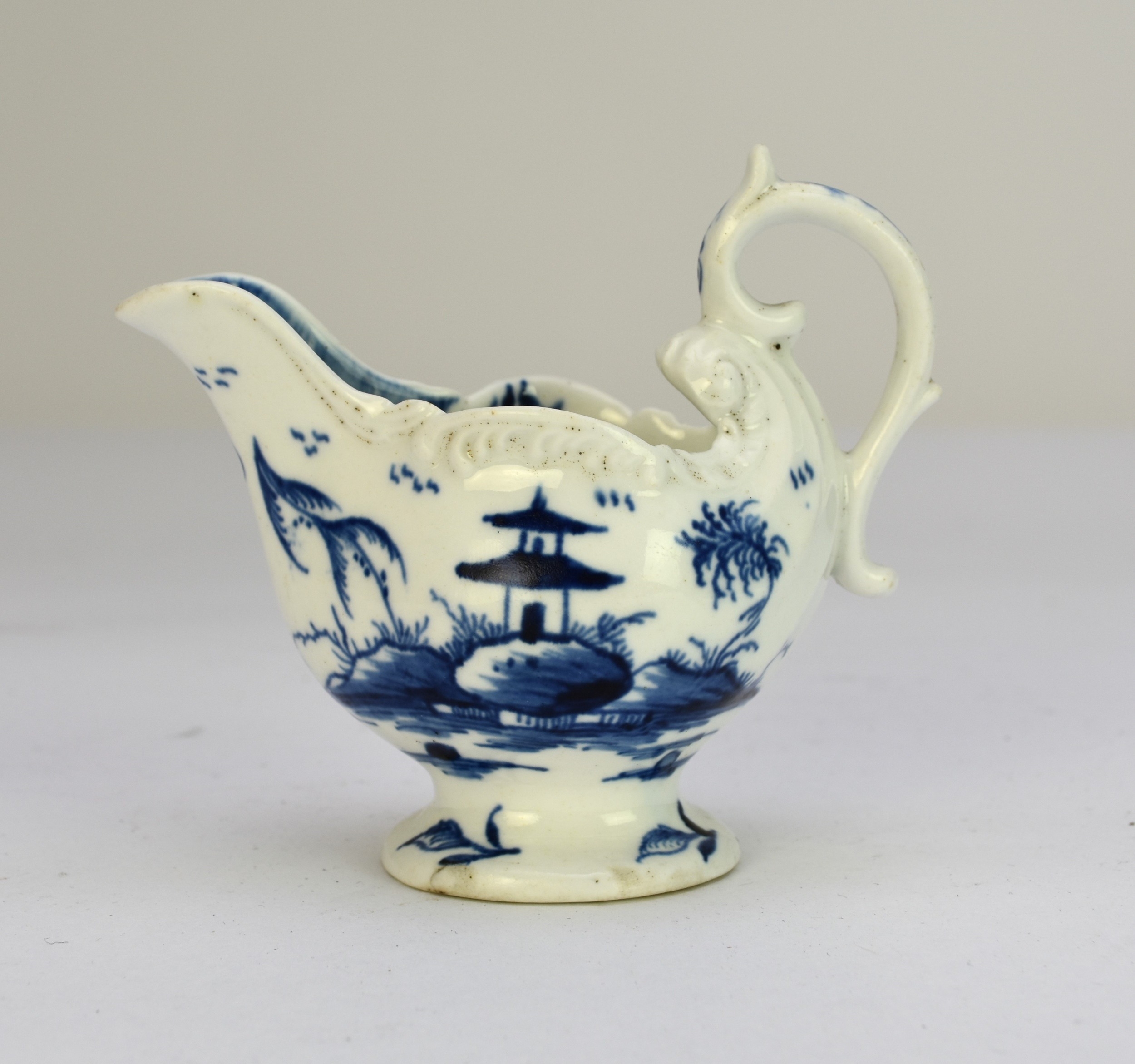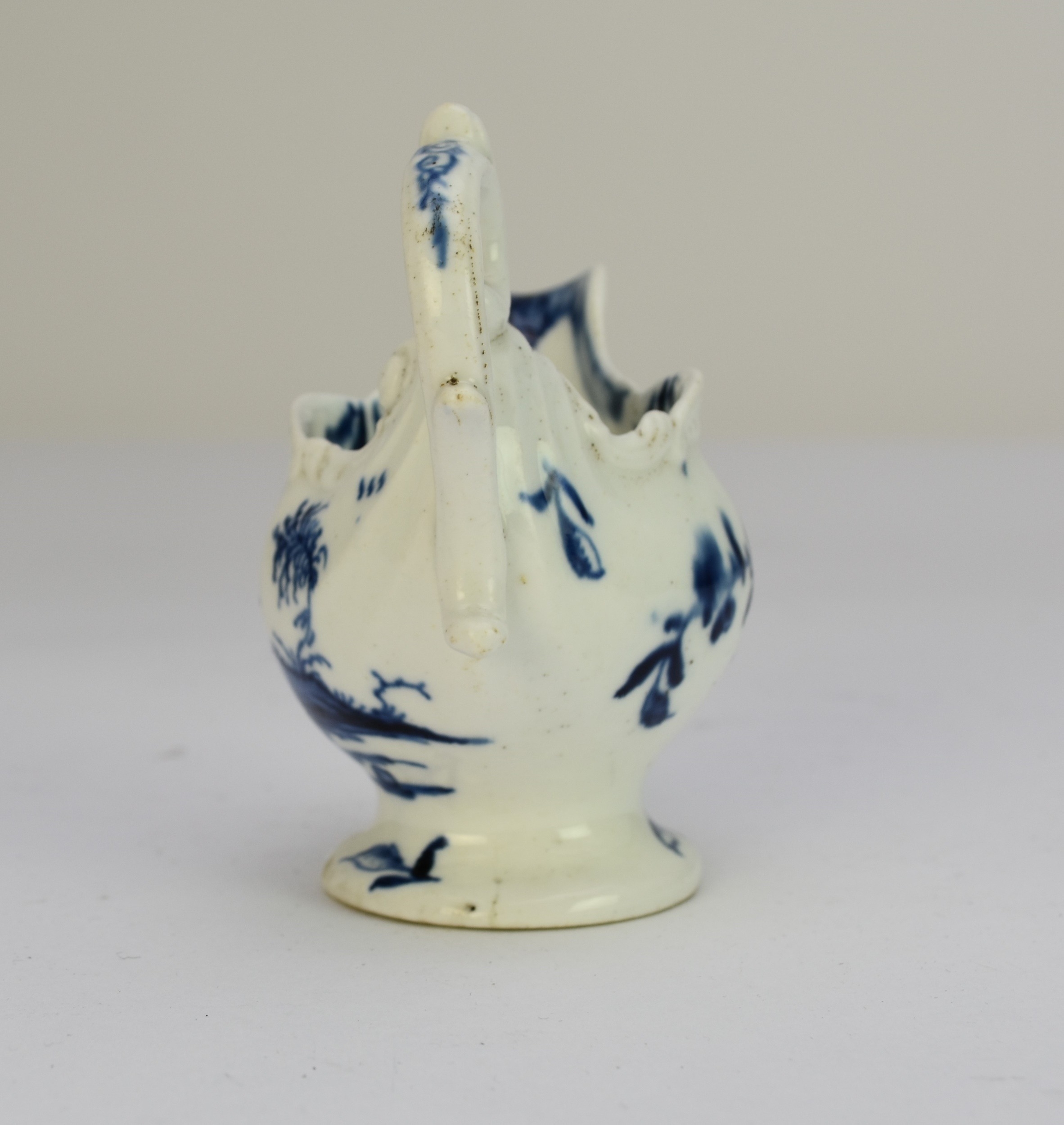 A Derby porcelain 'Cannonball' dolphin cream boat circa 1765-9 painted in underglaze blue, unmarked, 8.9cm high Condition:One small hairline to foot. There is a firing crack to the interior and also light scratches to the interior. One further small firing crack to the foot. No other damages or repairs.