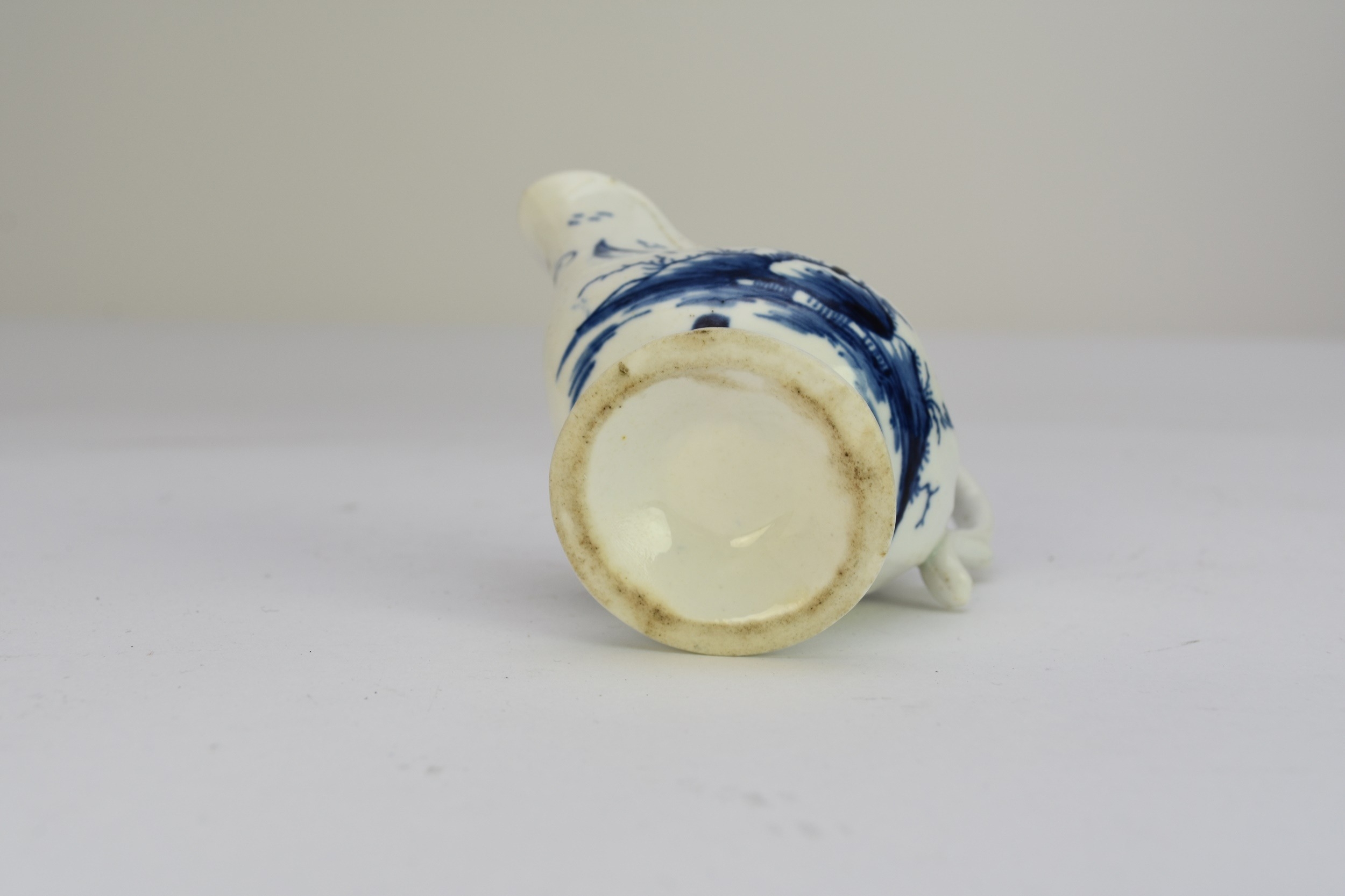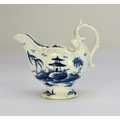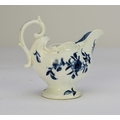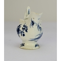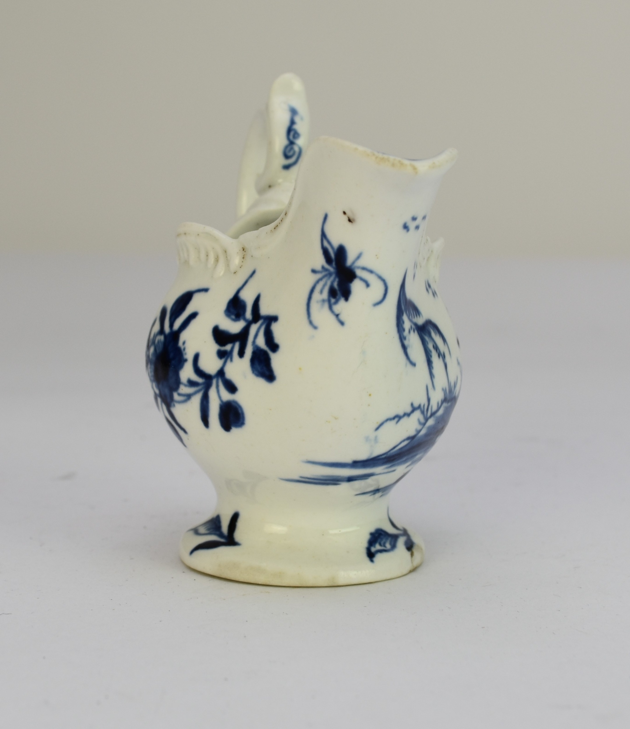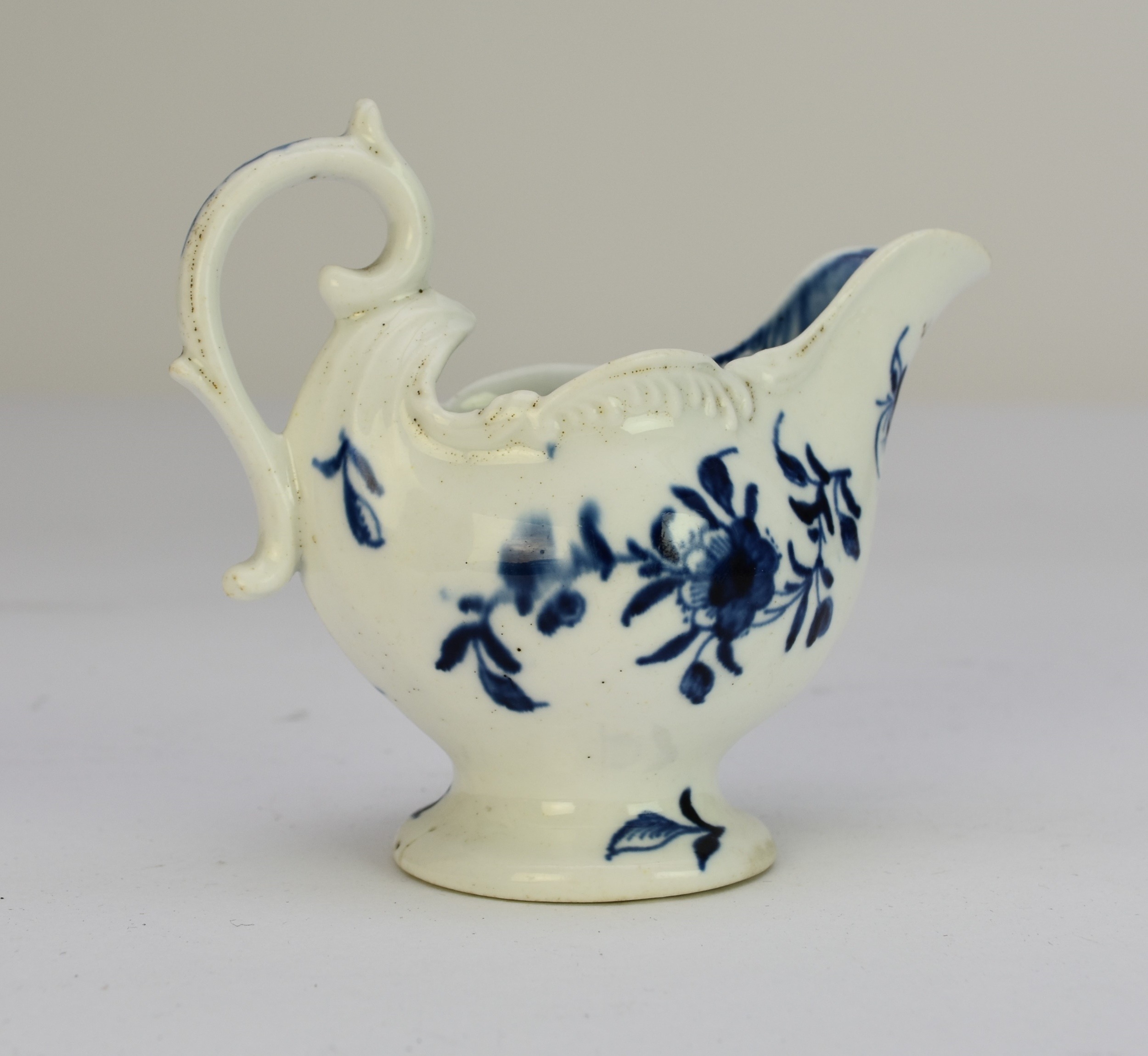 A Derby porcelain 'Cannonball' dolphin cream boat circa 1765-9 painted in underglaze blue, unmarked, 8.9cm high Condition:One small hairline to foot. There is a firing crack to the interior and also light scratches to the interior. One further small firing crack to the foot. No other damages or repairs.