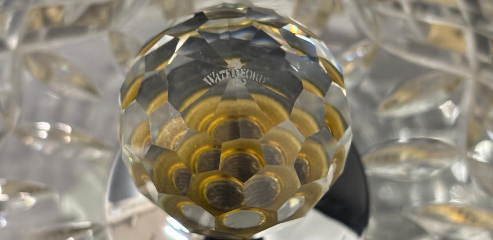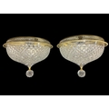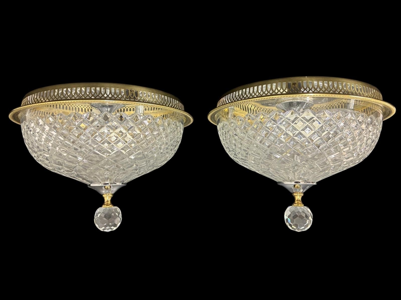 A MATCHED PAIR OF WATERFORD CUT CRYSTAL FLUSH MOUNT CEILING LIGHTS with faceted globe finials, leaf and graduated diamond pattern cutting each housed within pierced gilt metal circular frames 25cm (h) x 33cm (d)