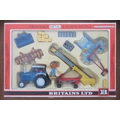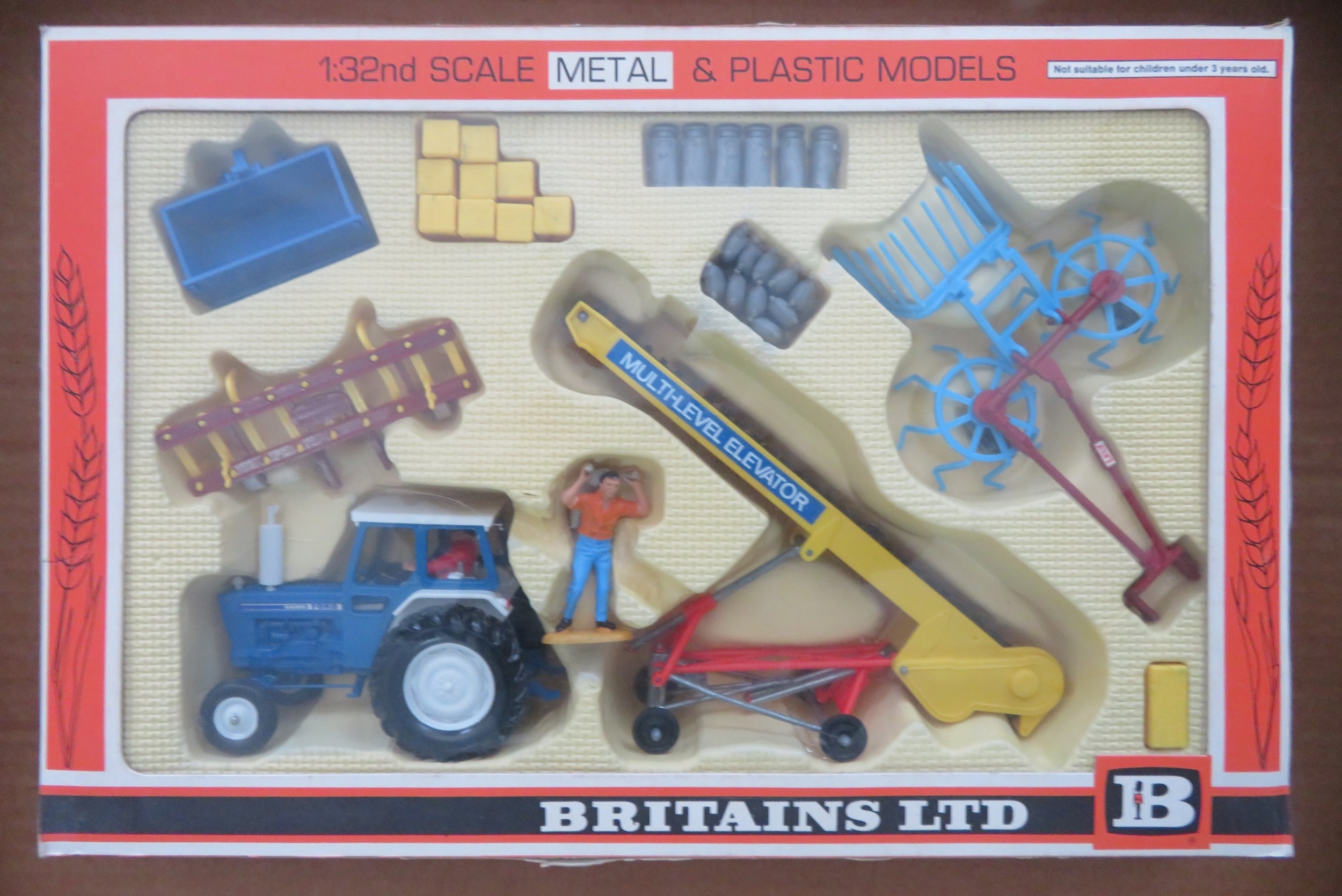Britains Farm Tractor and Implements set No. 9590, generally excellent in excellent window box, with Ford 6600 blue tractor, Multi-level Elevator, driver and farm worker figure (base stamped 1972), etc. Contents appear complete but unchecked. Viewing recommended.