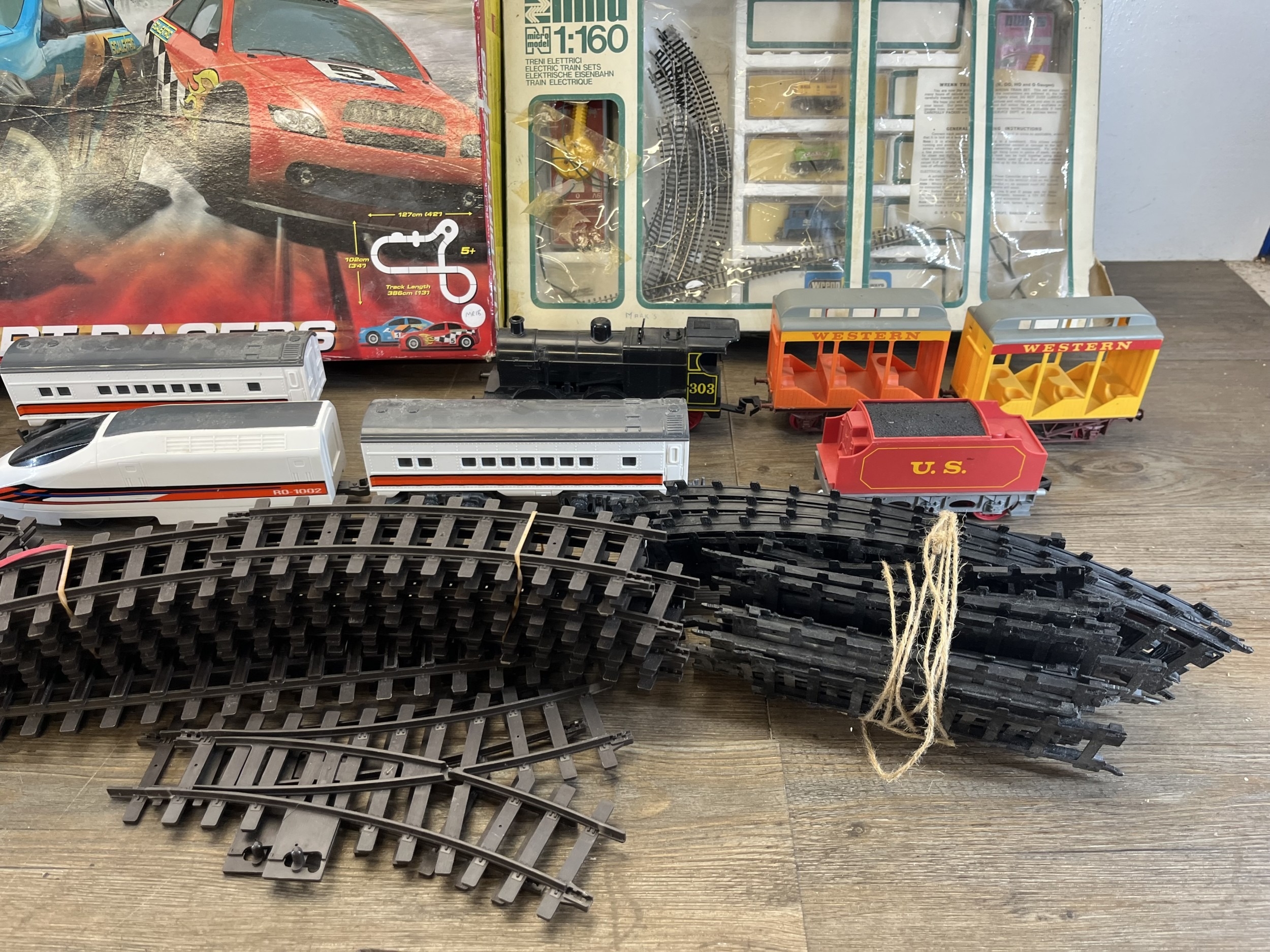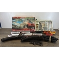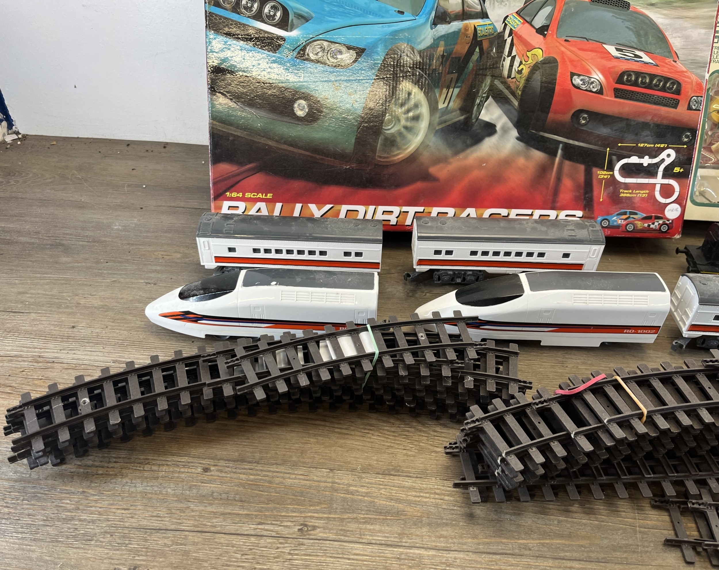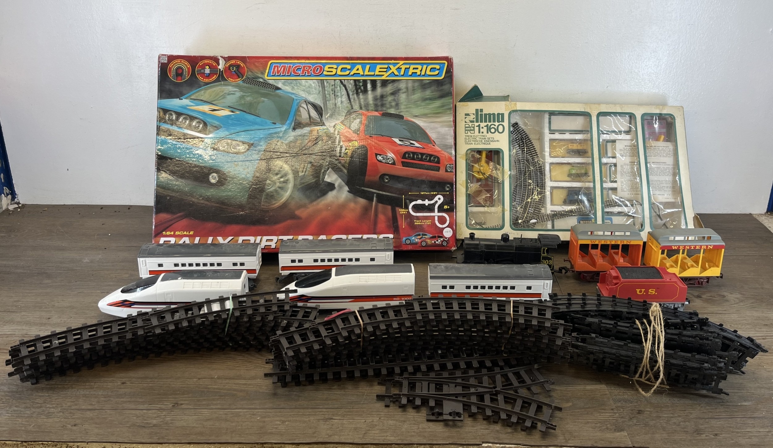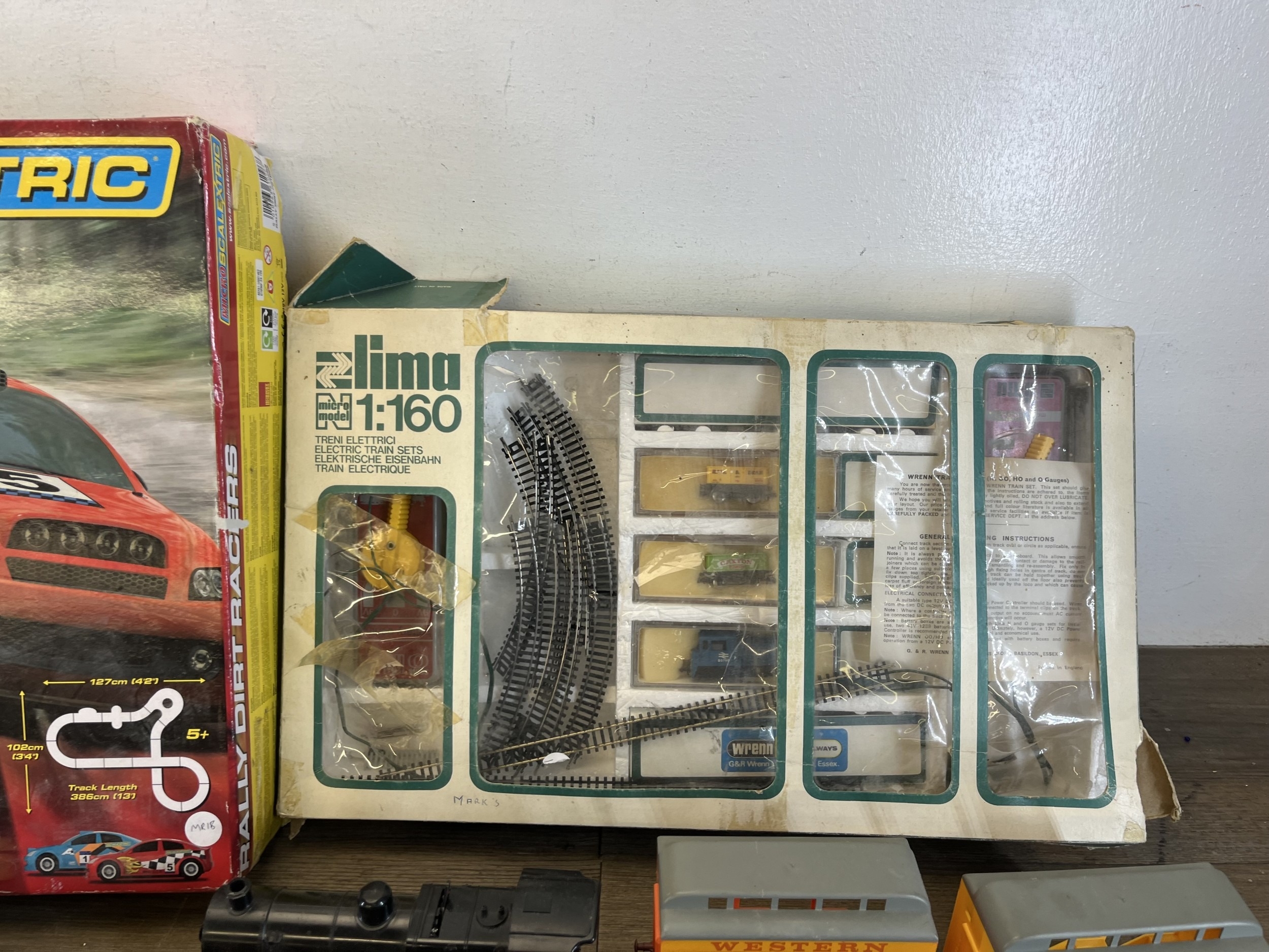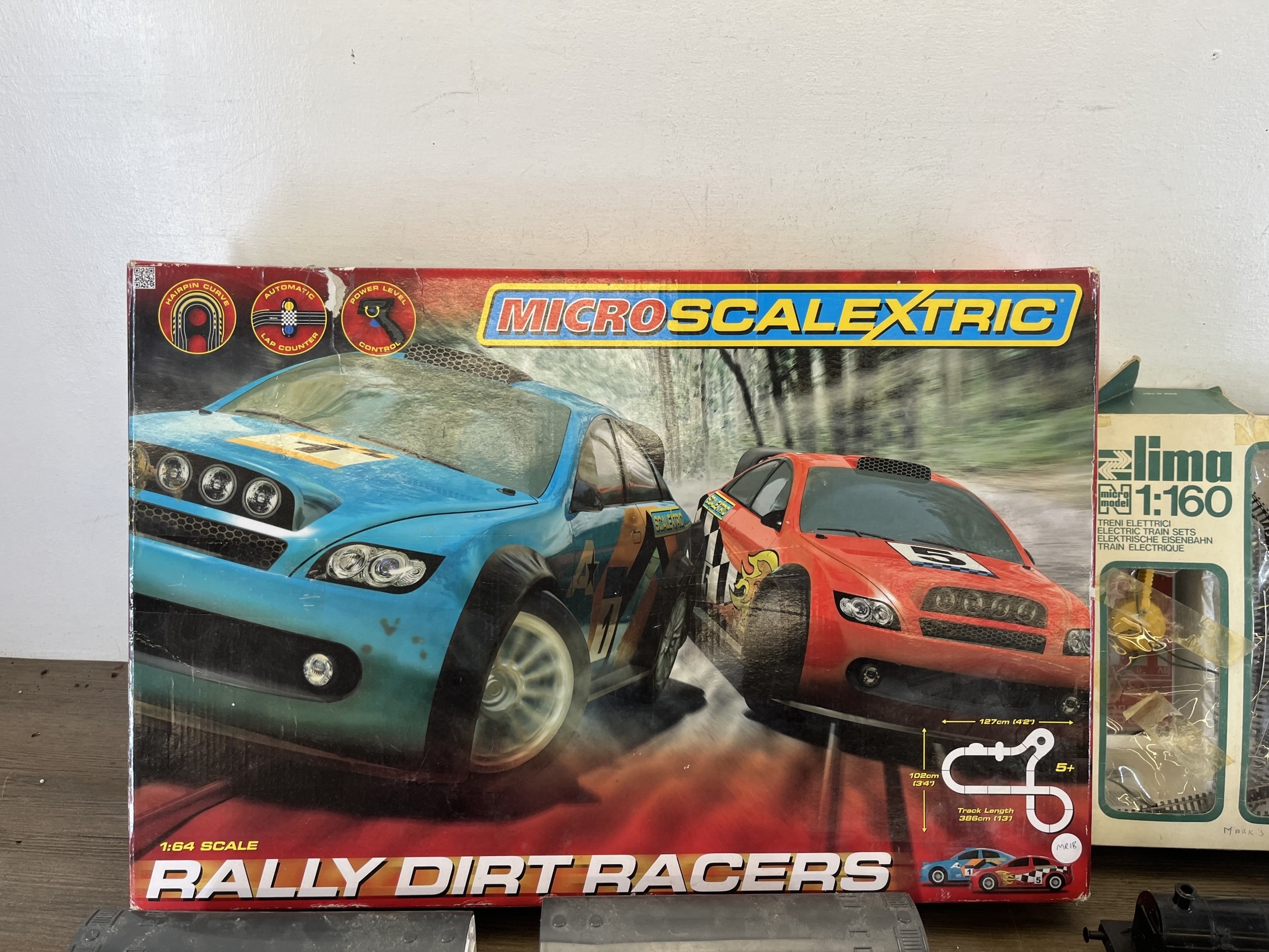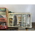 A collection of model railway items with a boxed Micro Scalextric 1:64 scale Rally Dirtracers slot car set