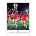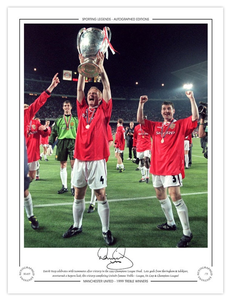 Autographed DAVID MAY 1999 Limited-Edition : A superbly produced Limited Edition print measuring 16 x 12, depicting Man United substitute DAVID MAY holding aloft the Champions League trophy during a lap of honour following a dramatic 2-1 victory over Bayern Munich in the 1999 Final at the Nou Camp, limited to just 75 editions it has been signed to the lower border in fine black marker.