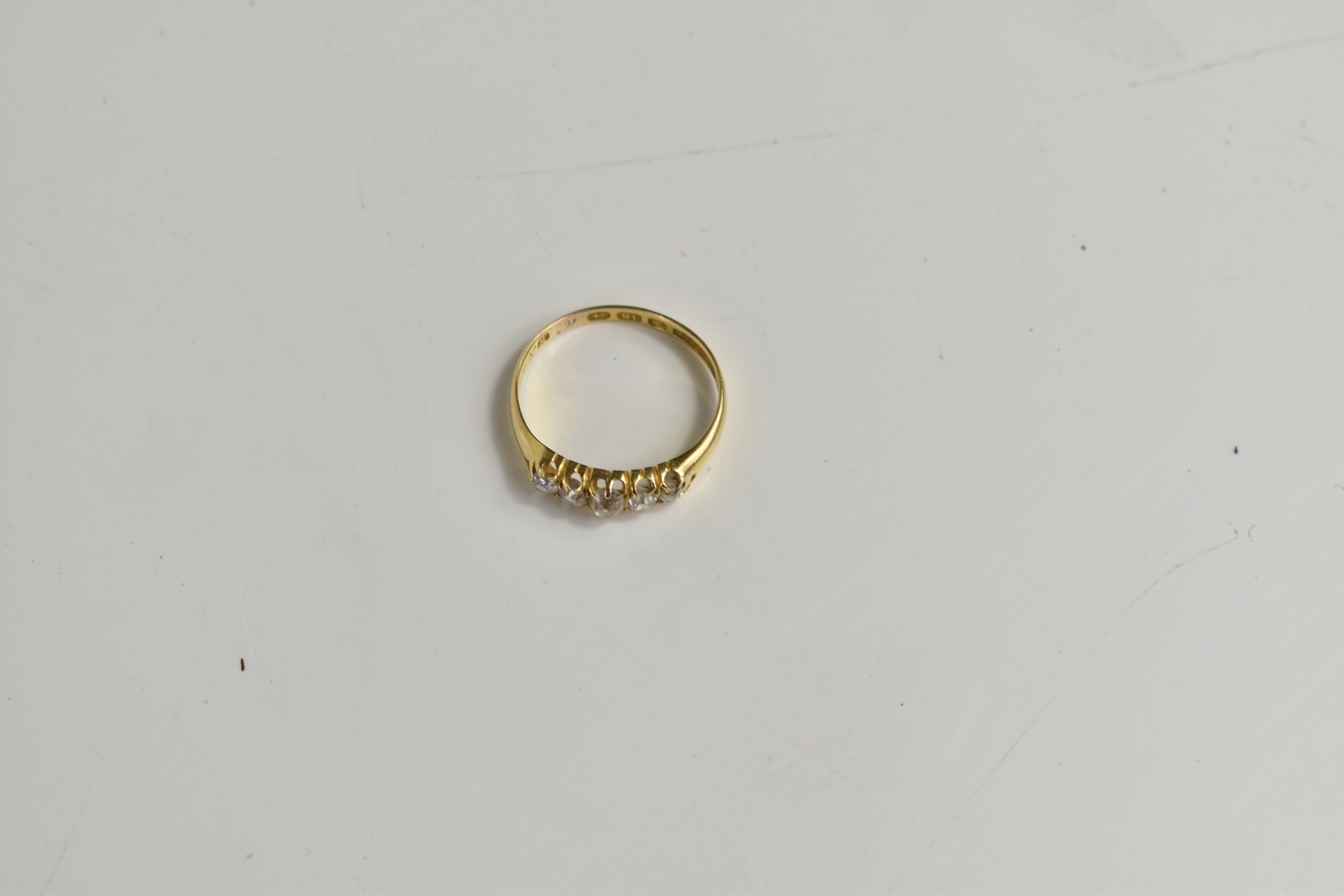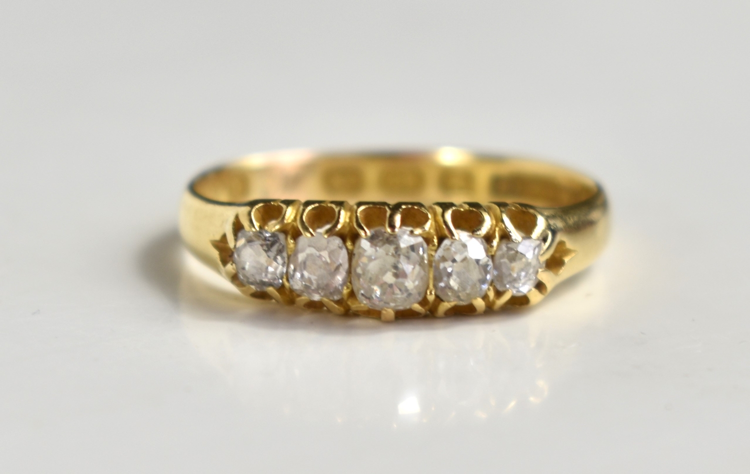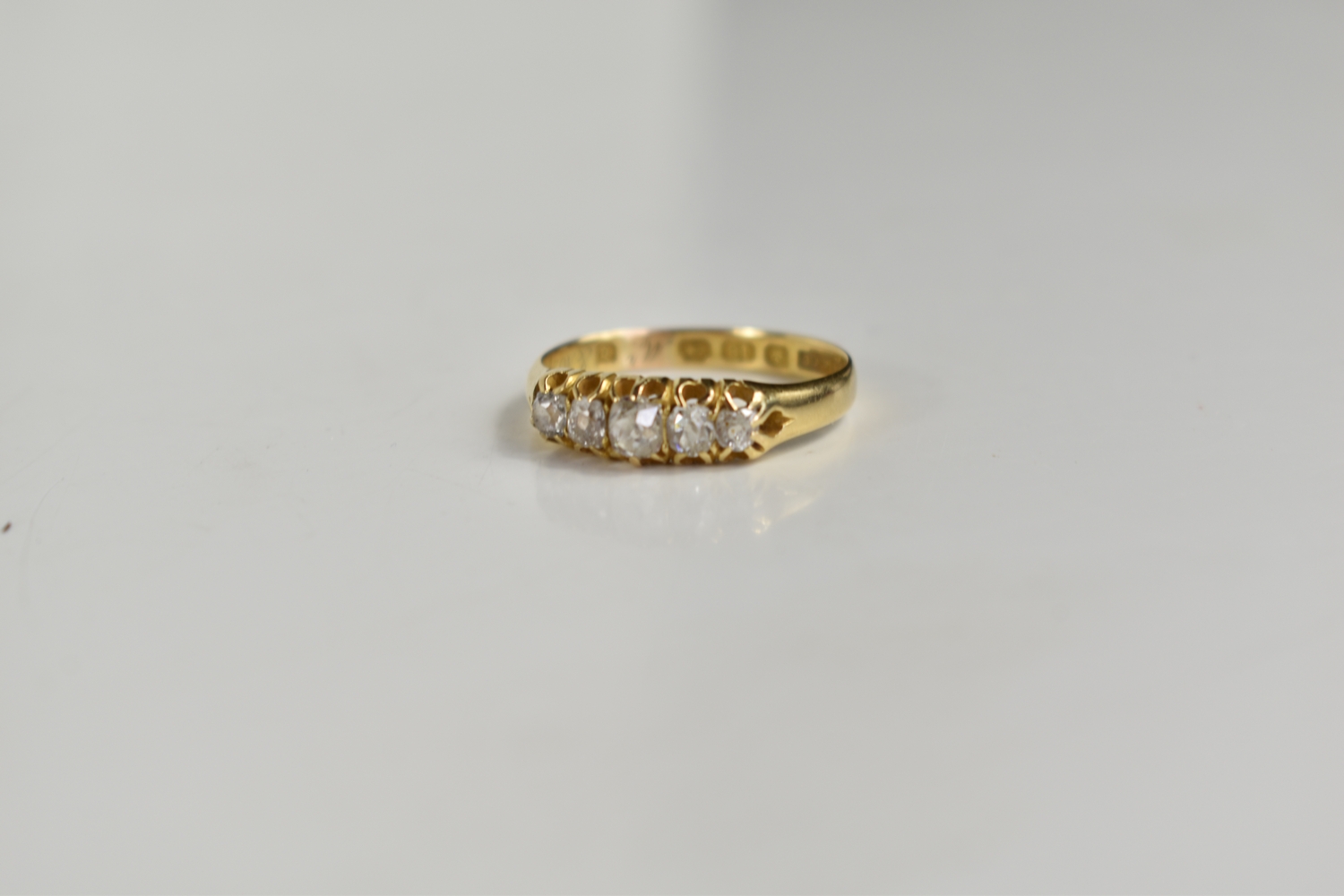 An 18ct gold, and diamond five stone ring, the central diamond of approximately 4mm diameter, total diamond carat weight of all five stones approximately 1ct, size P, 2.95g.