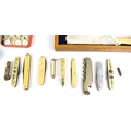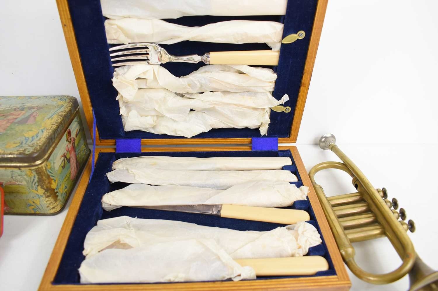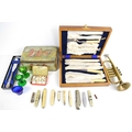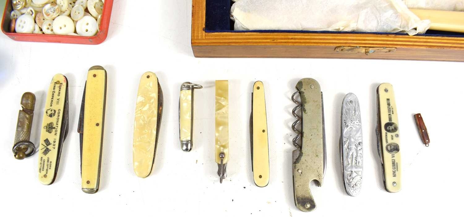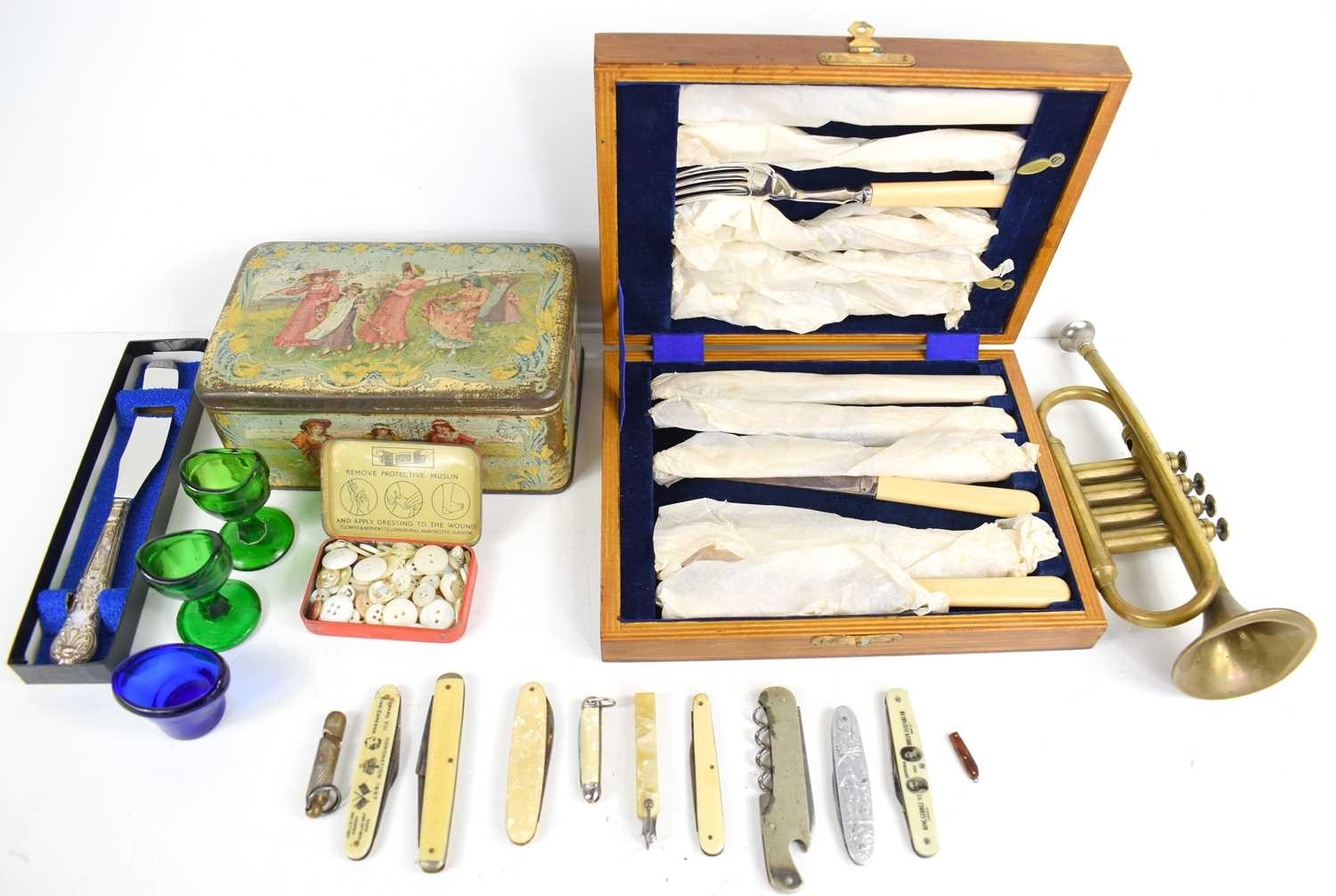 A group of collectables to include a silver handled knife, pocket knives to include 1937 Coronation examples, vintage tins, brass piccolo and other items.