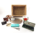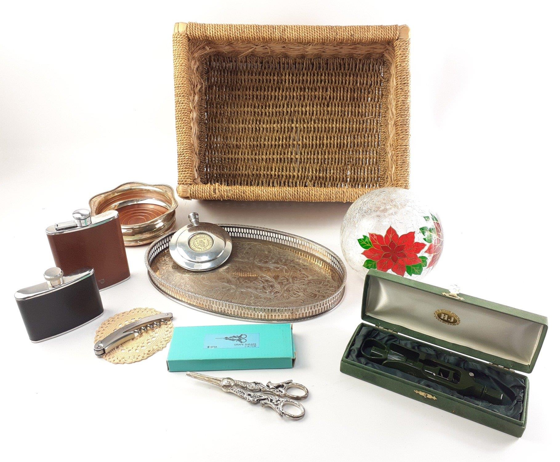 An oval galleried tray (32cm approx), a boxed HUGH JOHNSON bottle opener, a pair of grape shears, a crackle glass battery operated lamp, a TALISKER DISTILLERY hip flask, two leather covered hip flasks and a wine bottle coaster all contained within a wicker basket.