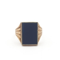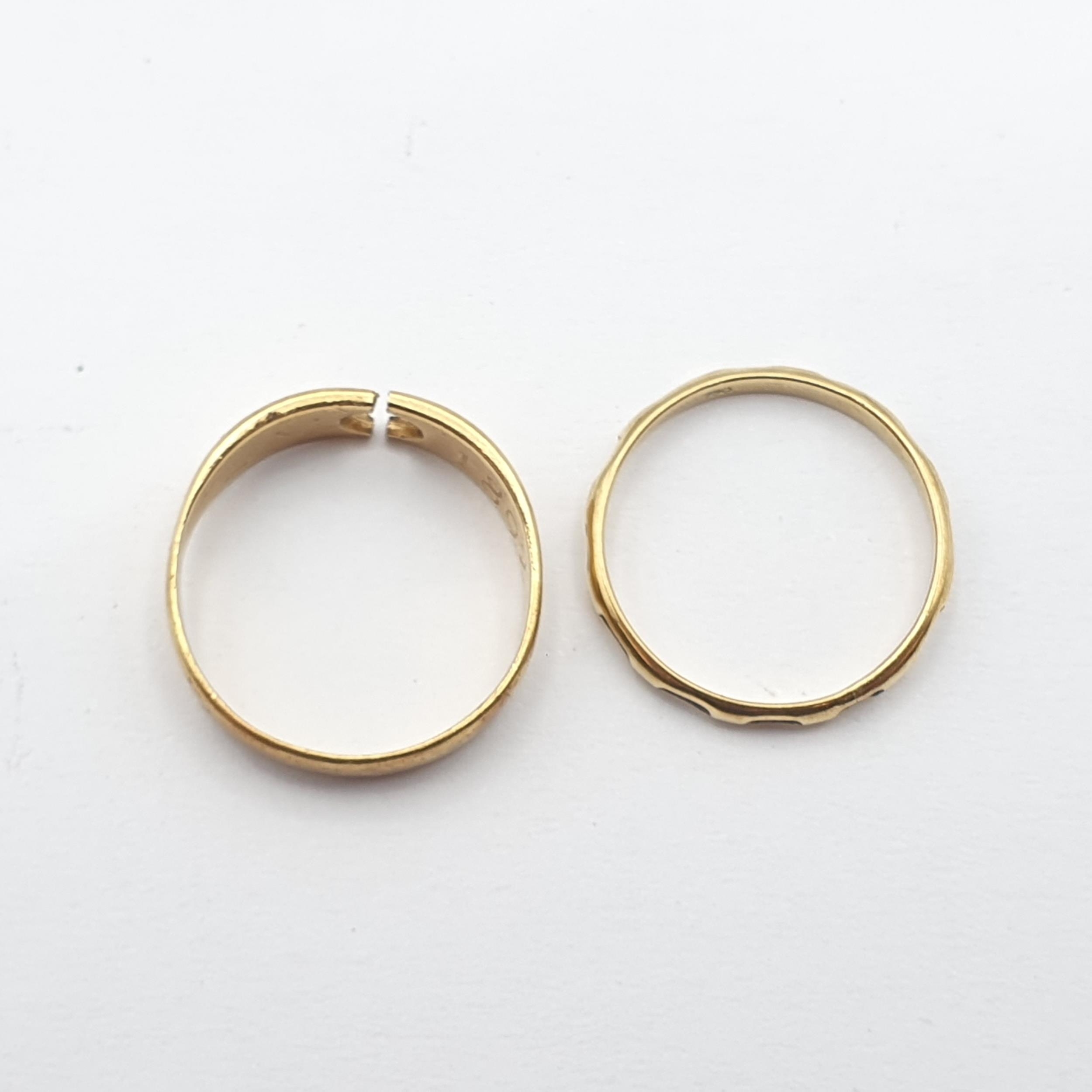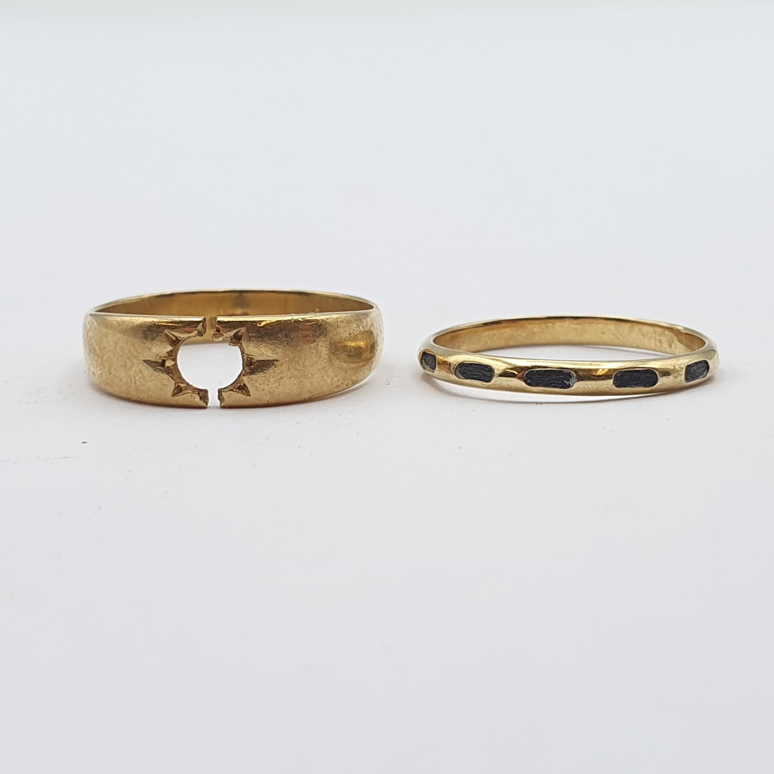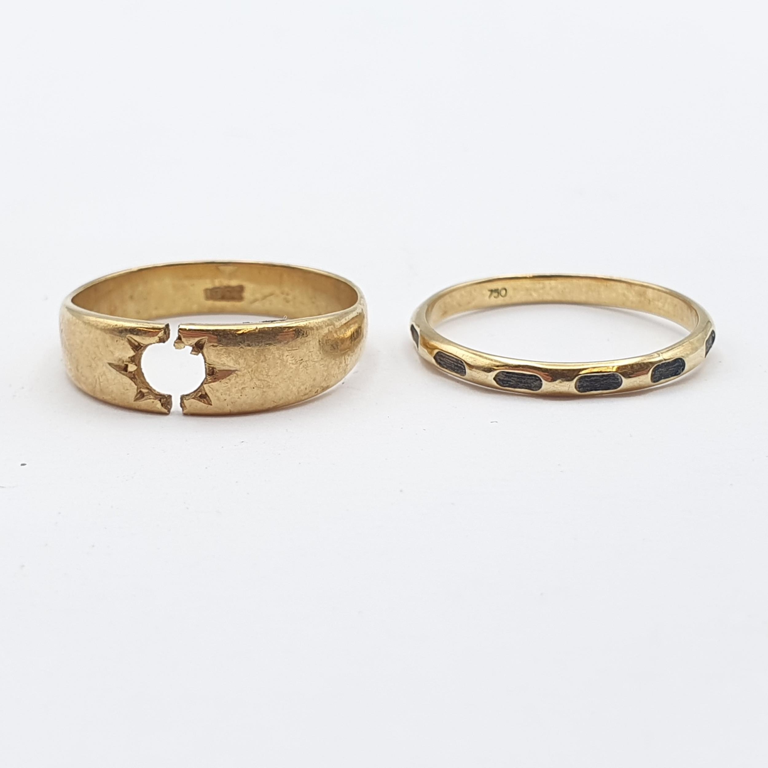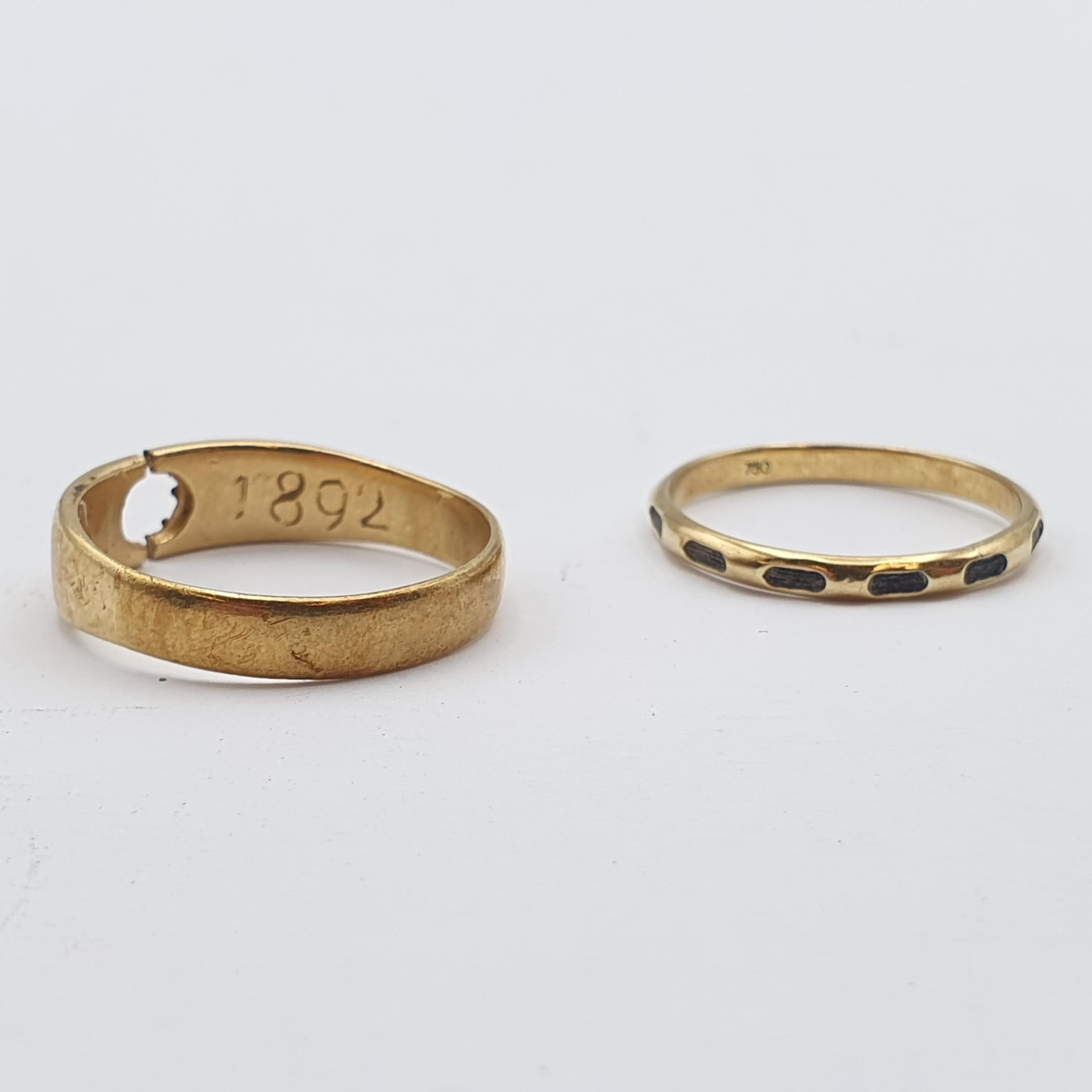 A yellow metal Ring stamped 750 containing a strand of elephant hair and a further Ring with gypsy setting lacking stone stamped 18ct and 1892, approx 4.5gms