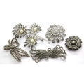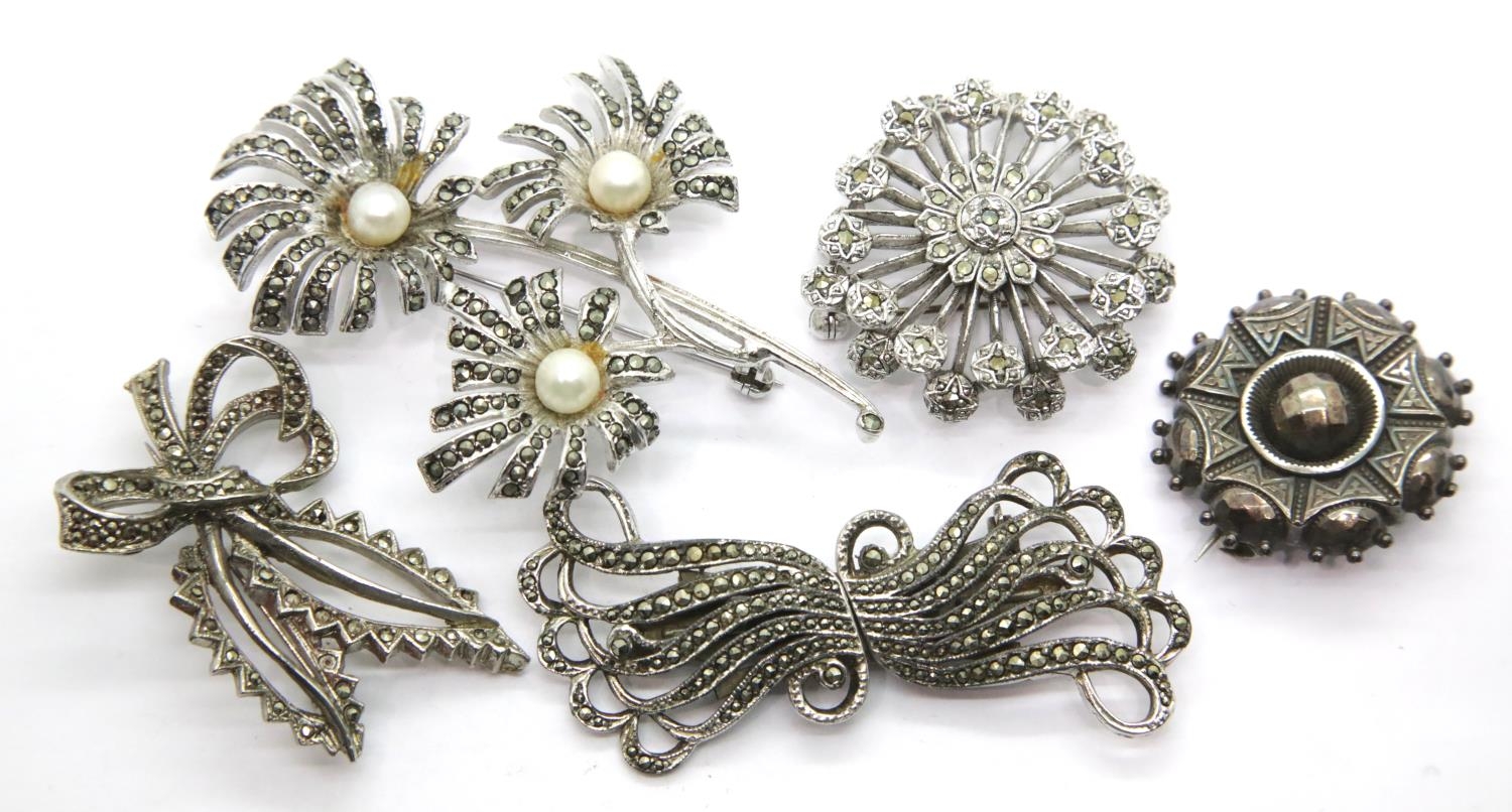 Four vintage white metal marcasite set brooches and a further white metal brooch. P&P Group 1 (£14+VAT for the first lot and £1+VAT for subsequent lots)