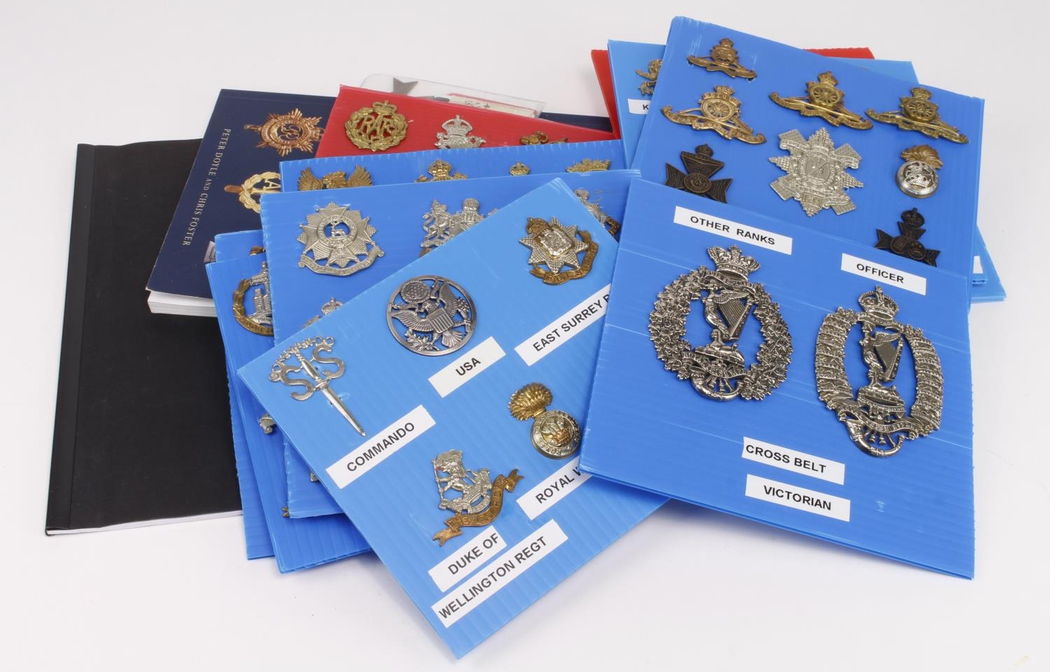 Cap badge collection (approx 94) mounted on plastic squares, wide ranging mixed lot, with a few loose medals and fobs noted. Plus 2x reference books. Worth closer inspection. (qty)