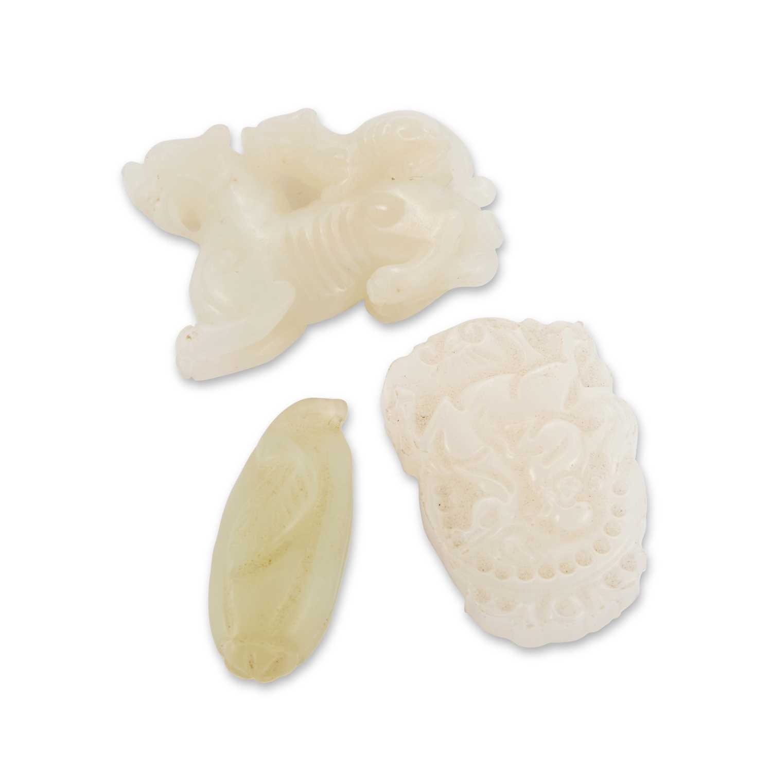 comprising a carving of a gourd, two feline-like creatures and a plaque carved with a monkey riding a horse. (3) Gourd 4.5cm high