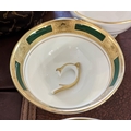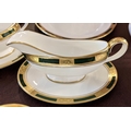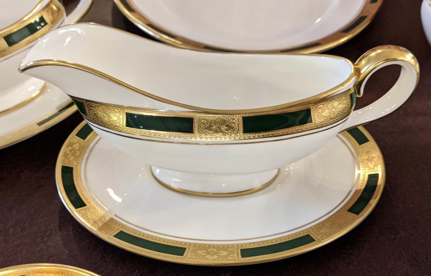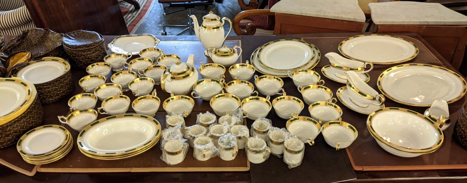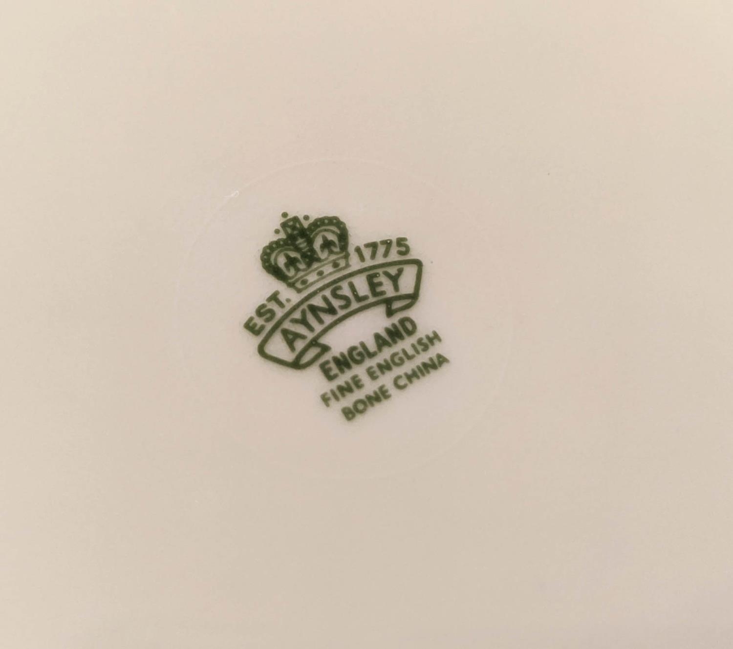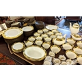 AN AYNLSEY 'EMPRESS LAUREL' DINNER SERVICE, comprising approximately 14 dinner plates, 14 dessert plates, 14 side plates, 13 further side plates, 14 coffee cans and 12 saucers, 14 tea cups and 14 saucers, 14 soup cups and 14 saucers, teapot, coffee pot, milk jug, lidded sugar bowl, cake plate, three serving bowls, various meat plates, sauce boats, etc