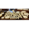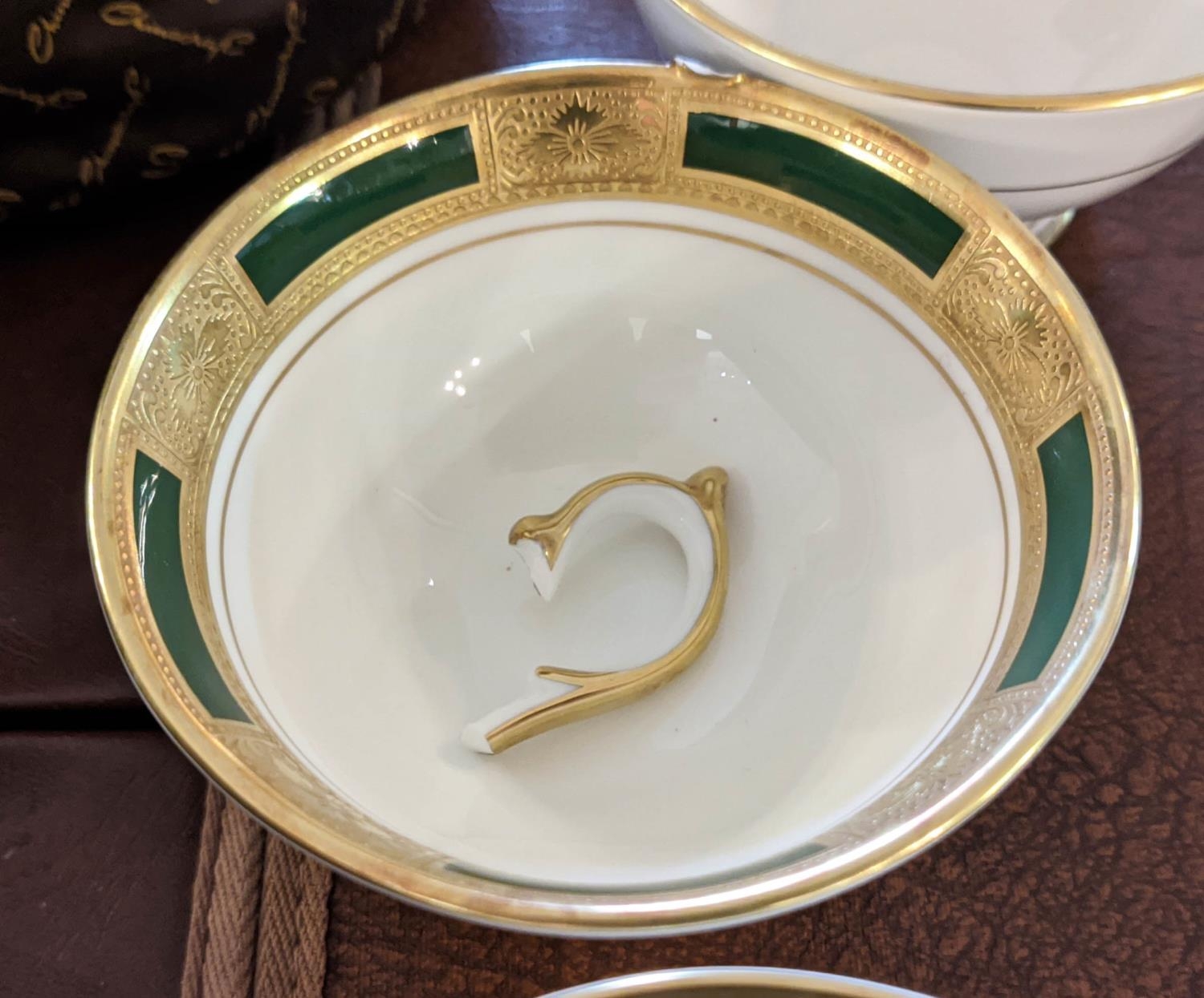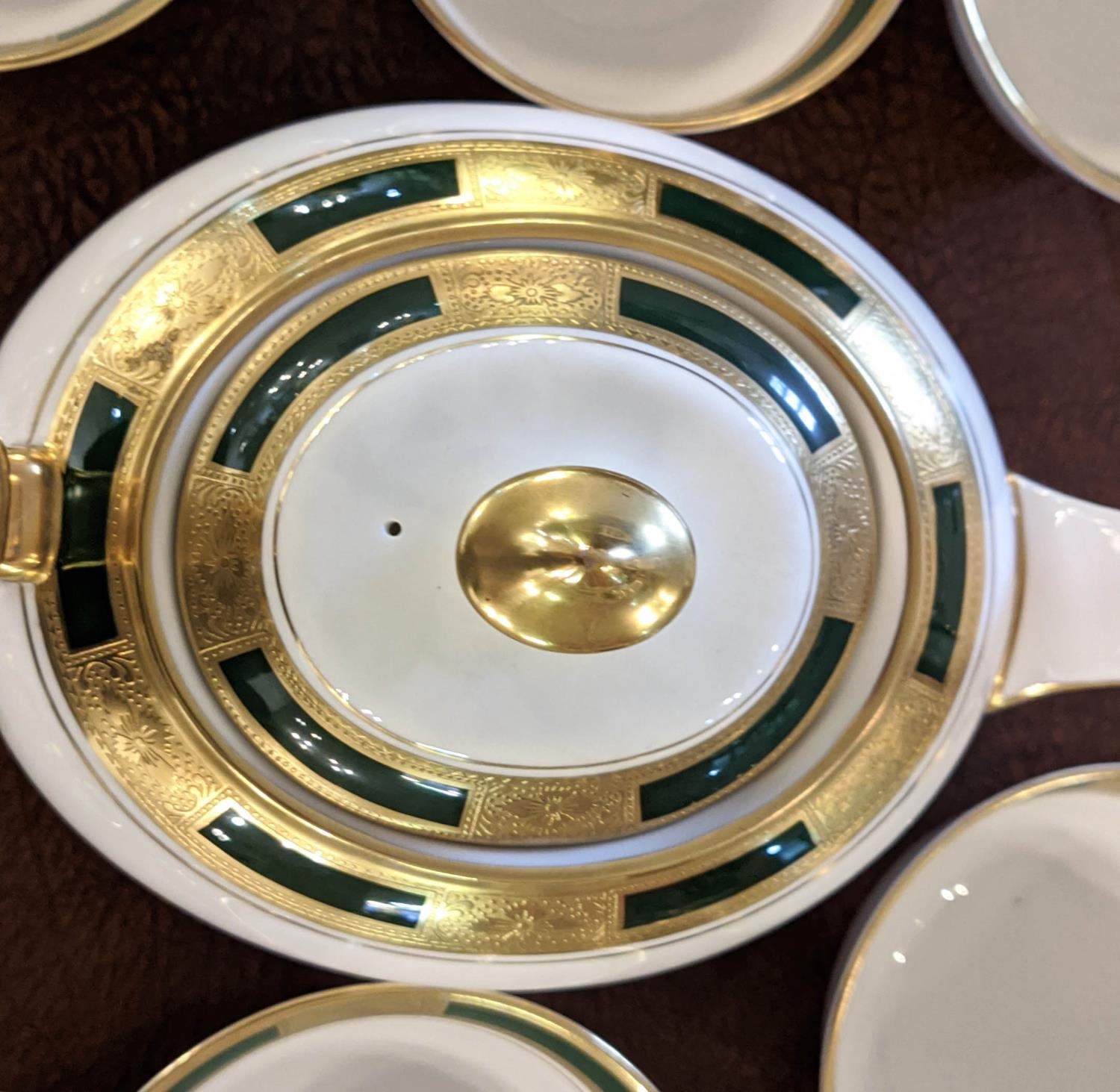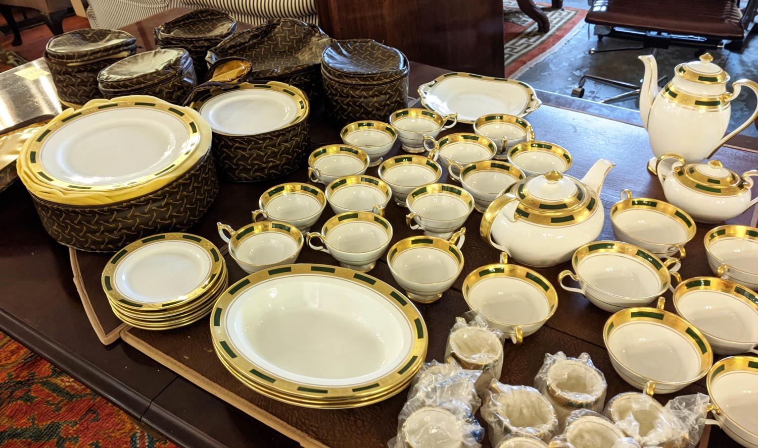 AN AYNLSEY 'EMPRESS LAUREL' DINNER SERVICE, comprising approximately 14 dinner plates, 14 dessert plates, 14 side plates, 13 further side plates, 14 coffee cans and 12 saucers, 14 tea cups and 14 saucers, 14 soup cups and 14 saucers, teapot, coffee pot, milk jug, lidded sugar bowl, cake plate, three serving bowls, various meat plates, sauce boats, etc