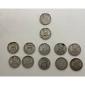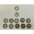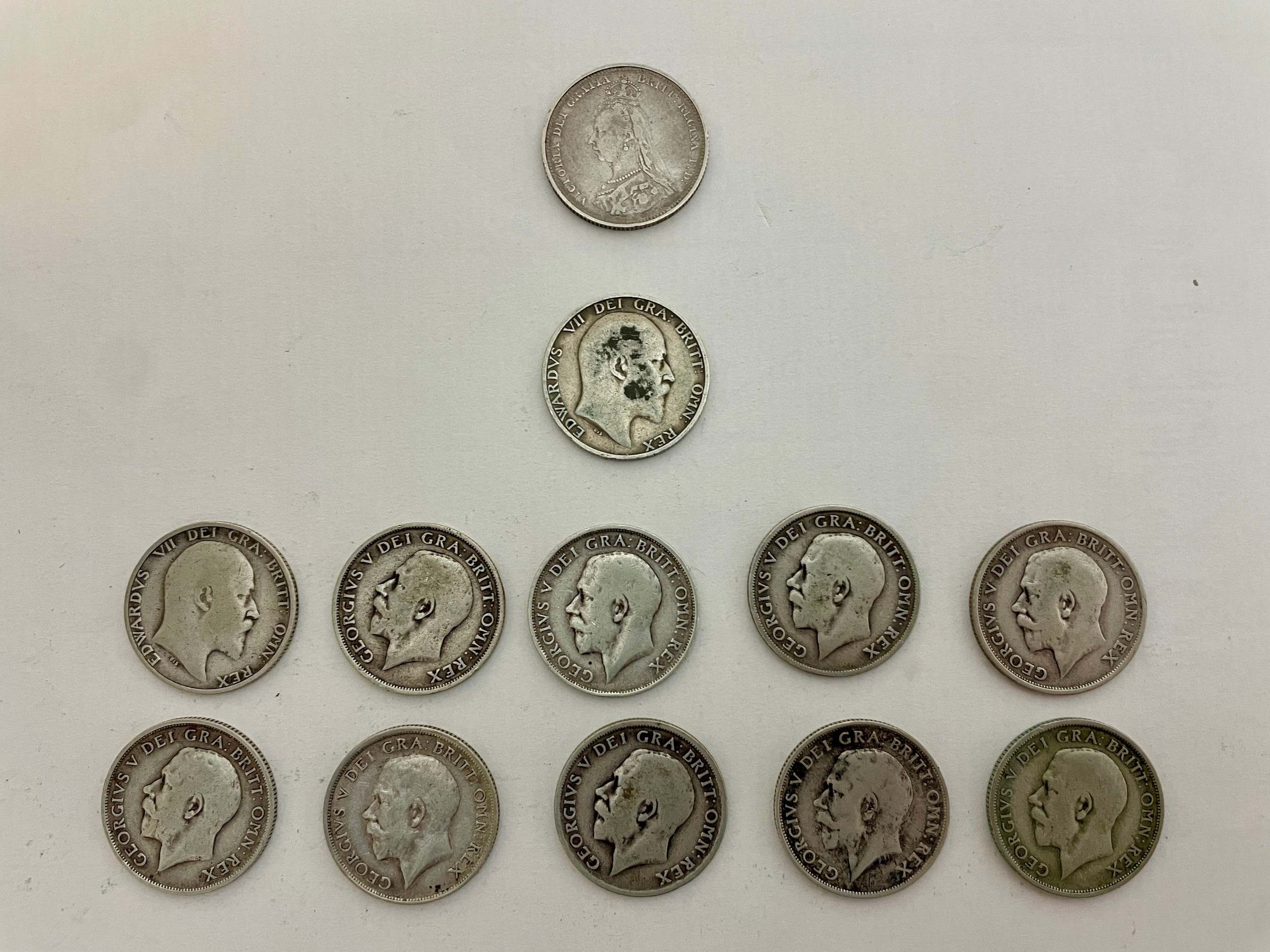 12 silver one shilling coins, 1887, 1906, 1910 - 1920.