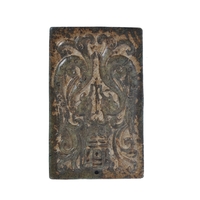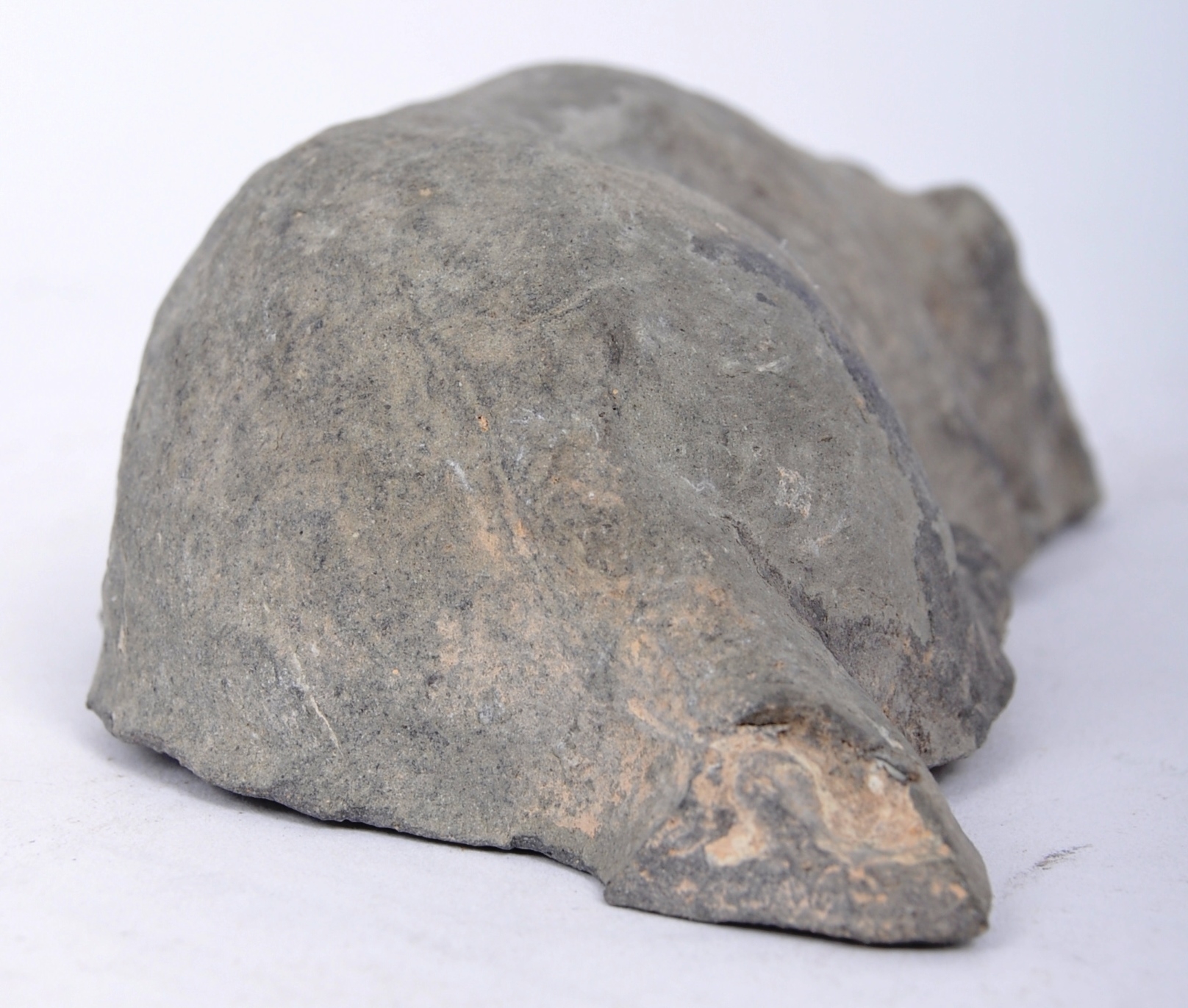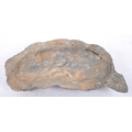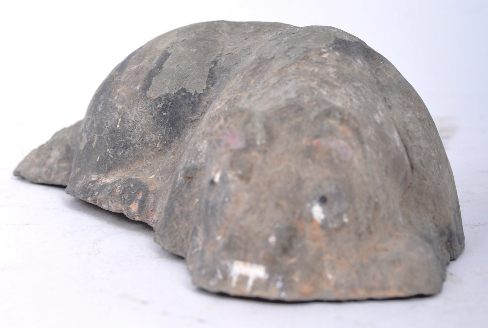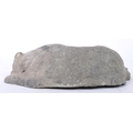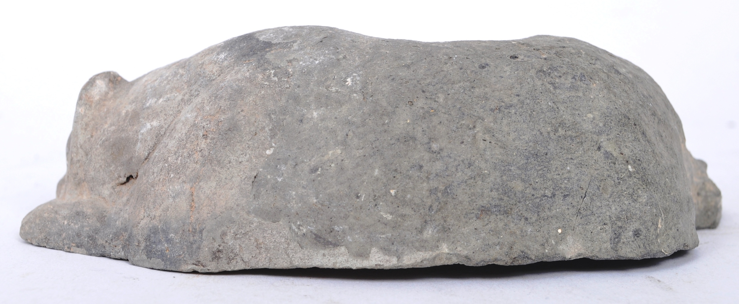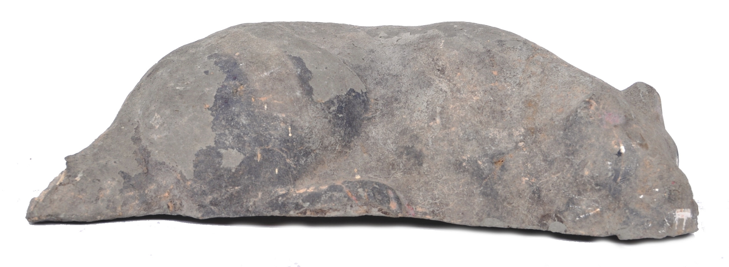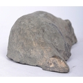 A Tang Dynasty Chinese hand moulded clay earthenware burial funerary figure of a lying dog with painted eyes & nose. Measures approx. 13 x 7cm.