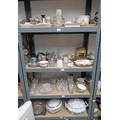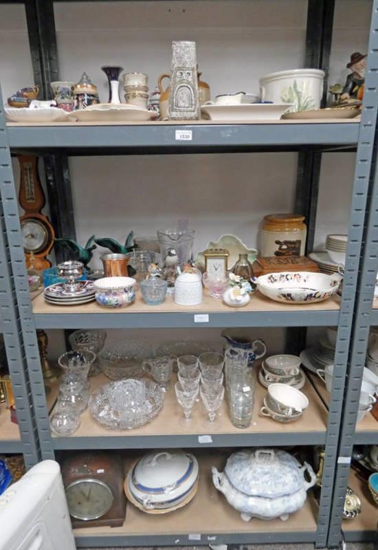 SELECTION OF VARIOUS ITEMS INCLUDING TROIKA VASE BORDER OF FINE ARTS WEST HIGHLAND TERRIER, MANTLE CLOCK, VASES AND OTHERS OVER FOUR SHELVES