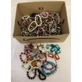 A box of costume jewellery necklaces, bracelets and earrings. To include coloured faux pearl and novelty.