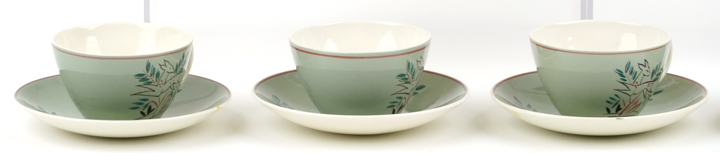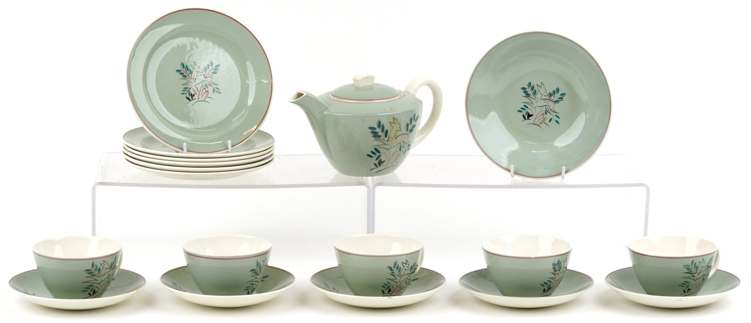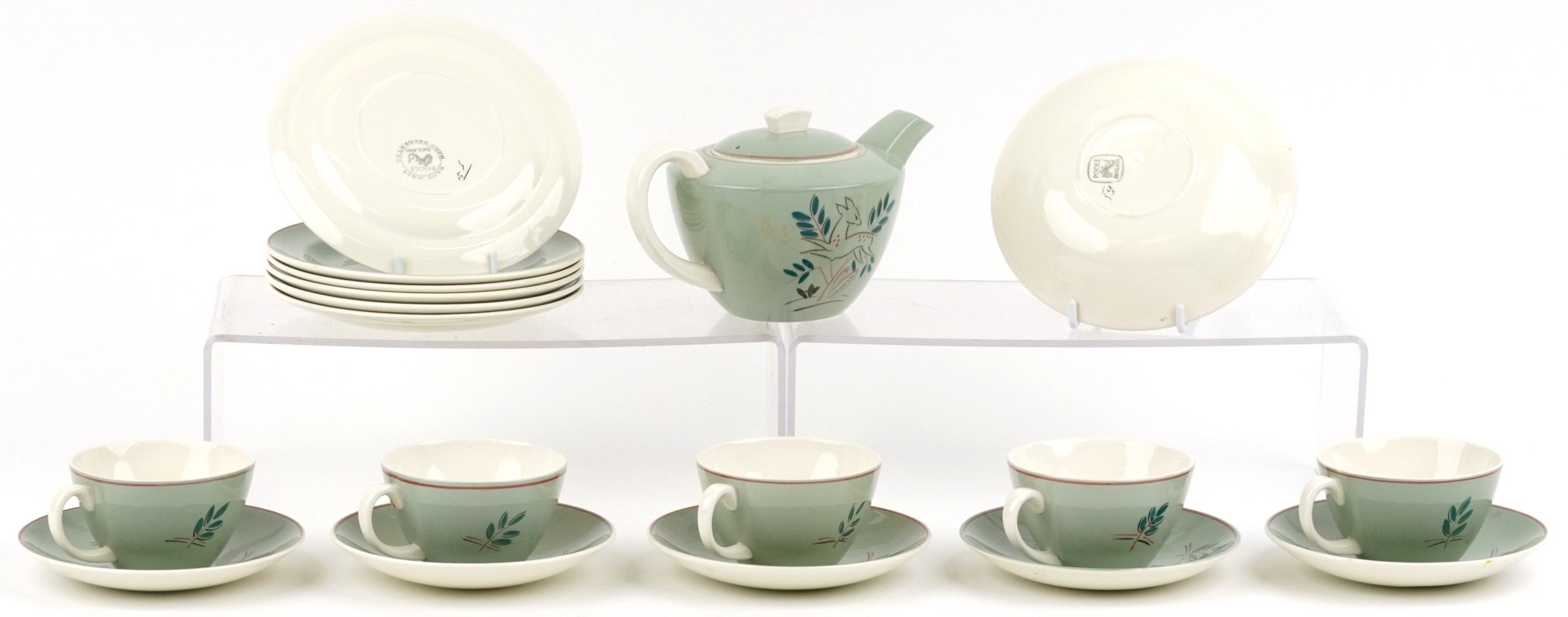 A Poole pottery part tea service comprising cups, saucers, side plates and teapot, the largest 19cm in diameter.
