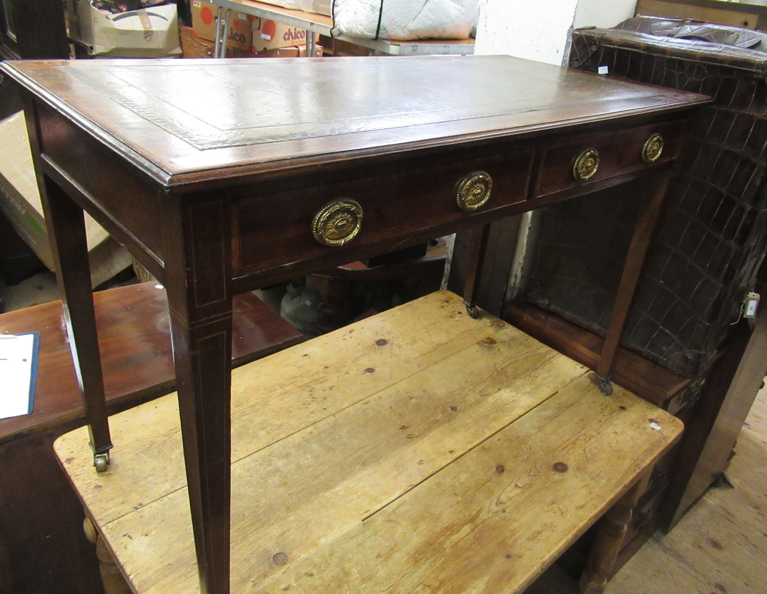 Edwardian mahogany and inlaid writing table, the leather inset top above two drawers raised on square tapering supports