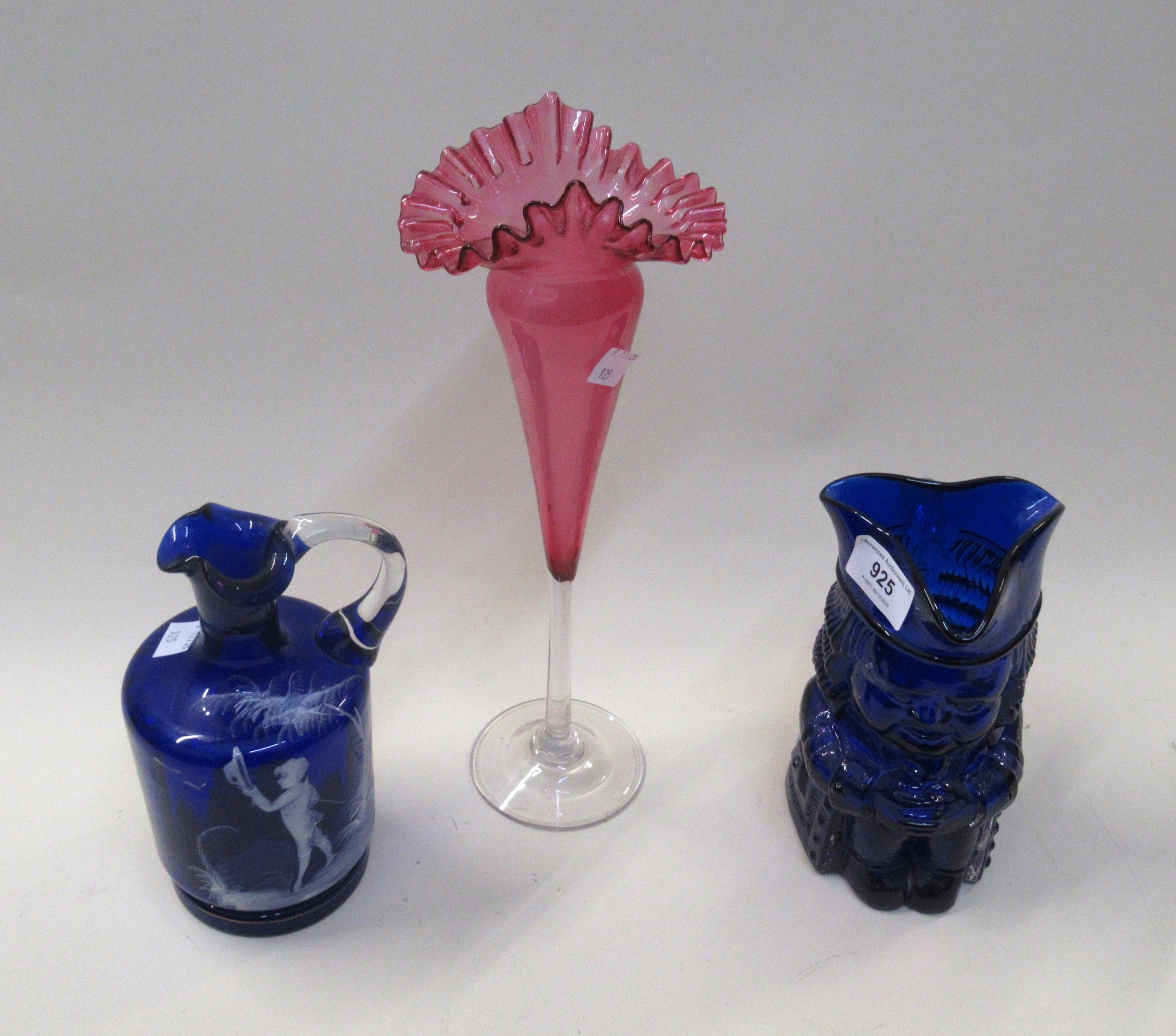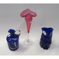 Cranberry glass pedestal vase, a Bristol blue glass Toby jug, together with a Mary Gregory style blue glass jug