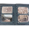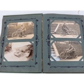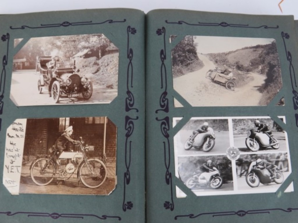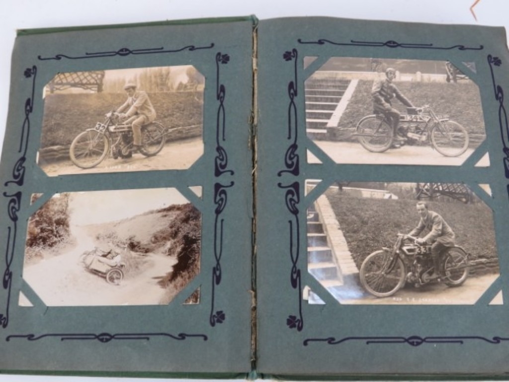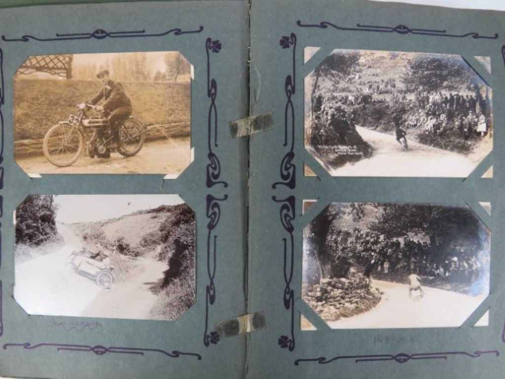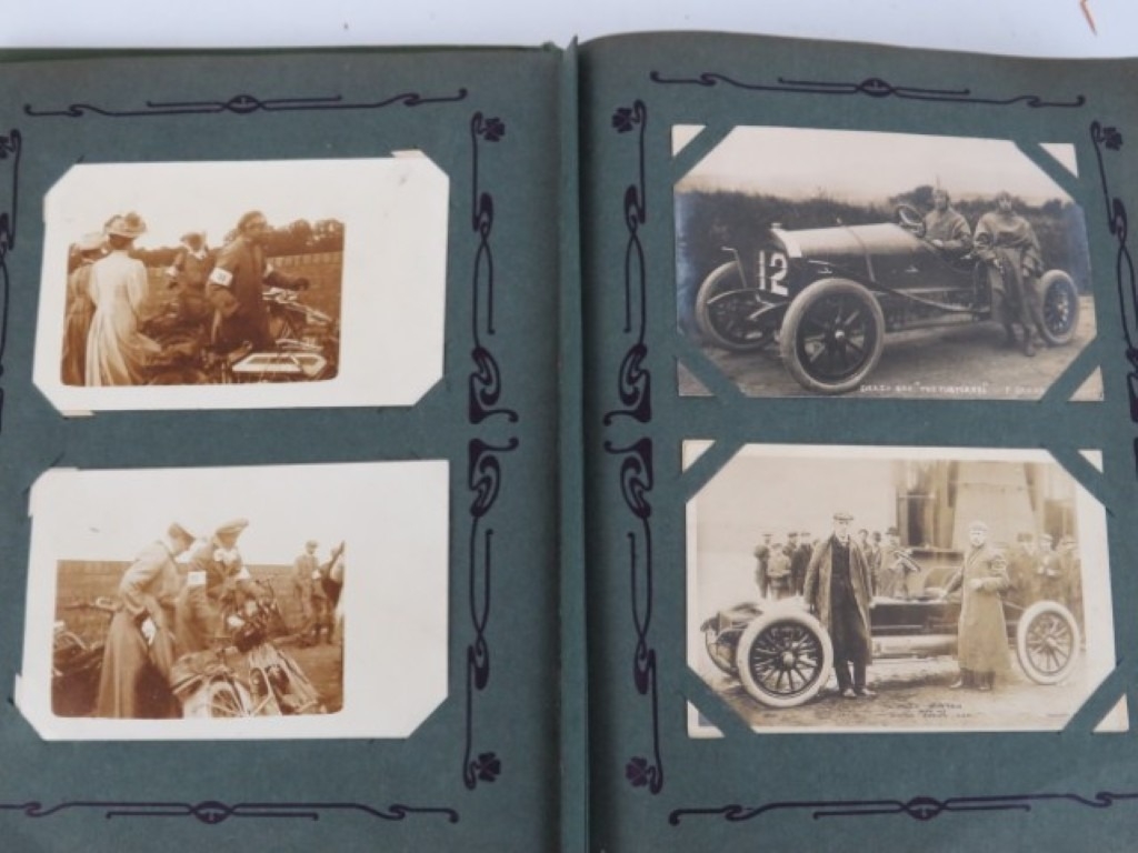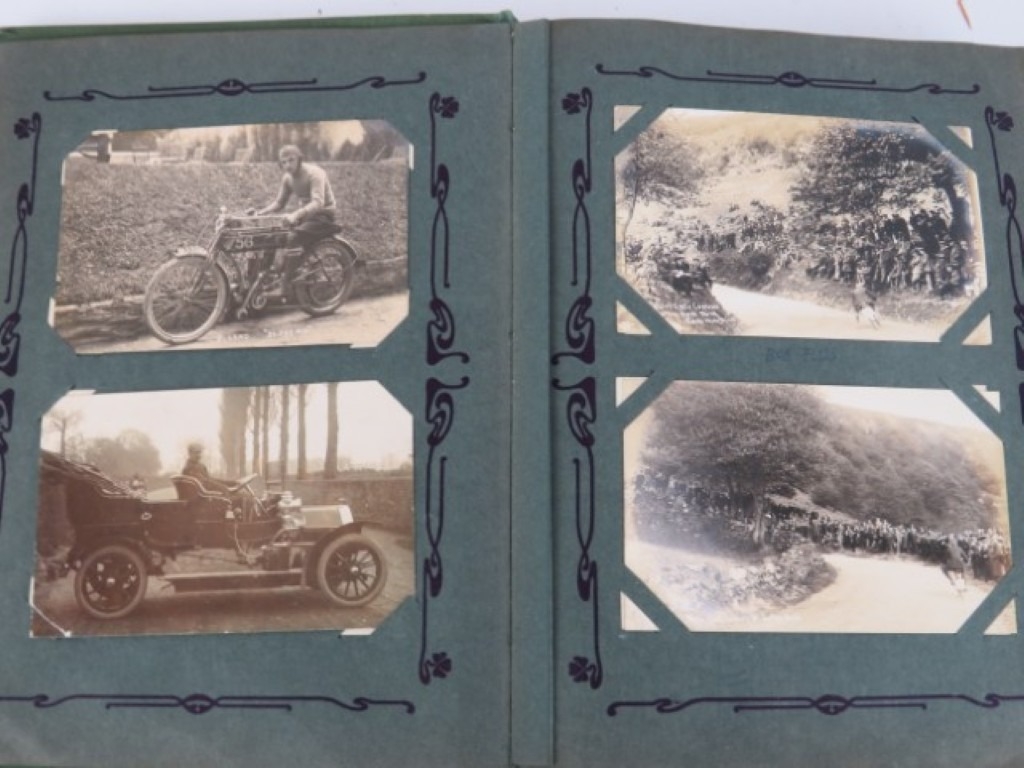 A vintage motorcycle and motorcar photographic postcard album, early 20th century. Comprising a variety of mainly British and Irish racing photographic postcards included with The Isle of Man TT related postcards. (1 volume)
