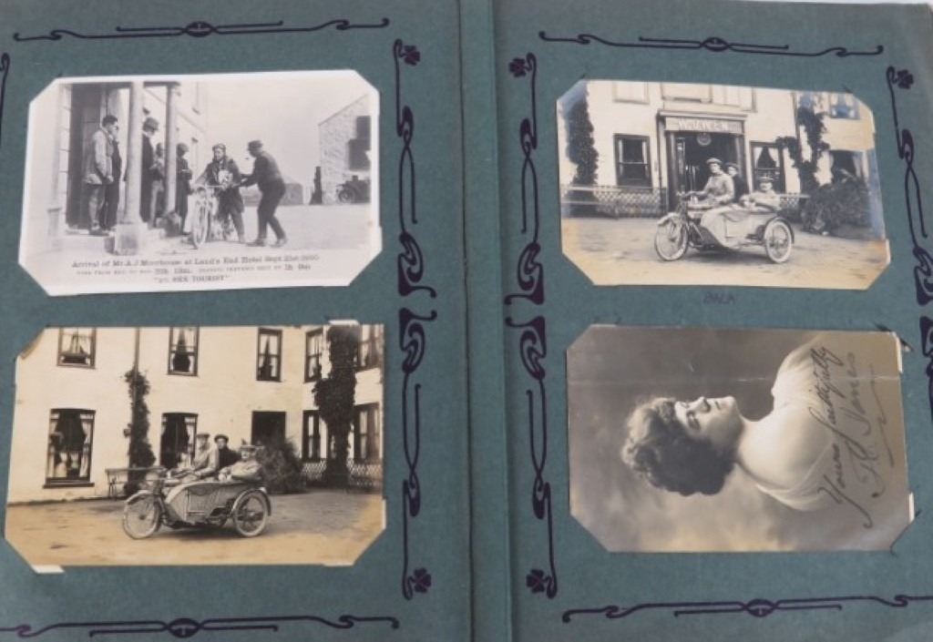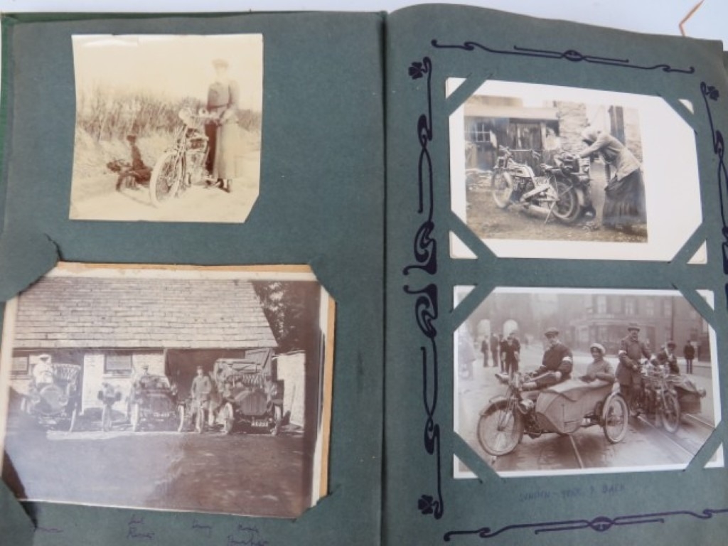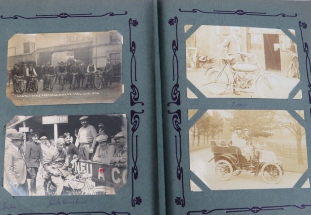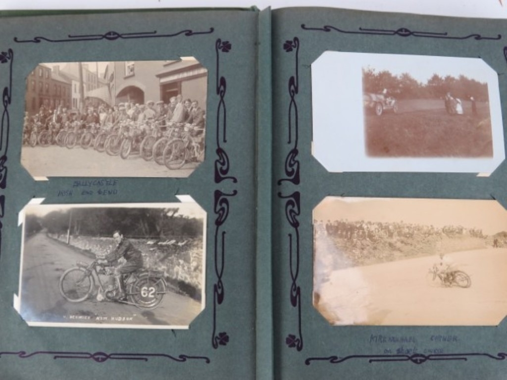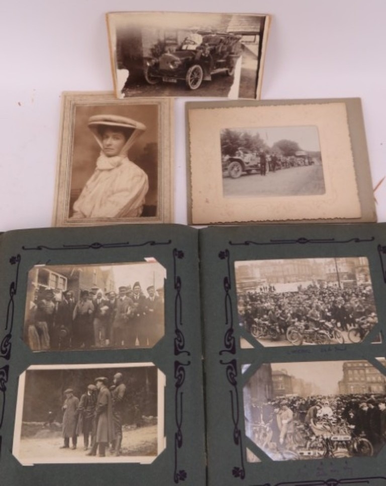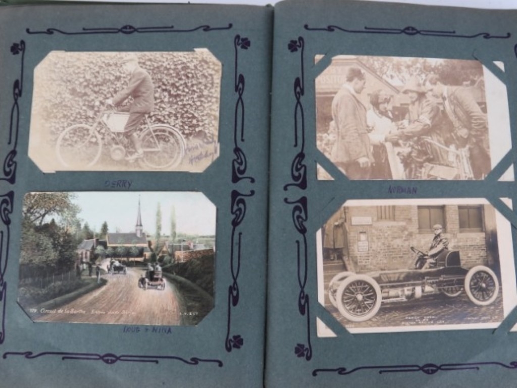 A vintage motorcycle and motorcar photographic postcard album, early 20th century. Comprising a variety of mainly British and Irish racing photographic postcards included with The Isle of Man TT related postcards. (1 volume)