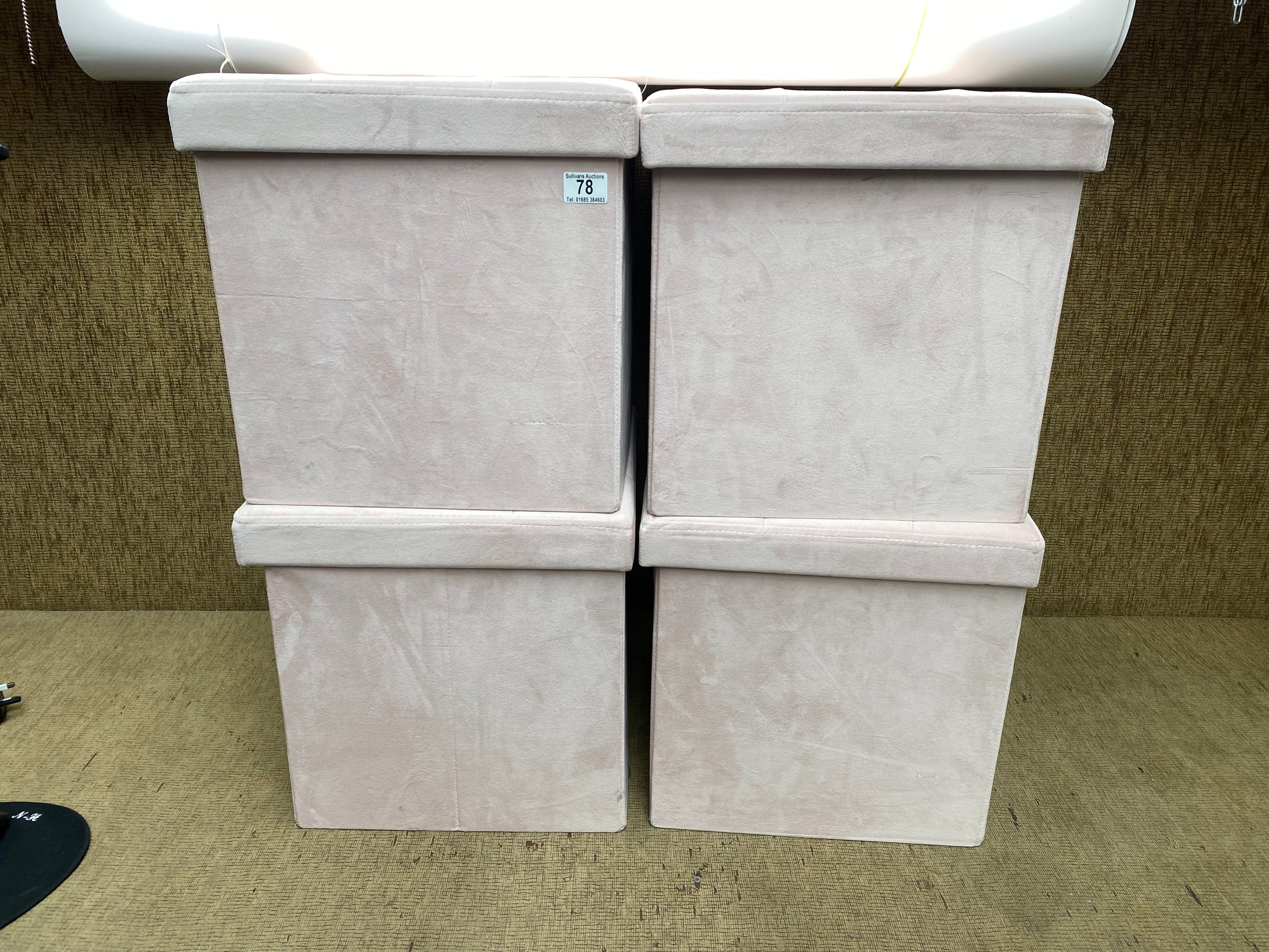 4 square pink fabric storage boxes.