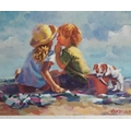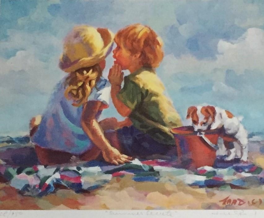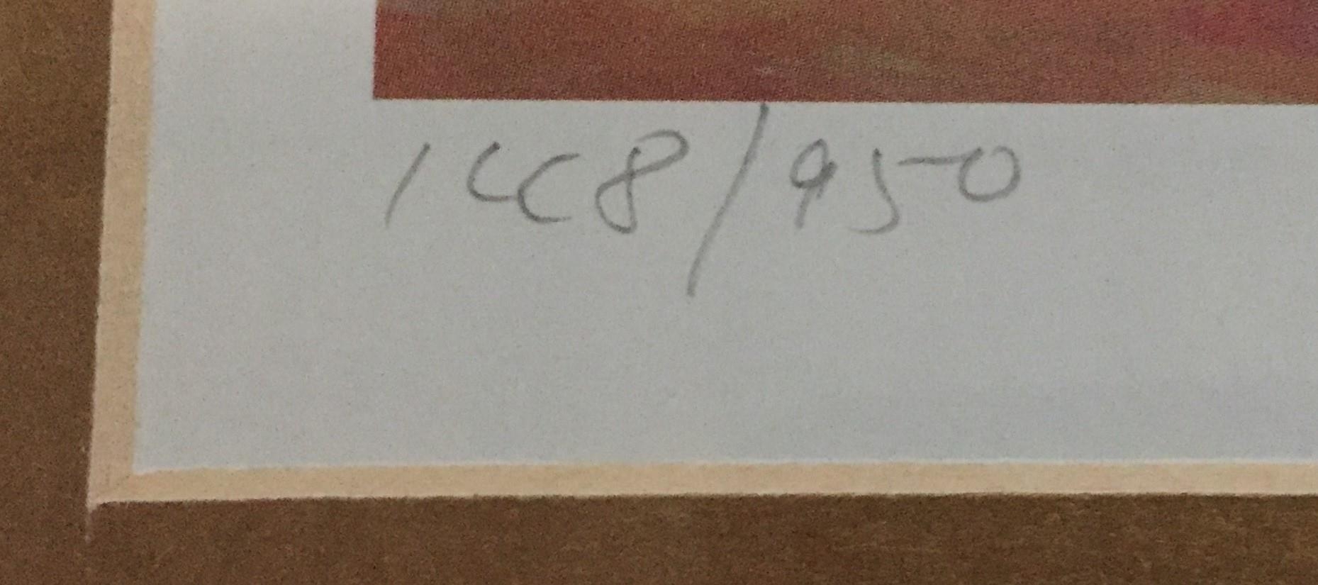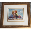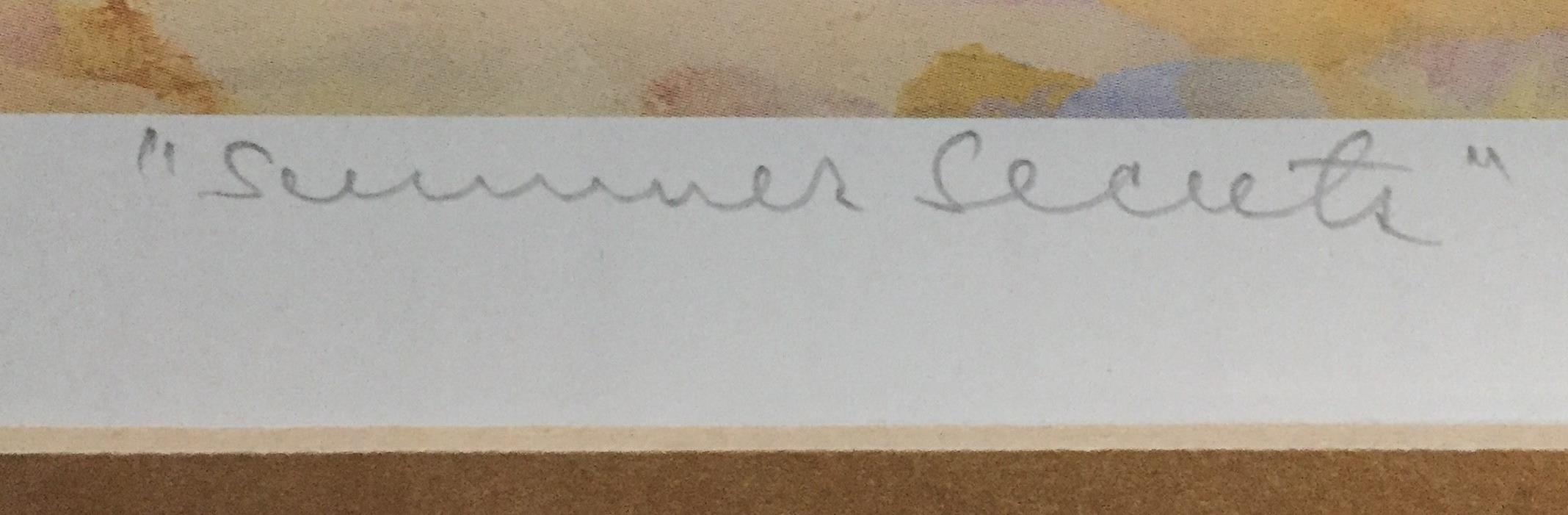 A gilt framed lithograph on paper, entitled ‘Summer Secrets’, by Lucelle Raad (born GB 1942, moving to South Africa in her early twenties & then US once married). Artwork purchased from 'The Fine Art of Cruising & exported to UK in 2007'. Certificate of Authenticity included, suggested retail price $375. Limited edition 148/950. Framed dimensions 47cm x 52cm.