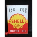A large metal sign advertising Shell Motor Oil, with the brands trademark red and yellow shell, reading "Ask For Shell". H: 70cm X 50cm