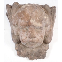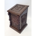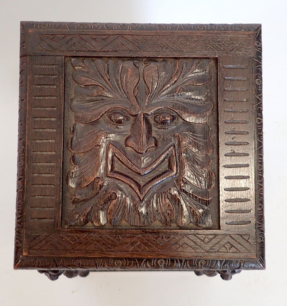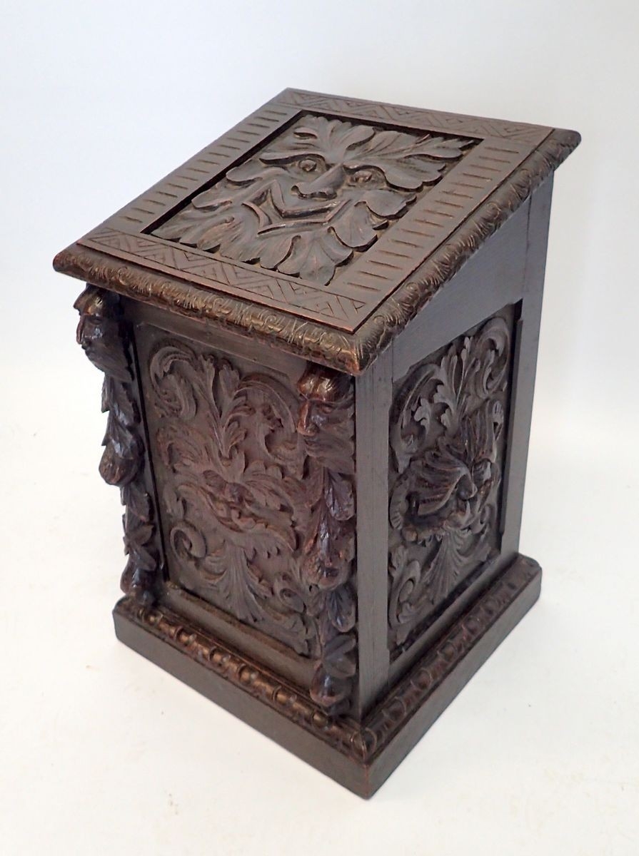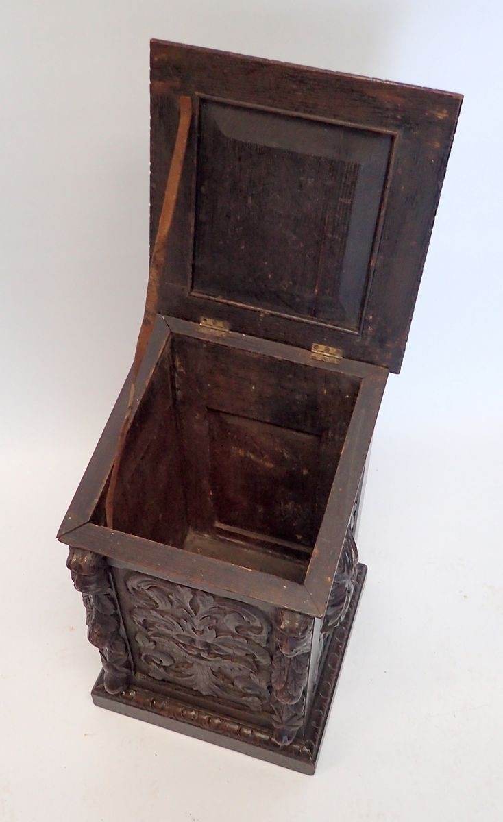 A Victorian carved oak log box made from 17th century panels with mask and foliage decoration, 54cm high x 34cm deep and 34cm wide