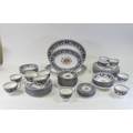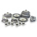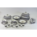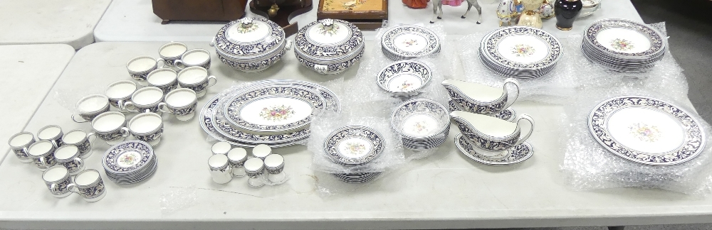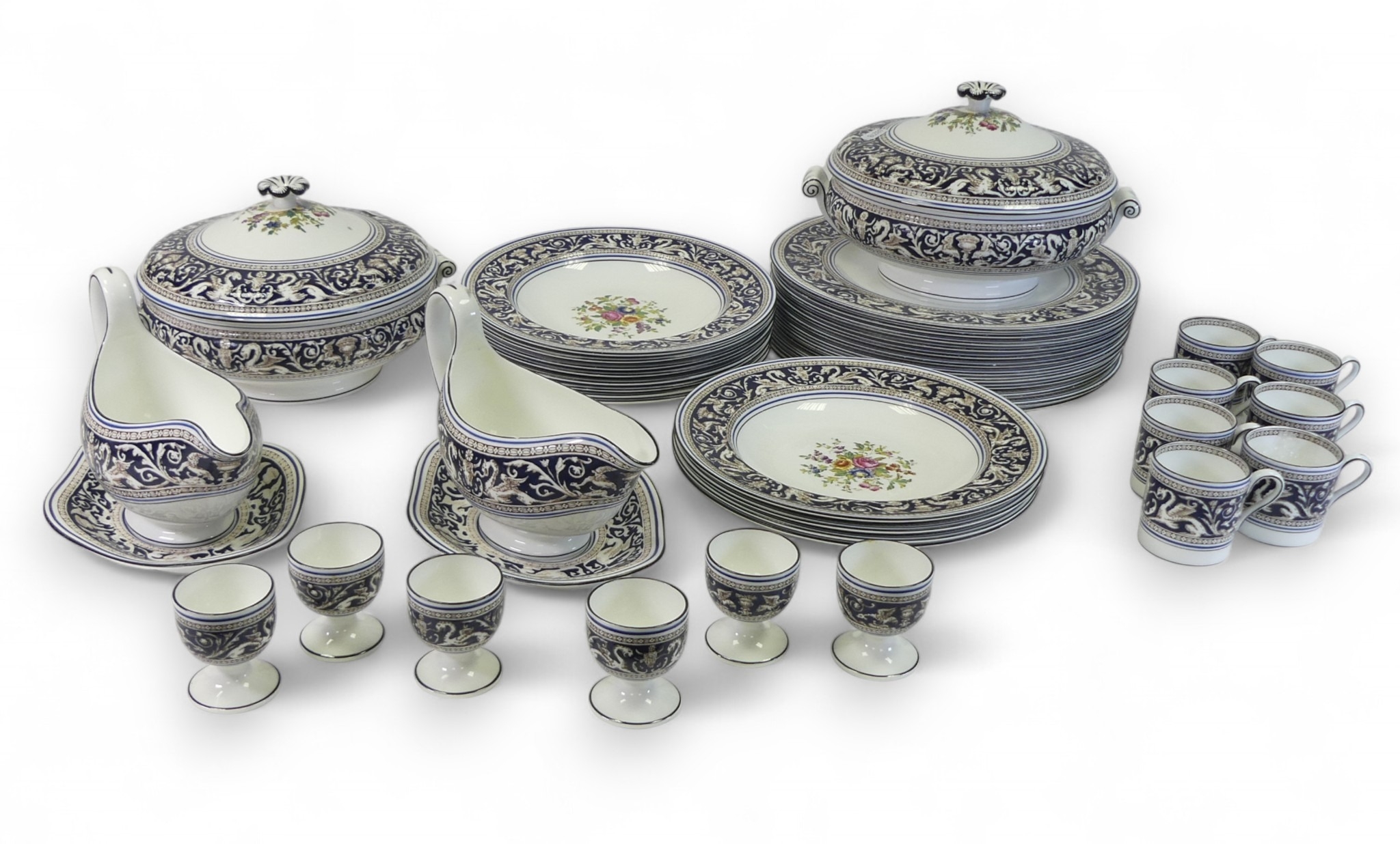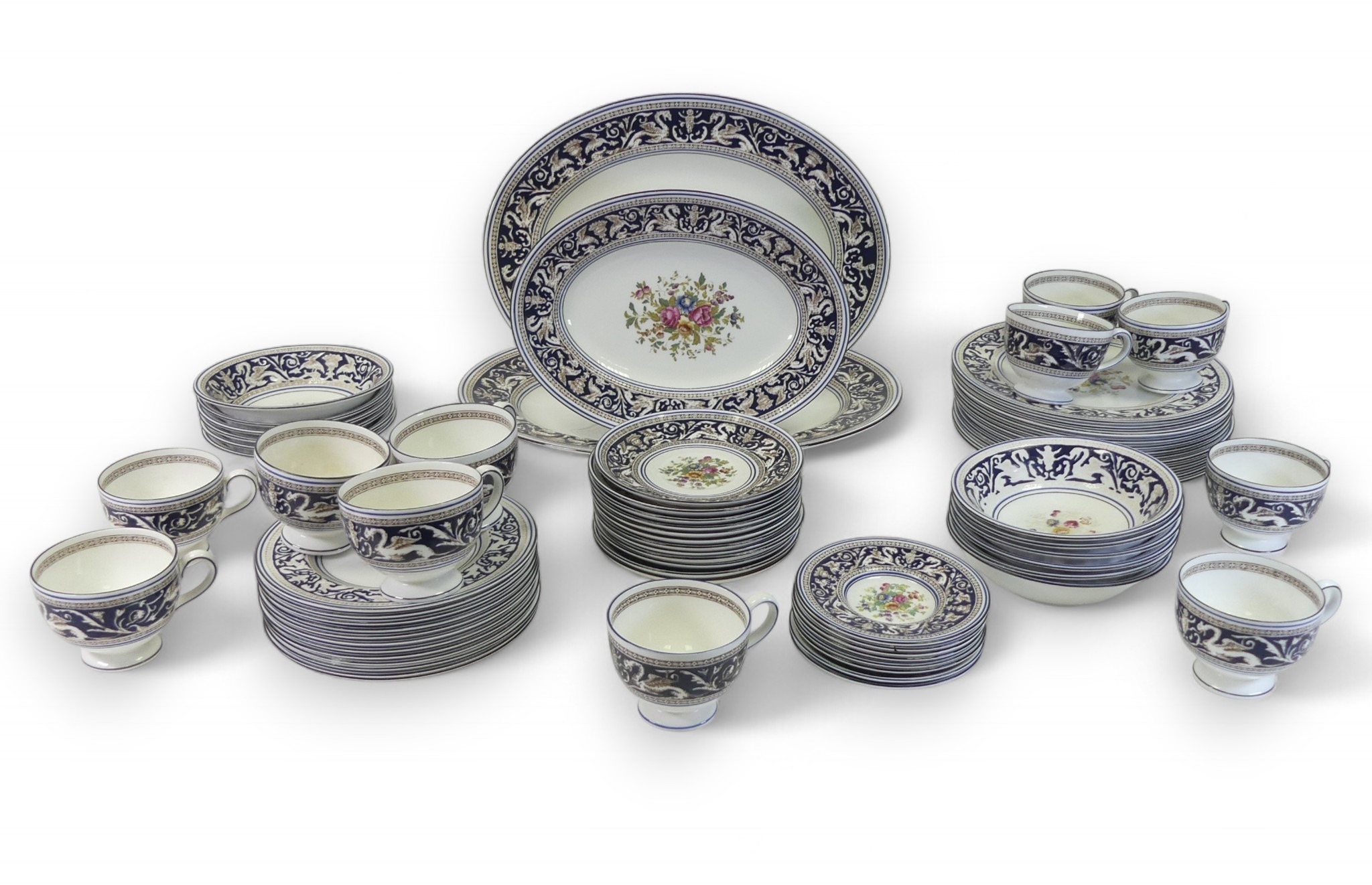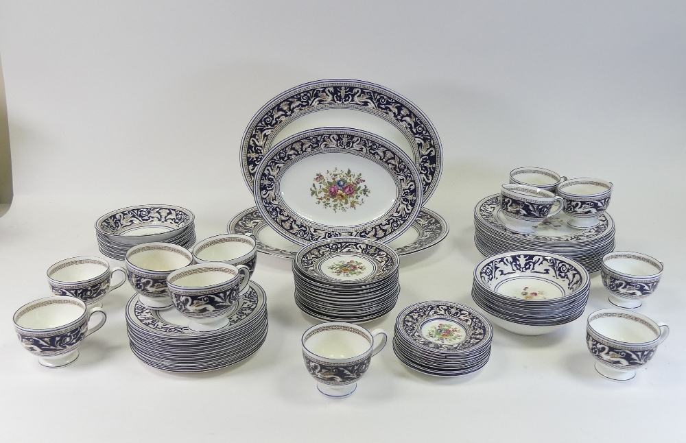 An Extensive Wedgwood dark blue Florentine dinner, tea and coffee set, comprising large oval platters, tureen & cover, various sizes of plates, bowls, tea & coffee cups and saucers etc (some signs of usage with surface scuffing) (4 Trays, 113 Pieces)
