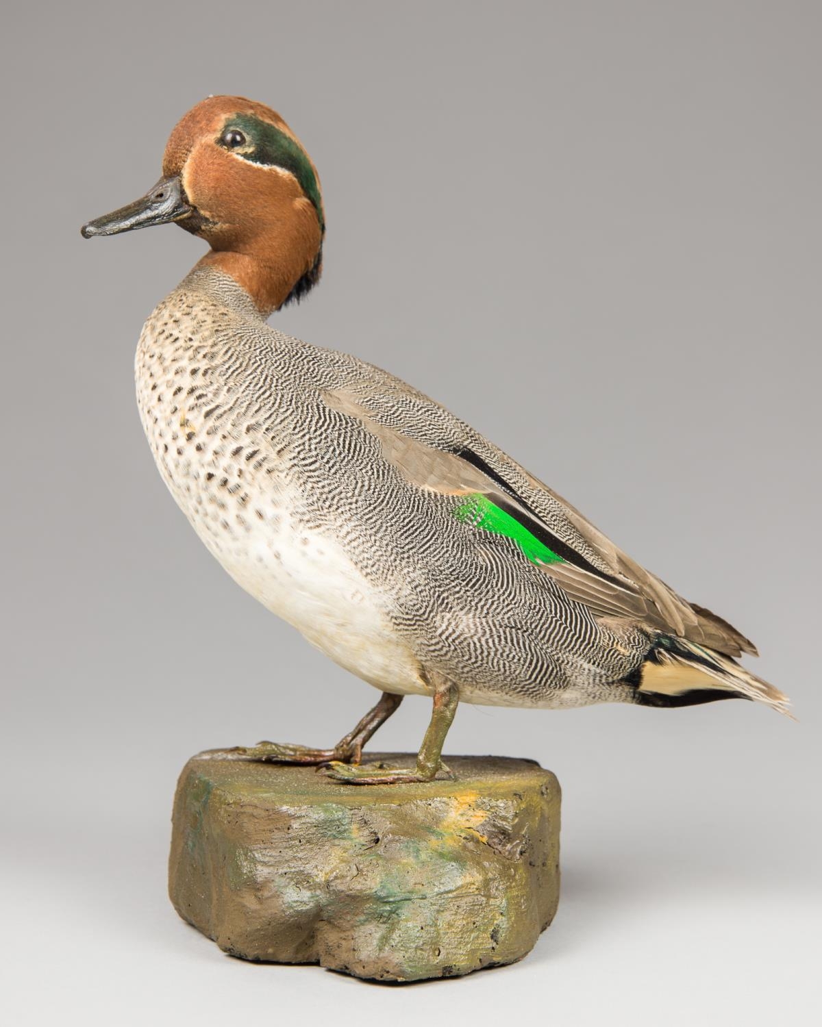 AN EARLY 20TH CENTURY TAXIDERMY TEAL UPON A NATURALISTIC BASE.