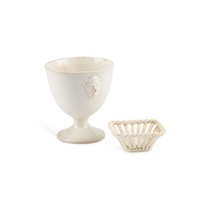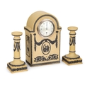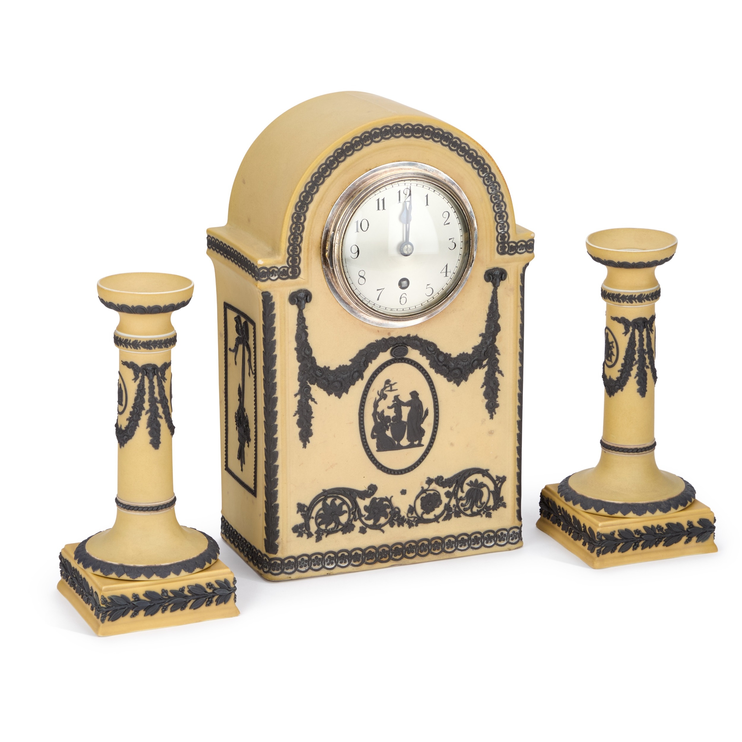 comprising a large clock with an arch-top and a pair of columnar candlesticks with square bases, each piece decorated with floral swags hung from ram's head masks and Classical figural medallions, impressed WEDGWOOD ETRURIA ENGLAND. (3) Clock 33cm high