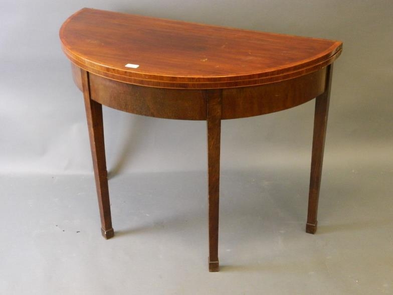 A C19th mahogany demi-lune tea table with satinwood banded top, on square tapering supports and spade feet, 39'' x 20'' x 28'' (AF), Best Bid