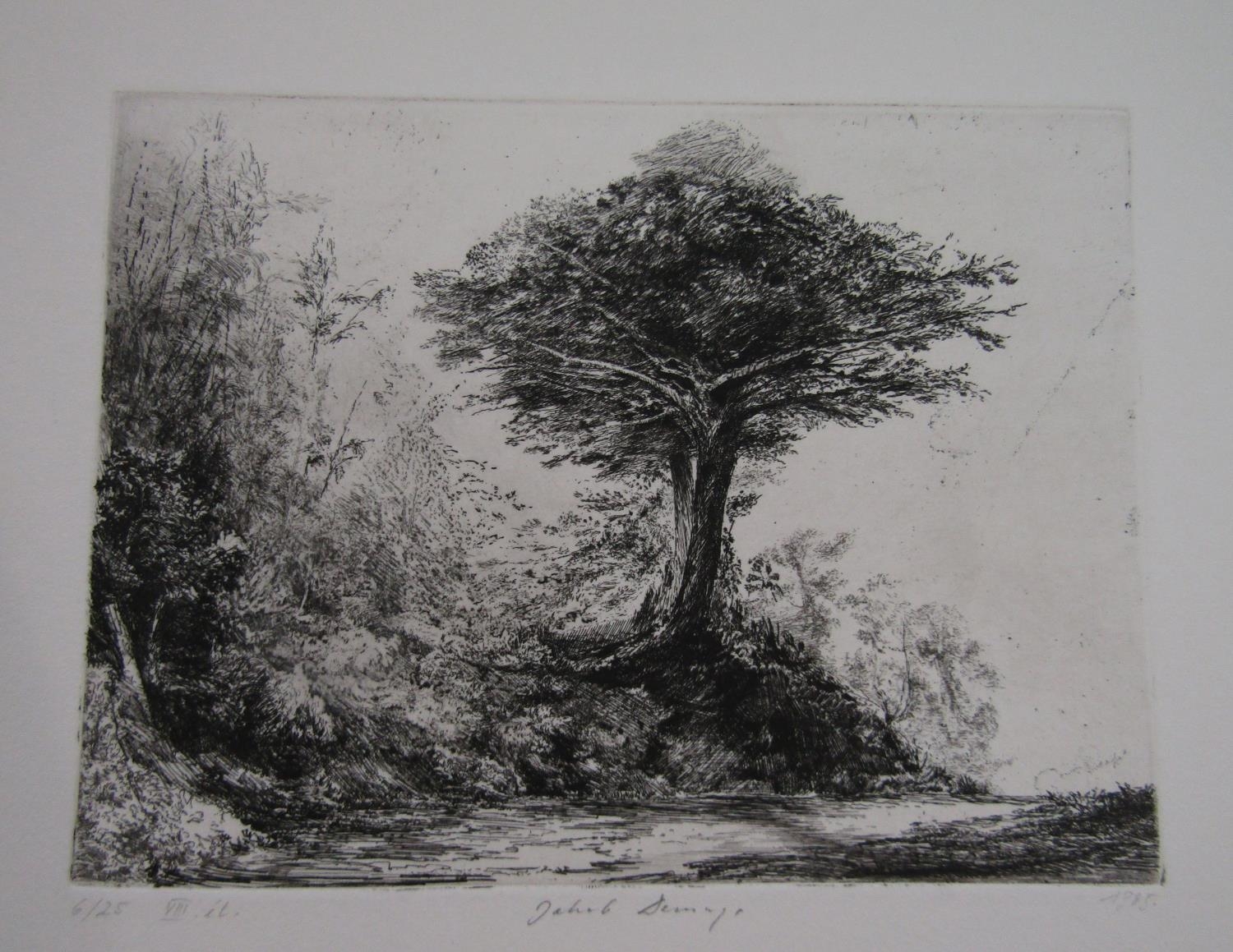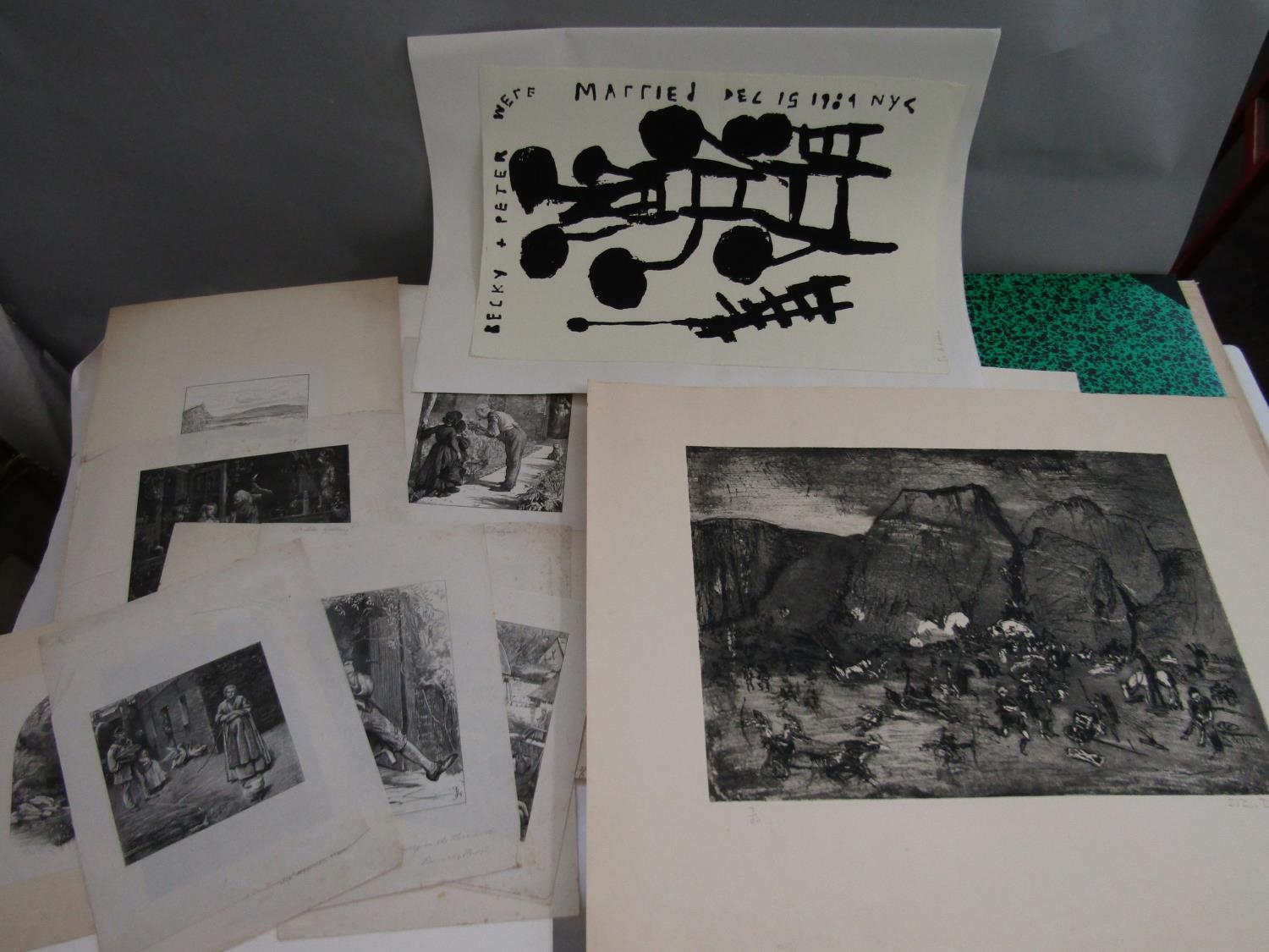 Edward Powis Jones (20th century) - Signed limited edition black and white etching - biblical scene, edition number 7/20, 4 x 62cm approx sheet size, unframed, together with a further quantity of black and white etchings and engravings etc, including a black and white lithograph attributed to Albert Belleroche (1864-1944) - Still life with jardiniere, signed with initals AB, 22.5 x 15.5cm approx visible sheets size, Philip Gronau (20th century) - Landscape with figures, pastel on paper, 34.5 x 25cm approx, etc, all unframed in portfolio