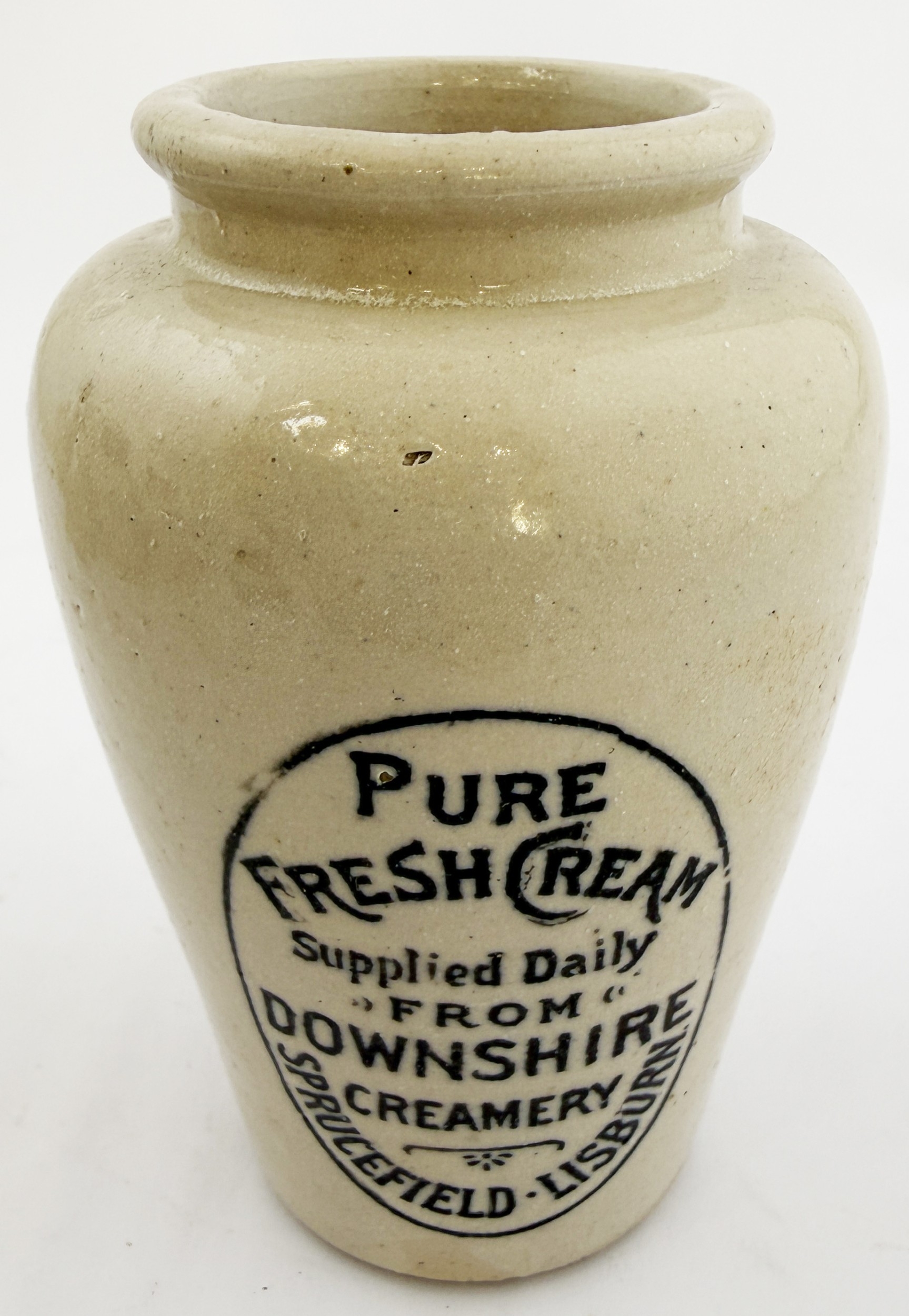 DOWNSHIRE CREAMERY LISBURN CREAM POT. 4.25ins. All-white, black print from the Northern Ireland city of Lisburn. Quality copperplate print as opposed to rubber stamp variety. An attractive pot in excellent condition. Hugh Davidson collection