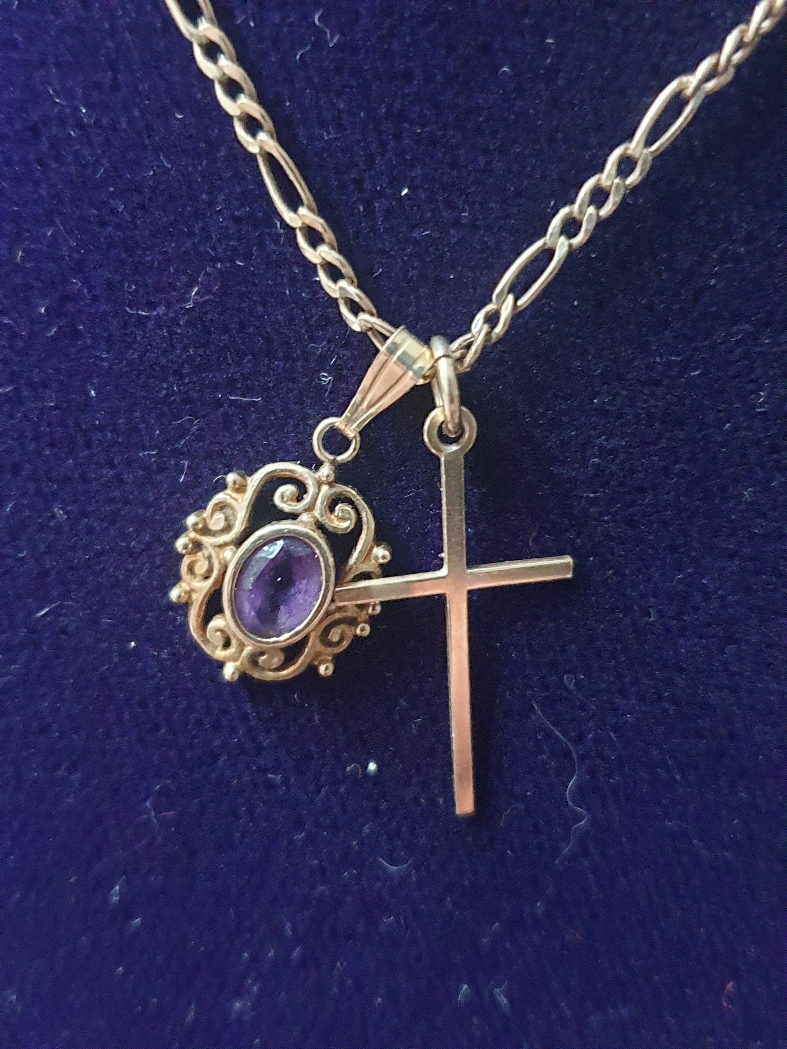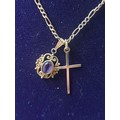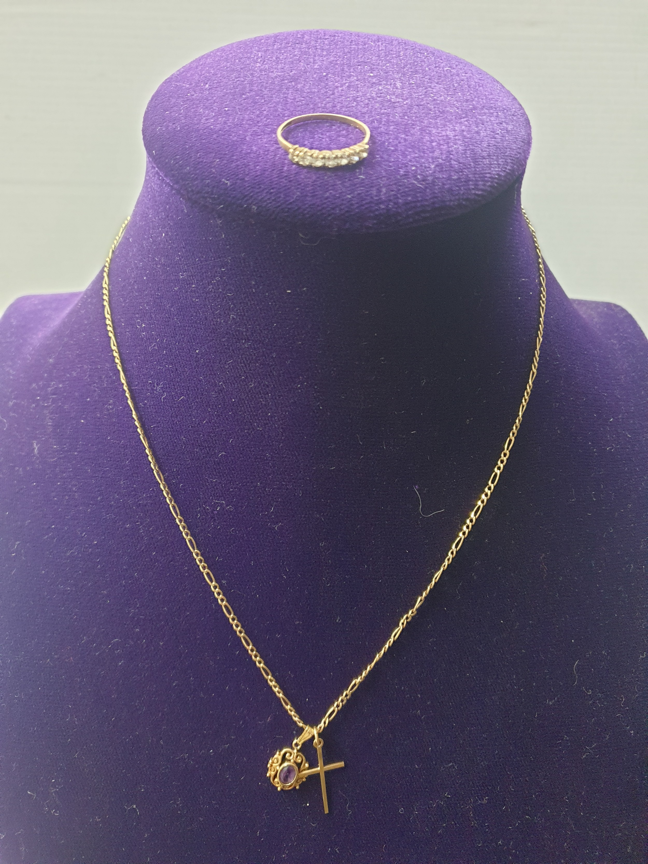 9ct Gold Chain With Amethyst 9ct Pendant 9ct Cross And 9ct CZ Ring.