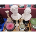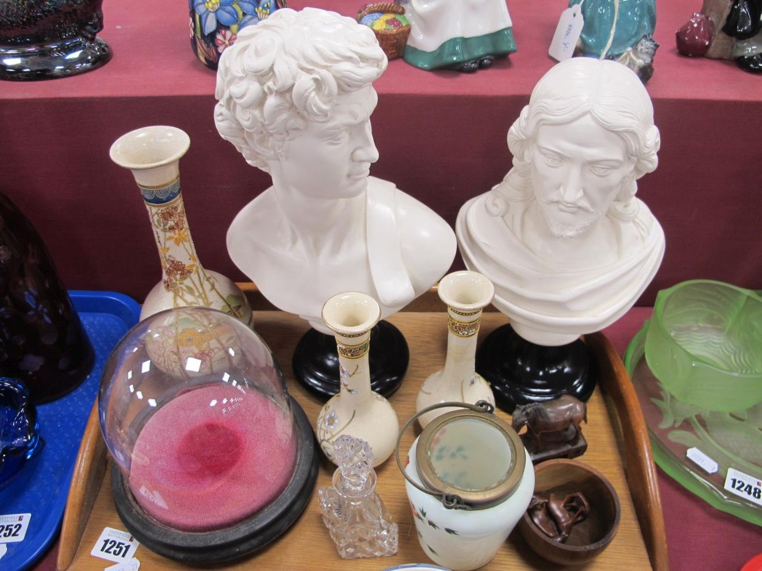 A Pair of Classical Male Plaster Busts, glass display dome on base 15cm high. Japanese vases, etc:- One Tray.