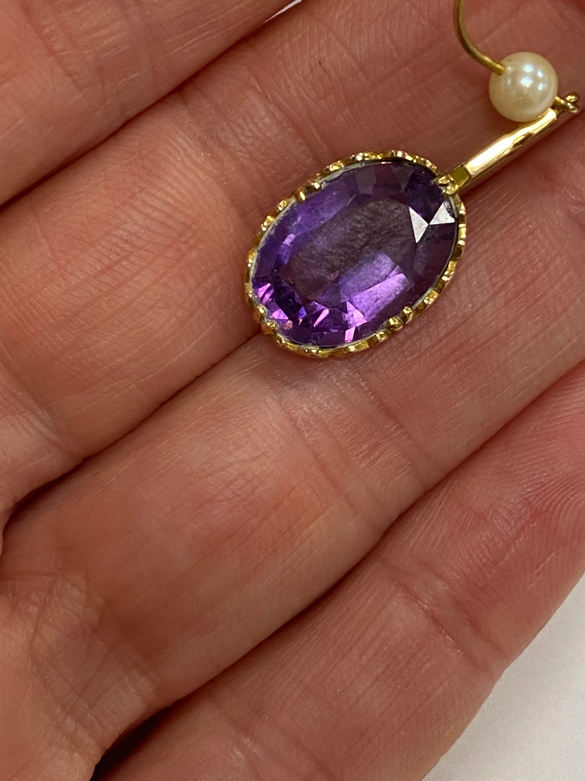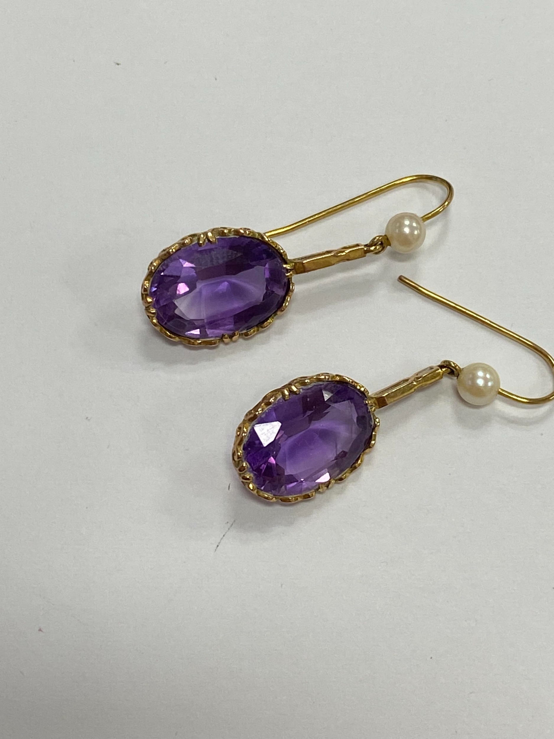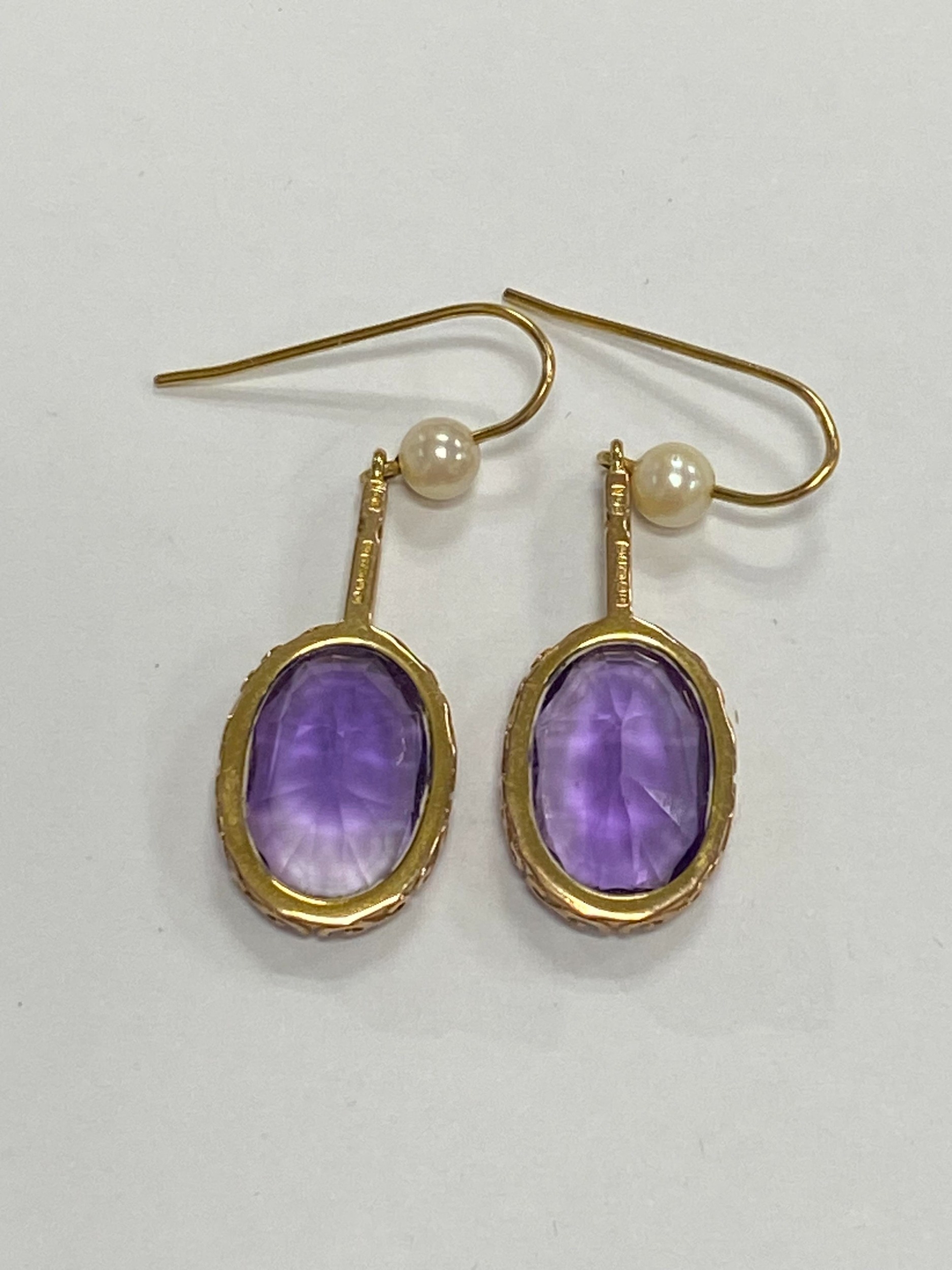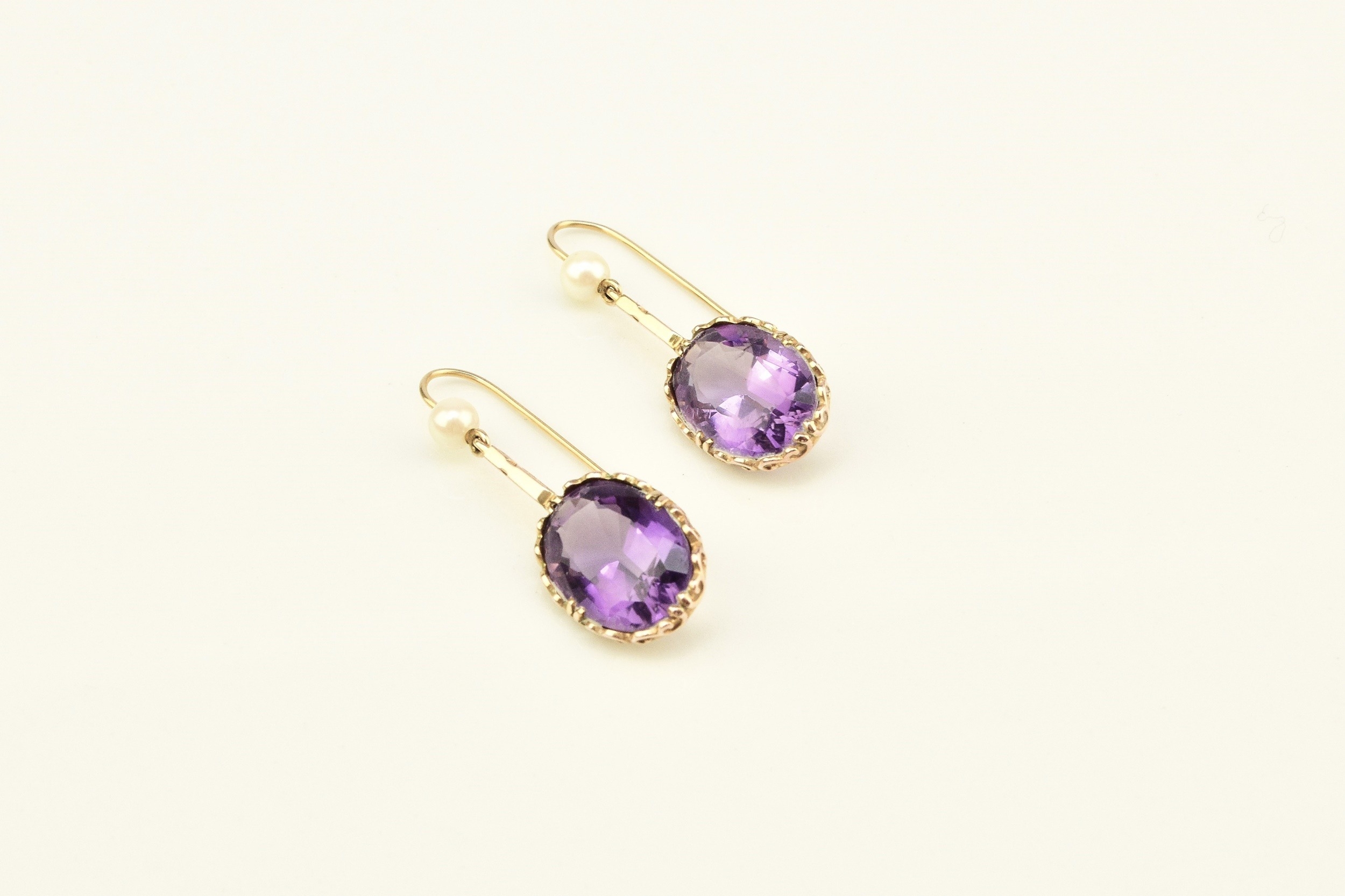 A pair of 9ct gold amethyst and cultured pearl ear pendants, each designed as a single oval mixed cut amethyst claw set in yellow gold and suspended from bar mounted with cultured pearl set hook, 30mm long (pearl to base of amethyst), total weight approx 3.9g Condition:Hallmarked London 1986, amethysts each measure approx 13mm x 9.5mm x 6.3mm deep, general wear but no significant visible damage, refer to images