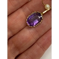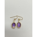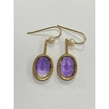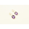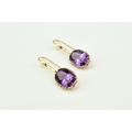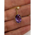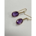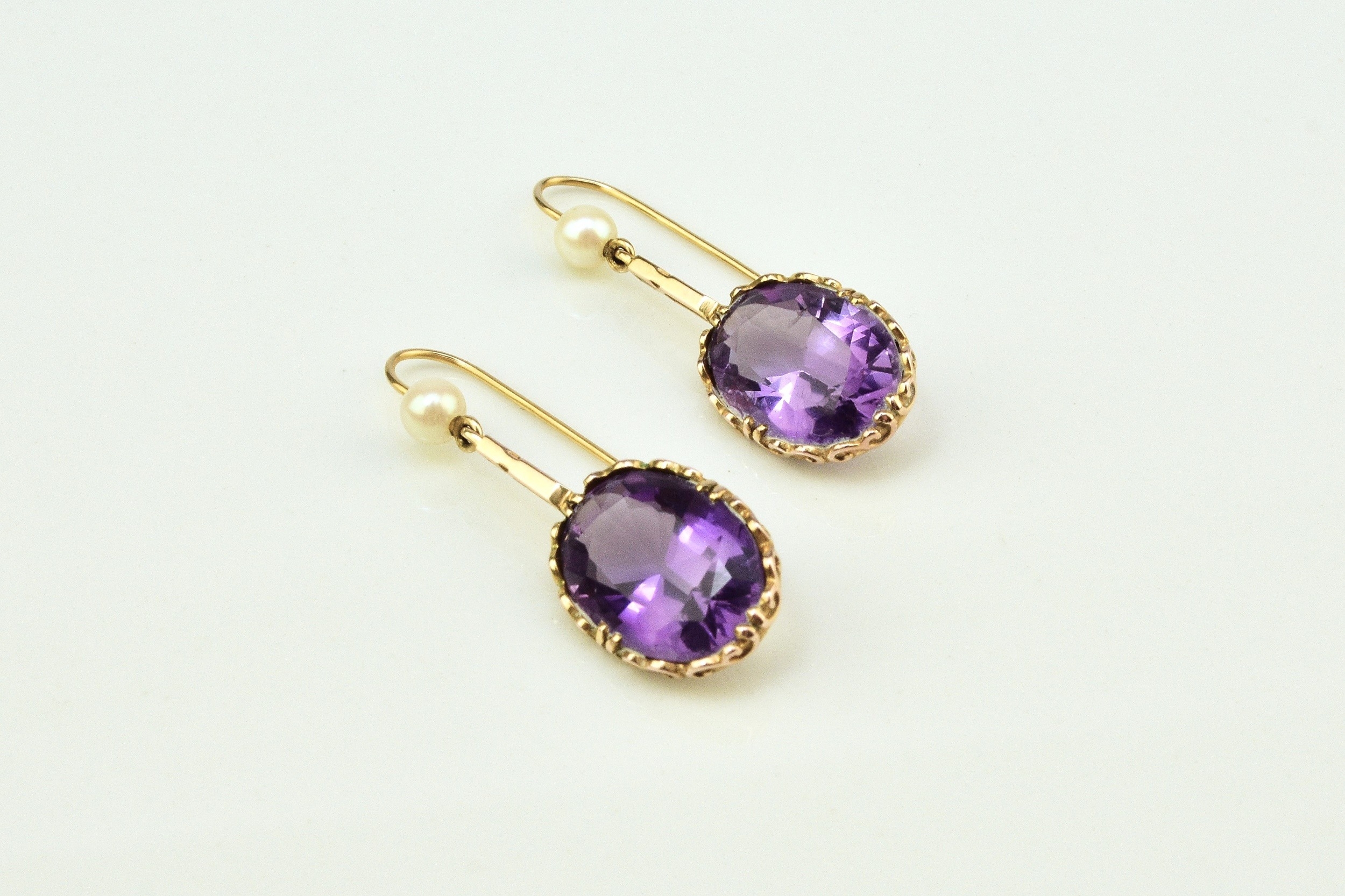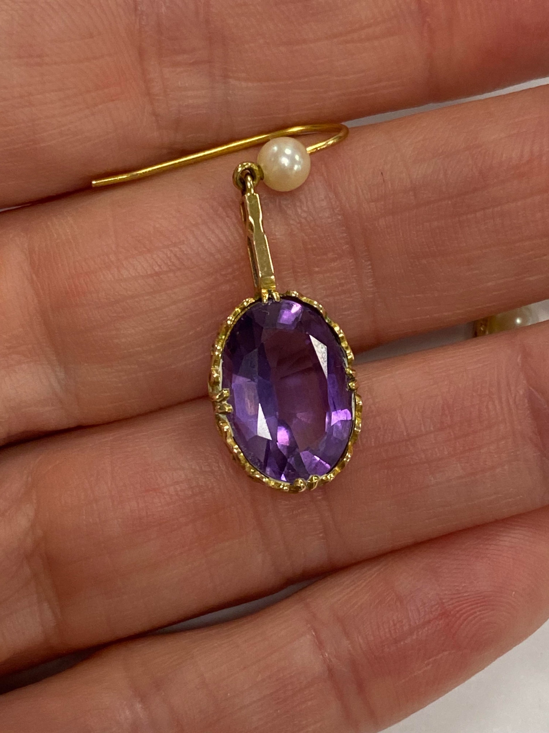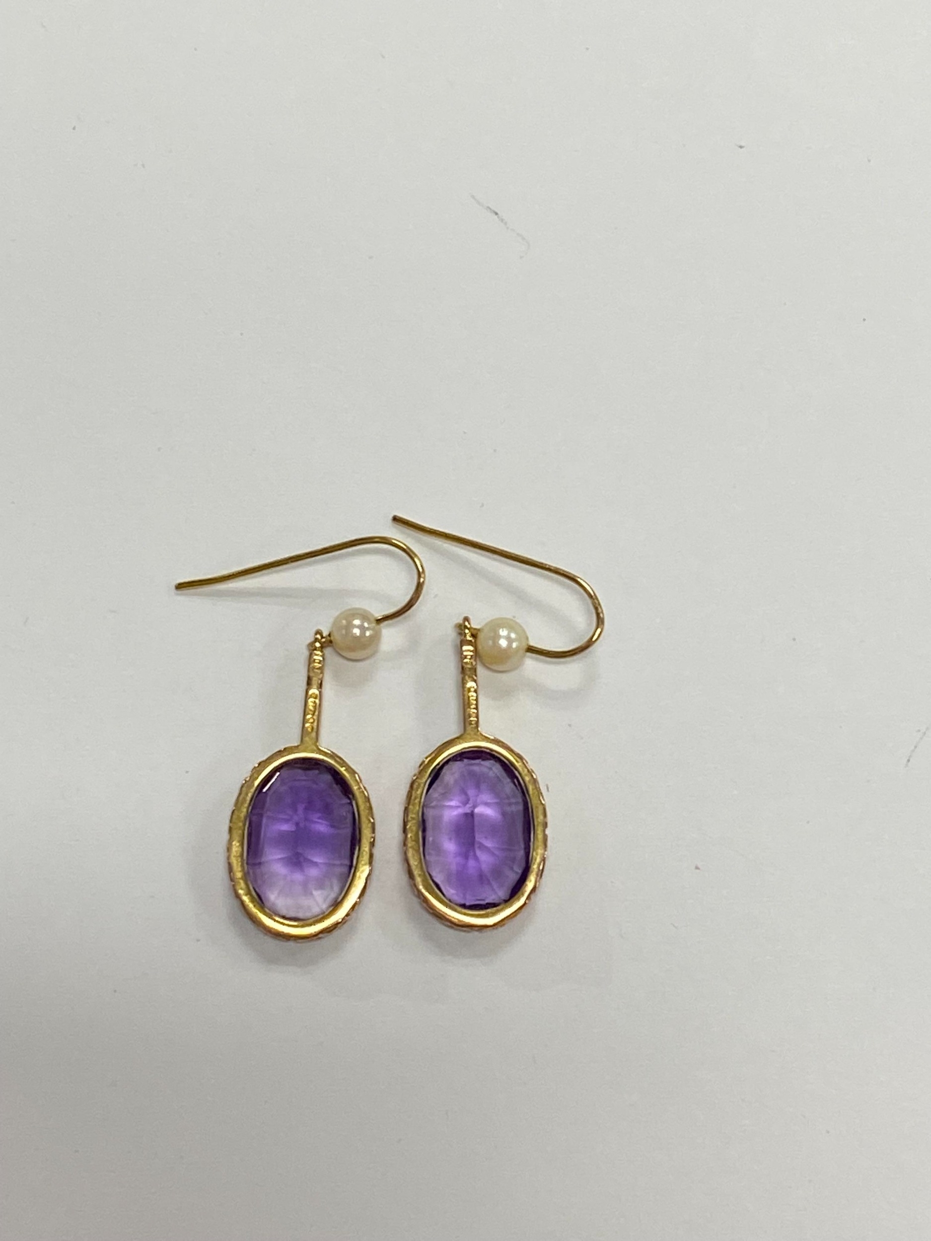 A pair of 9ct gold amethyst and cultured pearl ear pendants, each designed as a single oval mixed cut amethyst claw set in yellow gold and suspended from bar mounted with cultured pearl set hook, 30mm long (pearl to base of amethyst), total weight approx 3.9g Condition:Hallmarked London 1986, amethysts each measure approx 13mm x 9.5mm x 6.3mm deep, general wear but no significant visible damage, refer to images